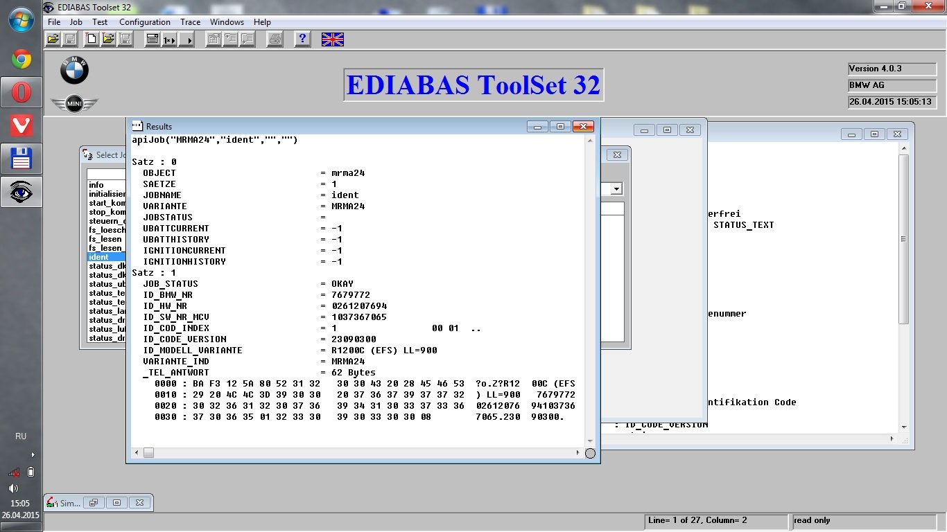 Для того, что б работать с конкретным блоком, надо в Tool32 загрузить описание этого блока в формате PRG файла (собственно Rheingold делает тоже самое, только сам, чтоб убедиться в этом посмотрите его лог в Rheingold\Logs\TesterGui.log). В папке EDIABAS нужного для Мотроника файла нет, зато он есть у Rheingold (папка Rheingold\Ecu). Файл для Мотроника 2.4 mrma24.prg. Его надо скопировать в папку EDIABAS\Ecu. Если нужны другие блоки, смотрим лог Rheingold и копируем нужные файлы.