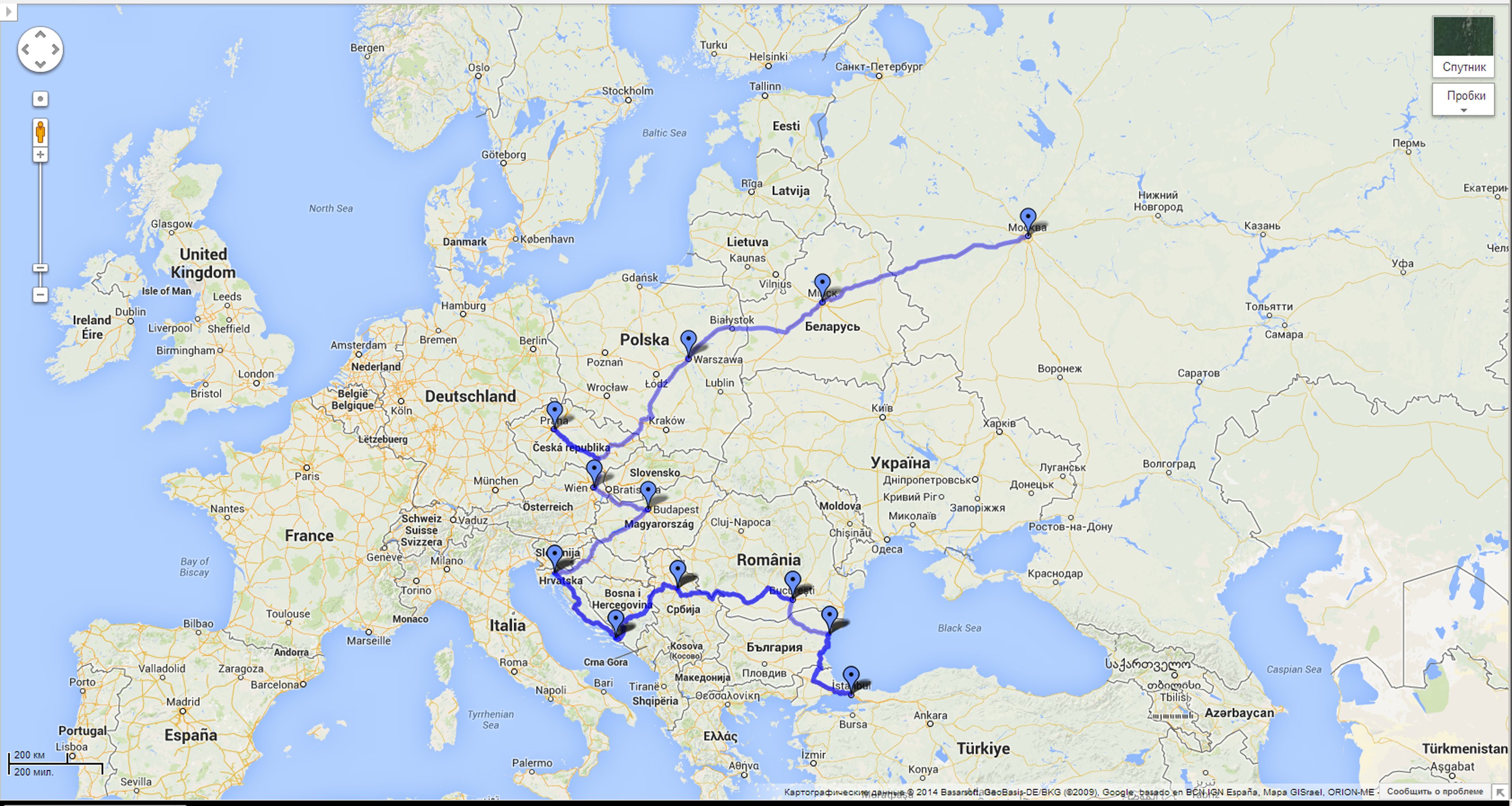 Туда: Москва (Россия)-Минск (белоруссия)-Варшава (Польша)-Прага (Чехия)-Вена (Австрия)-Будапешт (Венгрия)-побережье Хорватии-Белград (Сербия)-Бухарест (румыния)-Варна (болгария)-Стамбул (Турция)