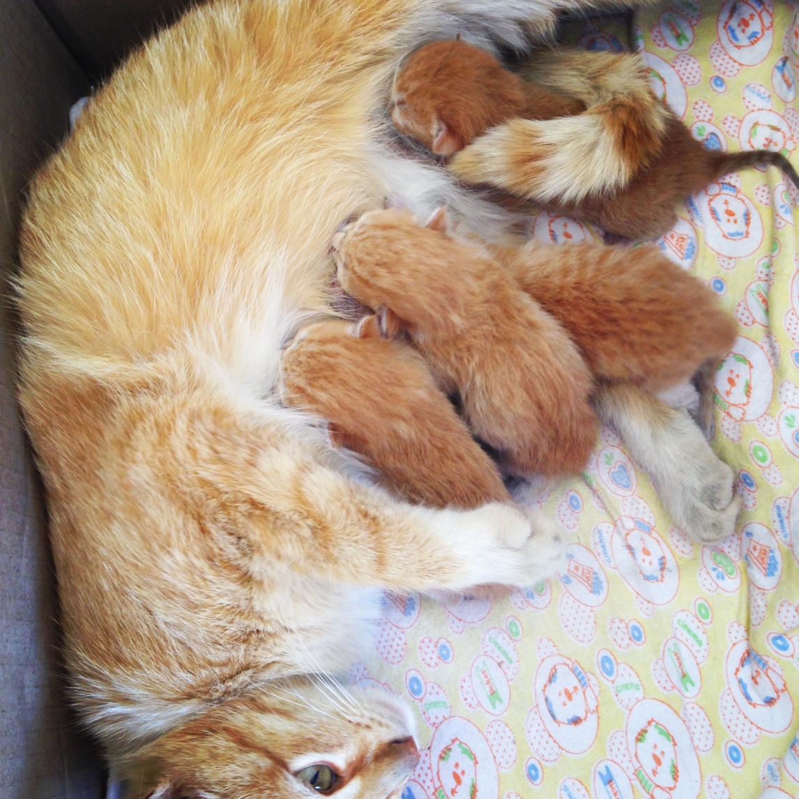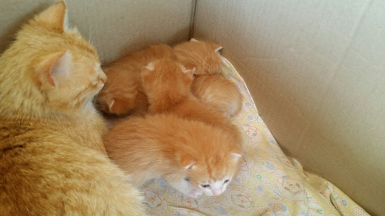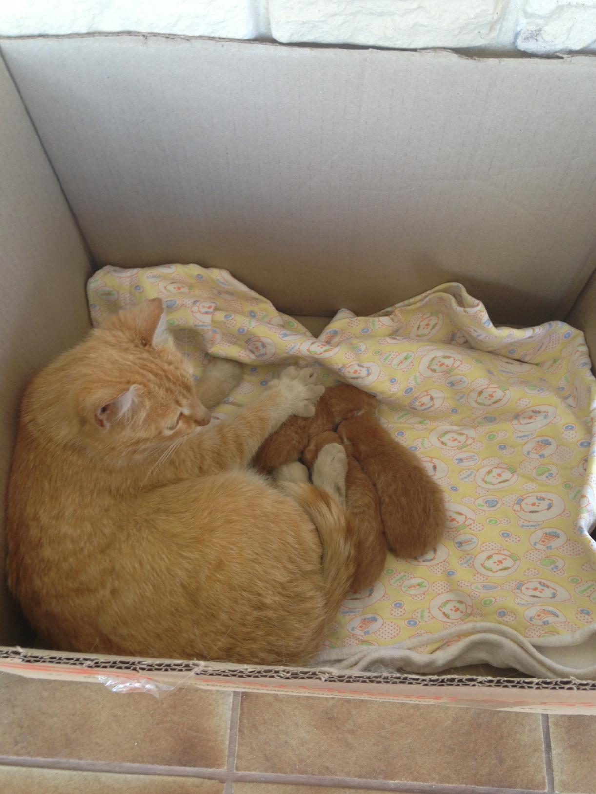 За сутки малыши оклемались и мамашка приняла жилье, котят не утаскивает.