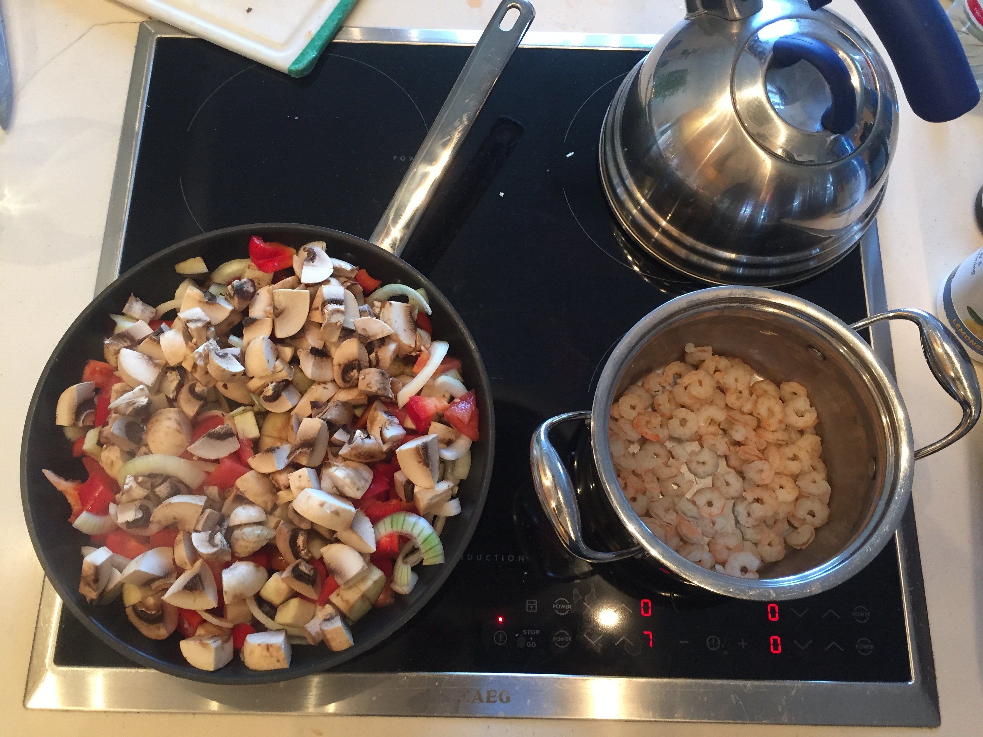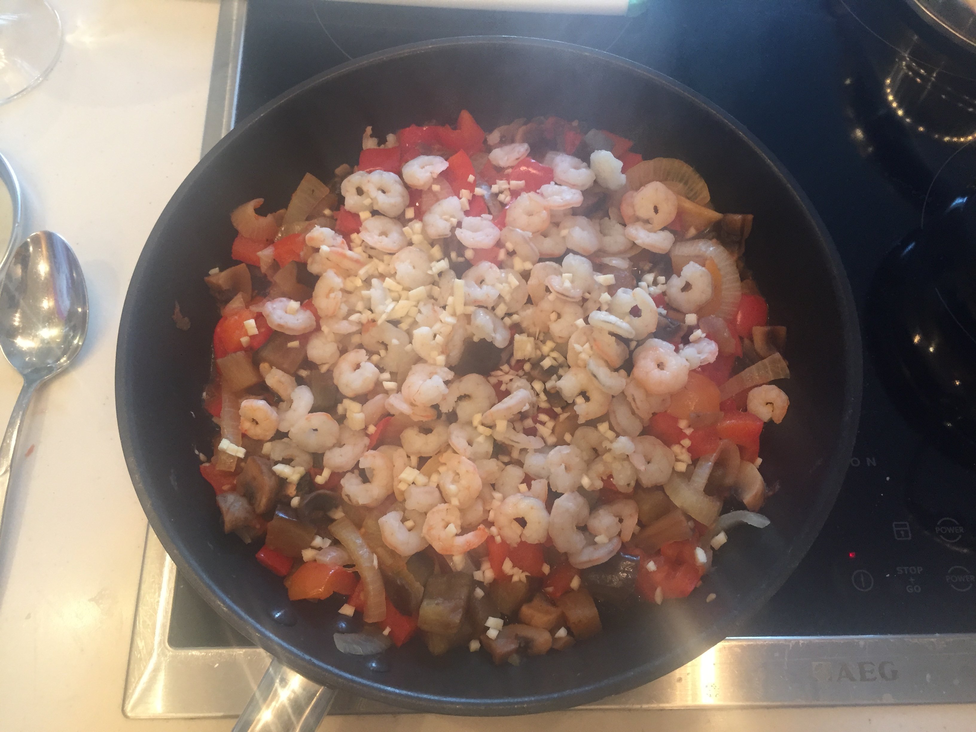 Пока овощи жарятся, отвариваем креветки.