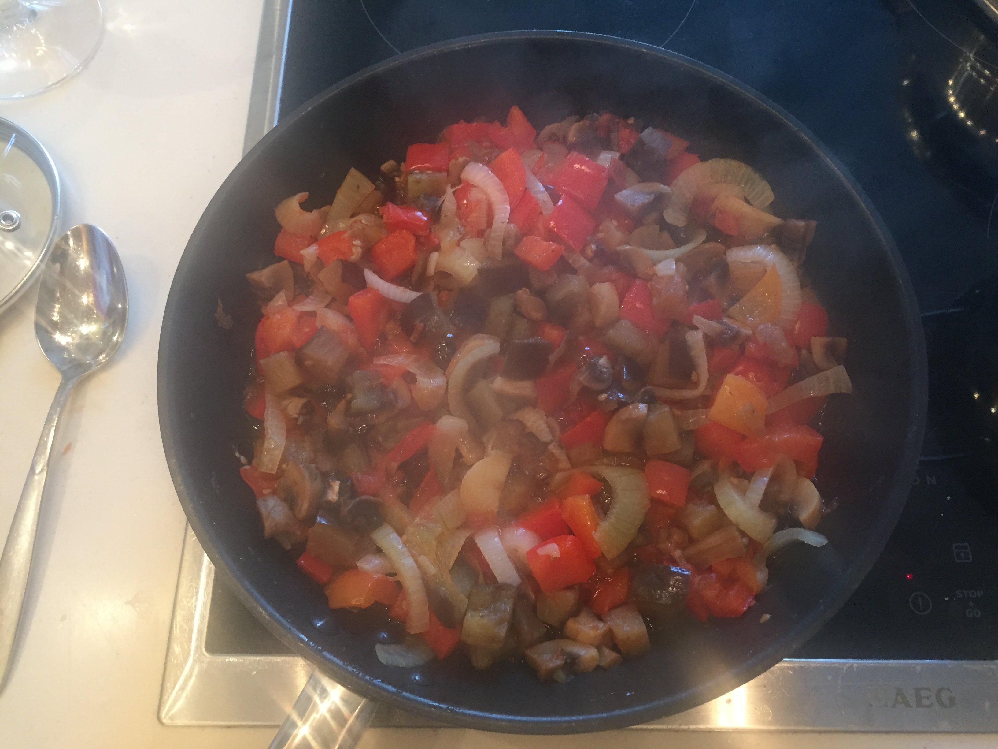 Периодически помешивая, ужариваем овощи. Индикатором служит "готовность" шампиньонов.