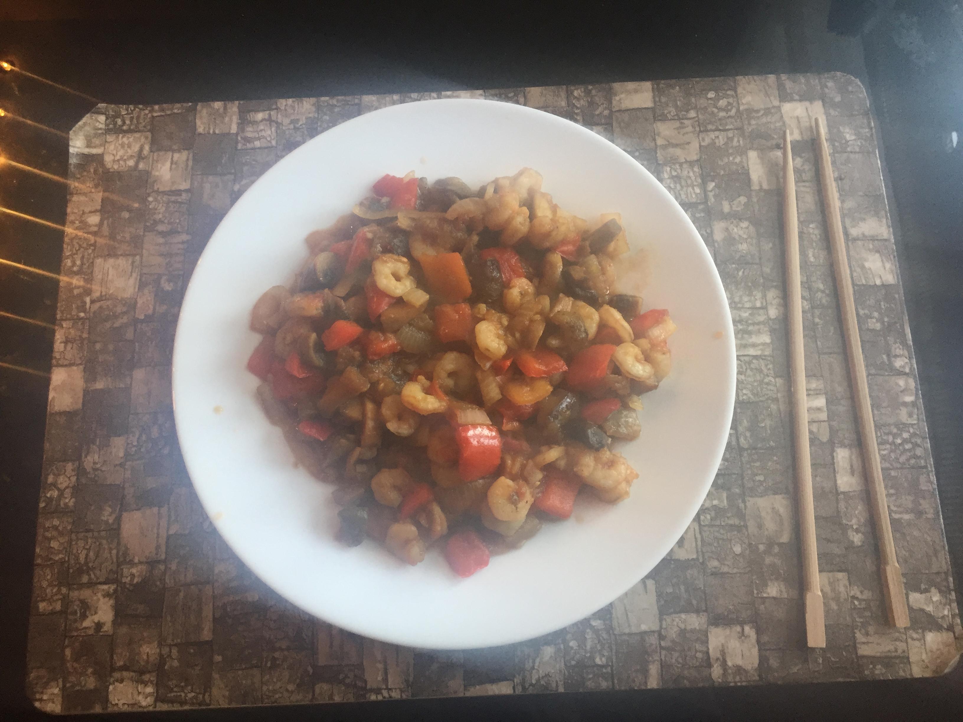 Креветки с овощами тушеными, в соевом соусе.