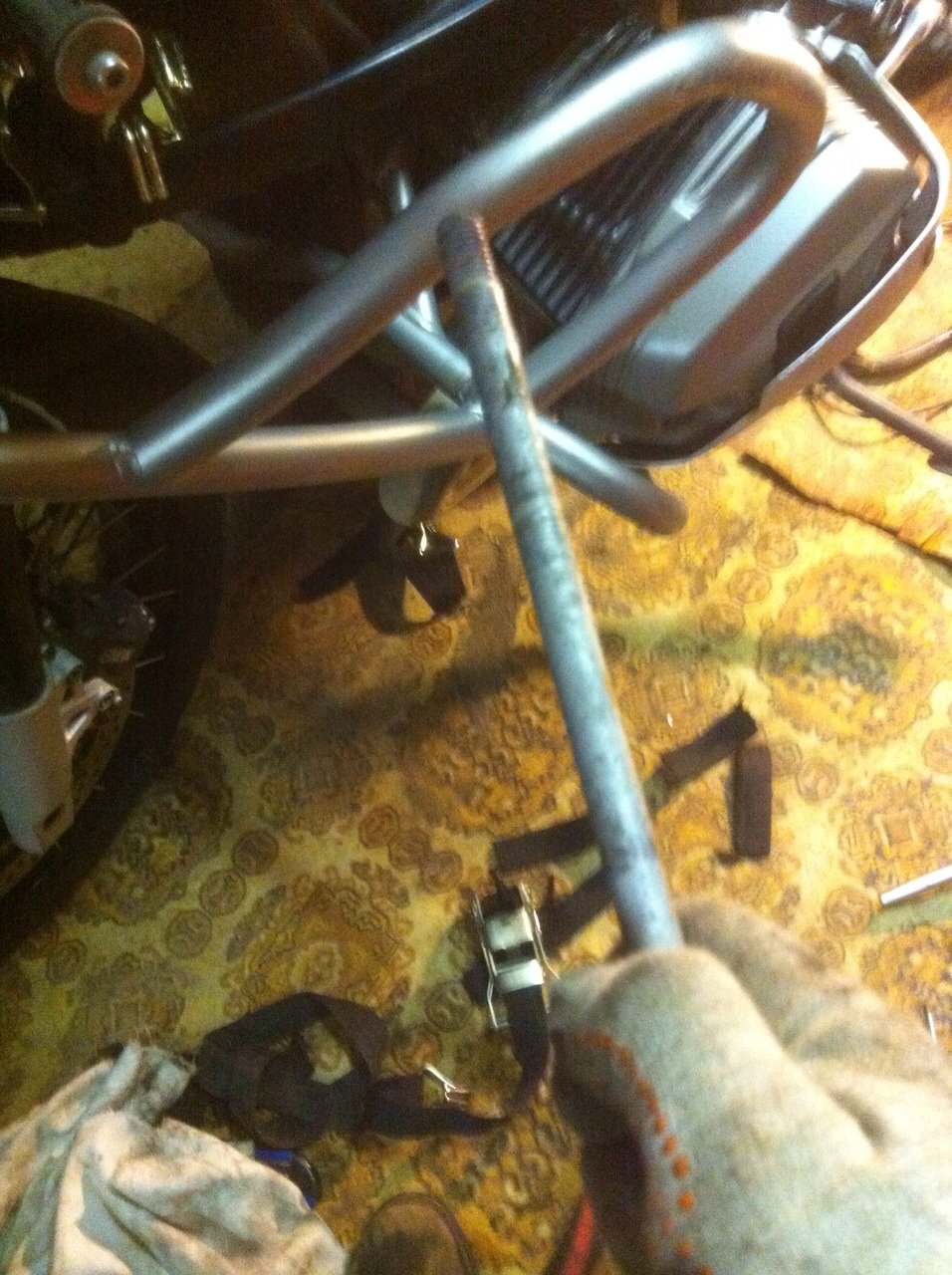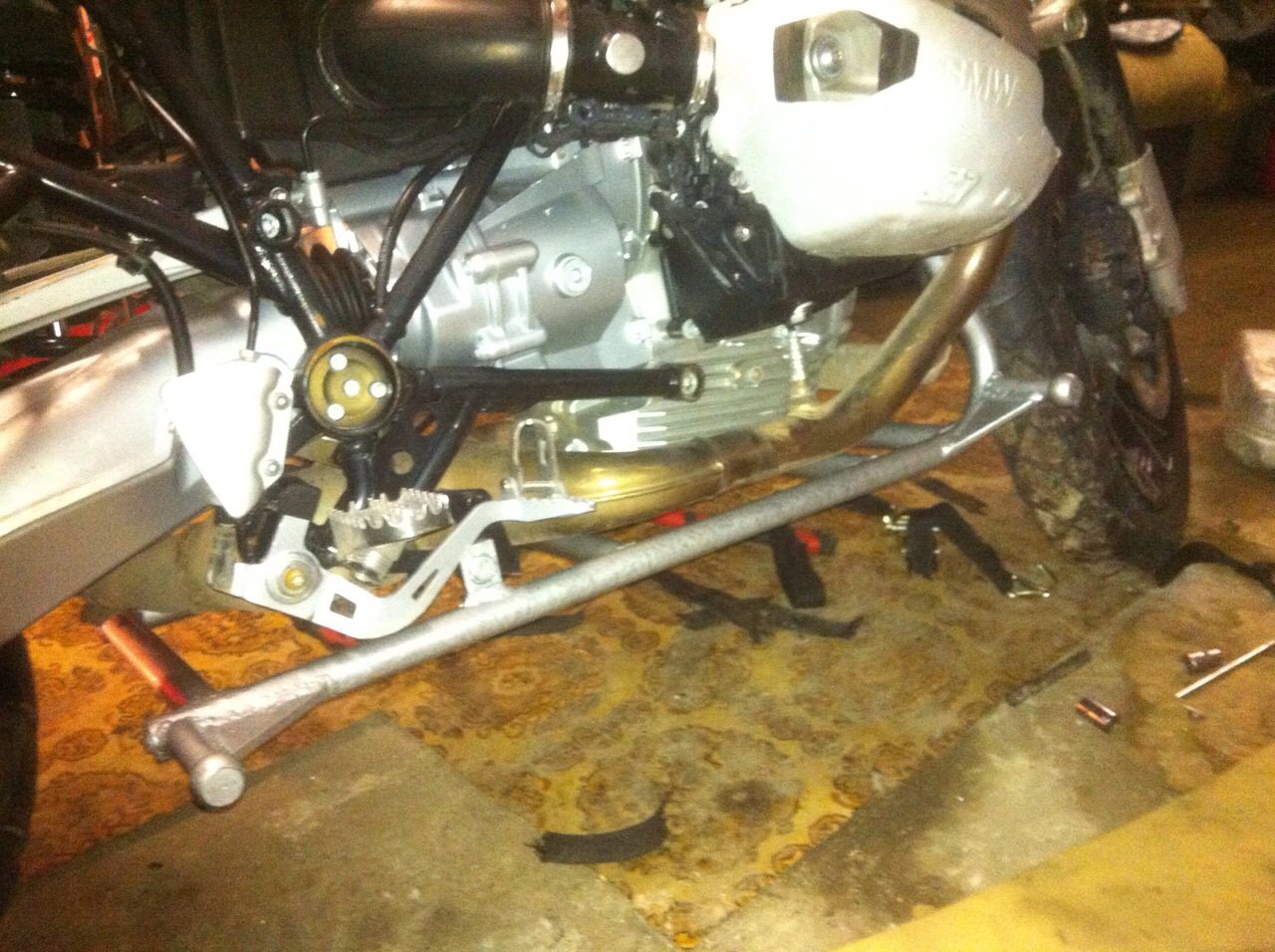 Итак, помыв мотоцикл и разобравшись в гараже, было принято решение незамедлительно начать операцию по внедрению подрамника на гуся. Днем ранее, поняв что в рязань где стоит моя коляска от ИЖ-Ю5 я не успеваю, так-как дел скопилось не в проворот да еще надо успеть разобрать мотик, я попросил своего друга Рому, метнуться в рязань и забрать коляску. Утром в 5 утра он уже был на "точке", загрузил мою коляску и сразу отправился в нерезиновую. В обед уже был в москве, позвонив и отчитавшись о доставке богоугодного мне ништяка мы с ним сошлись на мнении что коляску надо красить в "цвет". Поэтому коляску рома повез не ко мне в гараж а прямиком к себе в малярку. Вечером он заехал ко мне взял для подбора краски "клюв" и наклейку R1200, обложив меня по дружески матюками с криками -" ятвой гусь корыто шатал" удалился во свояси, оставив меня на едине с конкретными .издецами которые ждут меня в процессе монтажа, о которых я даже и не подозревал.