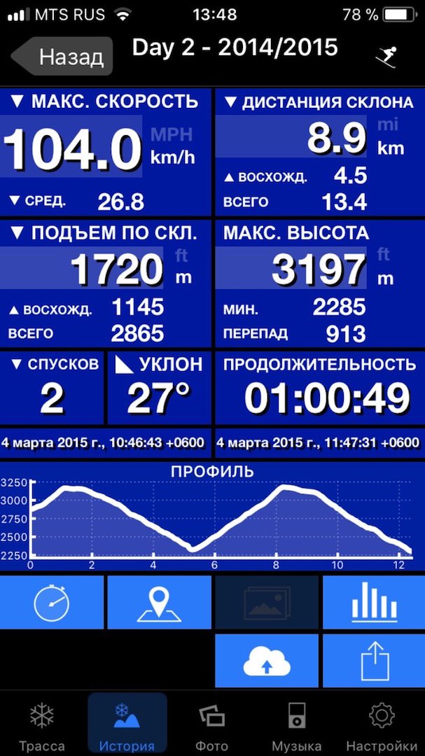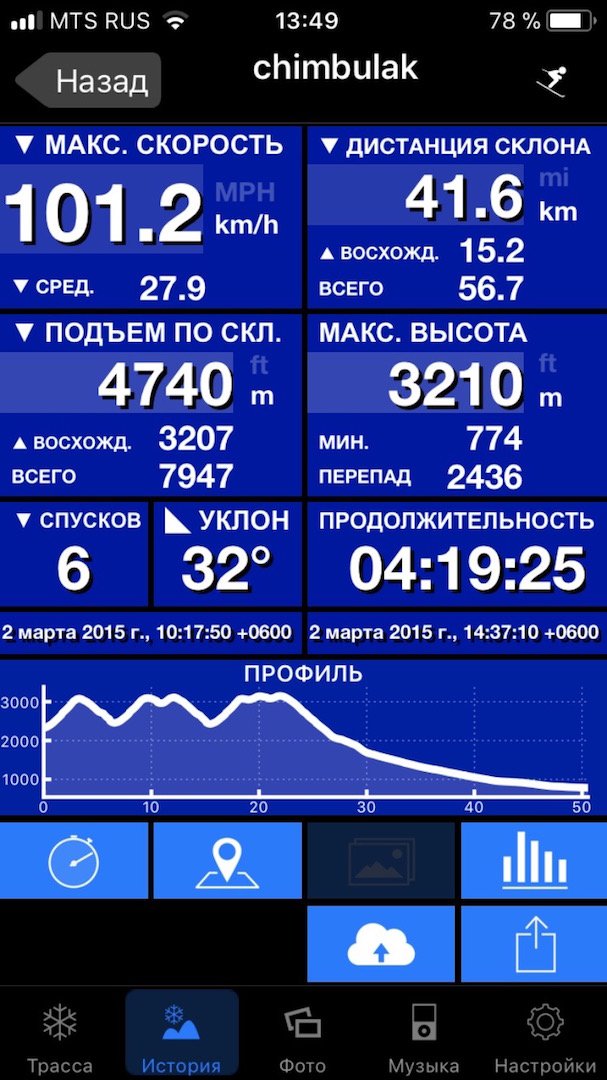 Сегодня с утра в Домбае разогнался по GPS Locus Pro до 78.7 км, потом в течении дня еще несколько раз пытался "обогнать" свою скорость, но не получилось, хотя визуально казалось, что лечу как угорелый. Благо трассы отлично проратрачены и минимум публики, т.е. видимость хорошая.