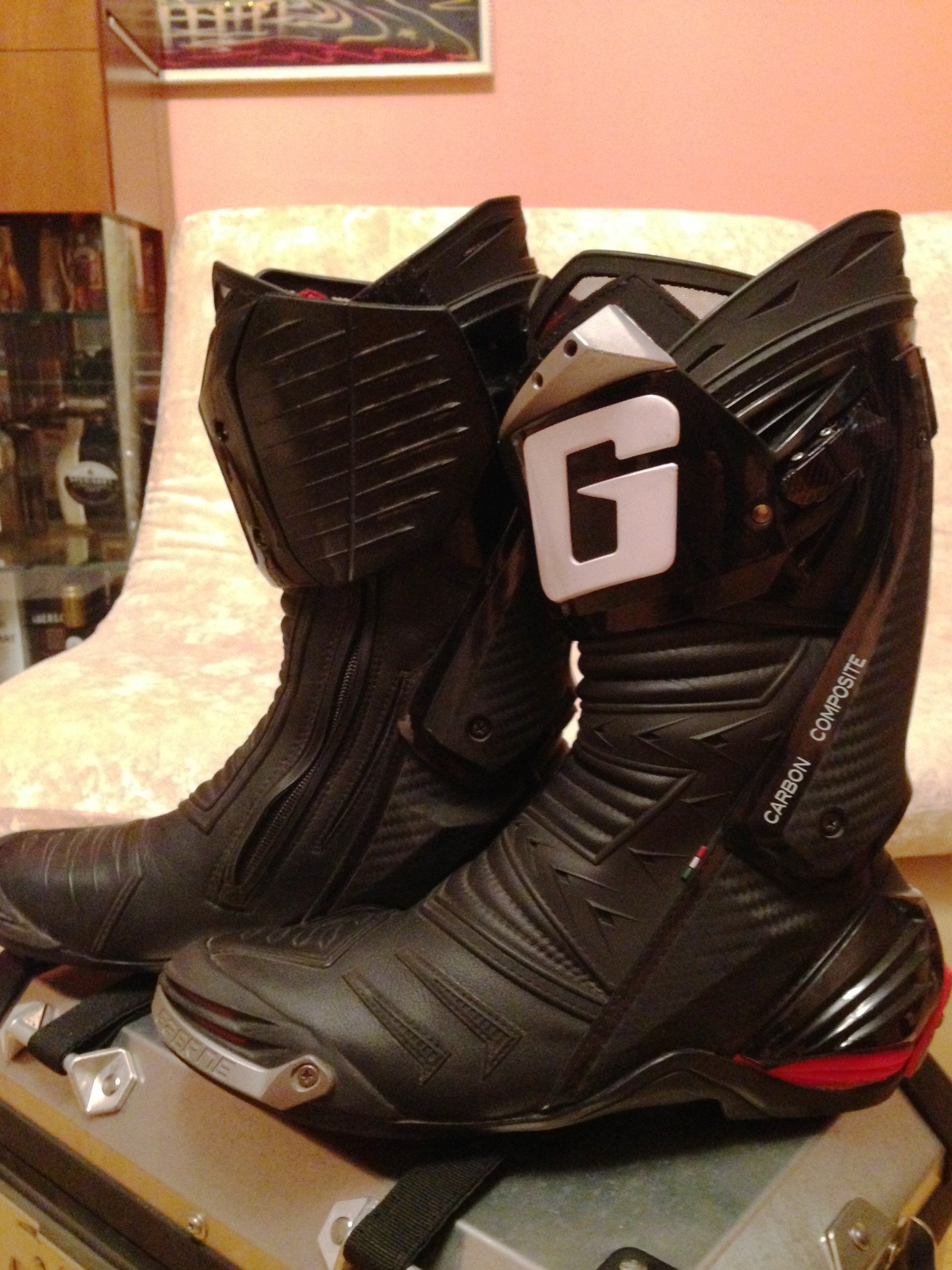 Высшая модель в спортивной линейке, в салонах стоимость более 23 т.р.. Состояние отличное, эксплуатация 1 сезон в сухую погоду. Максимальная защита, карбон, шарнир и пр., при этом легкое надевание (фиксация молния и липучка). Очень удобные не только для мота, но и для ходьбы (самое лучше, что удалось перепробовать). Износ минимальный: пятка порядка 0,5 мм снаружи, накладные элементы вообще без следов эксплуатации. Подробно почитать можно тут: http://www.crazyiron.ru/production/sajt/ekip/motoboty/gaerne_motoboty_sportivnye_gp-4/
