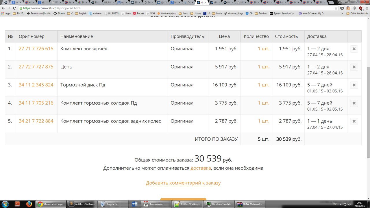 Ну как минимум тормозные диски (родные, но не оригинальные) дешевле выйдут на Луисе - https://www.louis.de/en/rund-ums-mo...04/1149?brand=109&price=&page=1#article_list3 - правда доставка будет не 1-2 дня, но тем не менее. Тормозные колодки есть и там, и почти стопудово можно подобрать вполне подходящие, но не родные бмвшные - в Москве, будет ощутимо дешевле. Маслофильтр там тоже совершенно стандартный. На цепи я бы не экономил.
