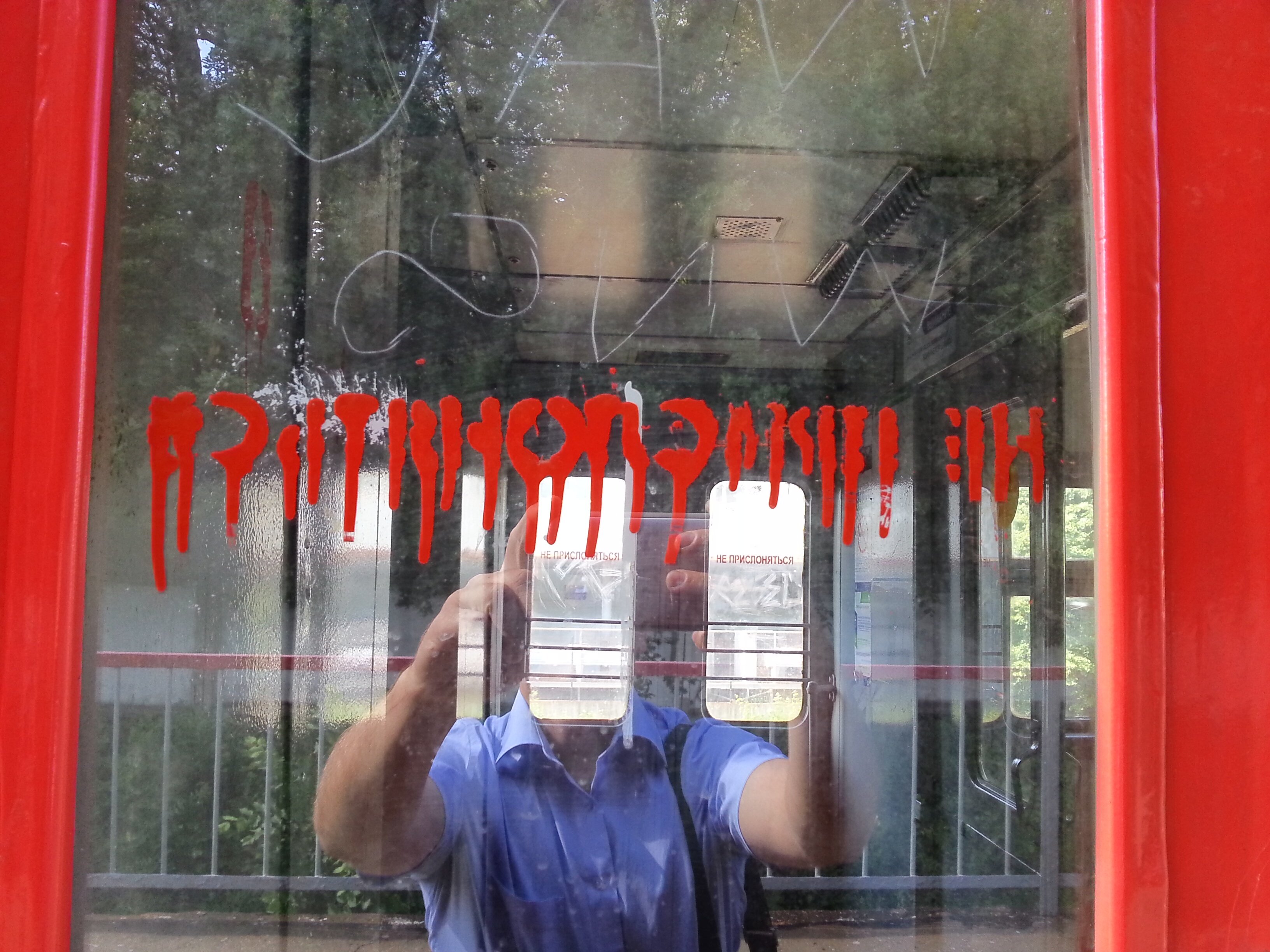 Вот один видимо прислонился в электричке, например. А ведь написано - не прислоняться!