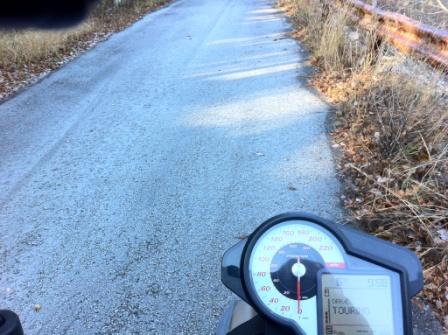 Но на самом деле понимаешь, что лето прошло. Дорога сухая, грех не прокатиться. Но чем выше я поднимался, тем становилось холоднее и мокрее. Причем в теневых поворотах были заметны остатки ночного мороза. Приходилось осторожничать.