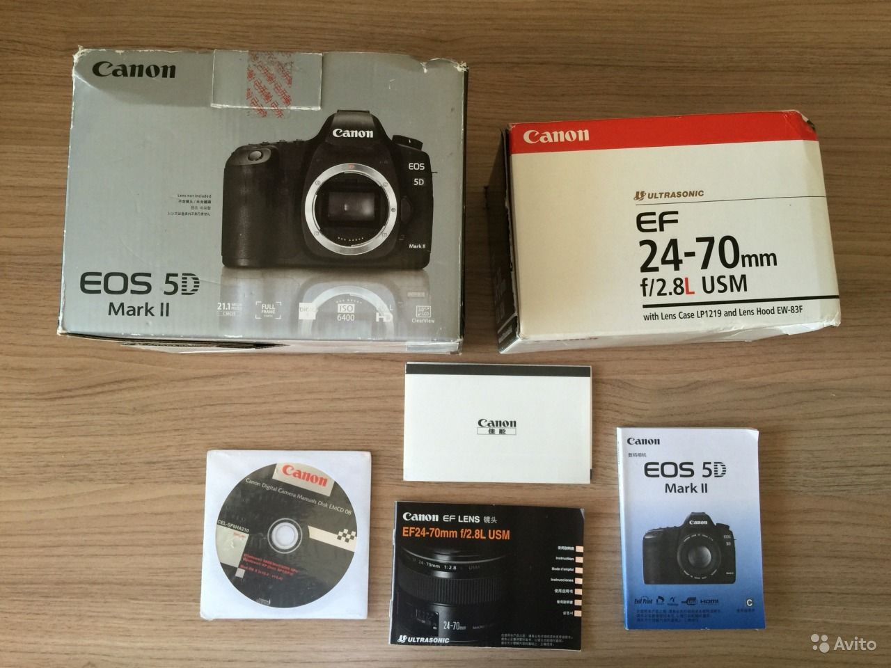 Коробки от тушки и объектива в комплекте. А также инструкция, документы, крышечки и бленда.