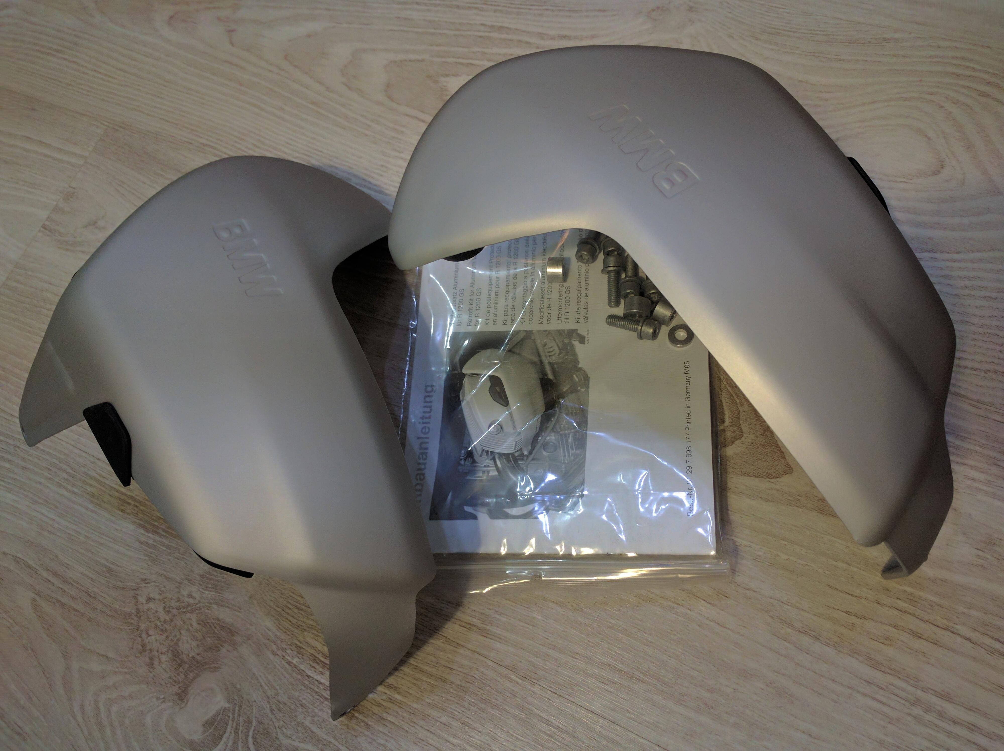 От того же мотоцикла, от которого остались новые ручки HP, осталась и защита цилиндров. Комплект новый, в коробке. Алюминиевая, с резиновыми буферами и крепежем. Подходит на все воздушники R1200 с 2004 по 09.2009, с четырьмя болтами на крышке головки цилиндра (как на фото).