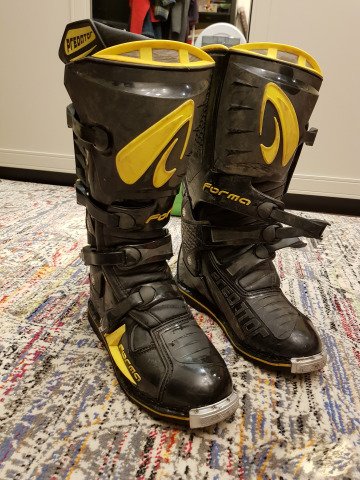 Топовые кроссовые мотоботы в линейке миланской компании Форма. Шарнирная система отлично защищает ногу от скручивания но не сковывает движения - чувствуешь передачи и тормоз. Одевал 5 раз для прохватов по лесу - состояние на 5-, оказались чуть велики! Размер 45 (наш 44).Цена 12 000р, торг