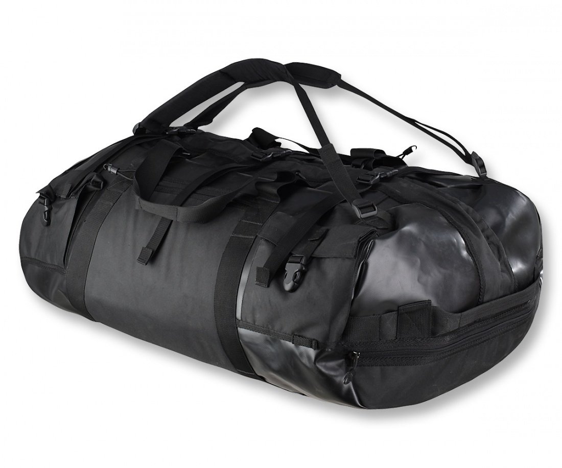 RedFox Specnaz 100 объёмом 100 литров. Не уверен, что она ещё производится. По бокам сумки имеются несколько внешних не сообщающихся с внутренней частью сумки карманов для быстрого доступа наиболее часто используемым вещам. 4 кармана на застёжках типа фаст с закруткой, 2 больших кармана на длинных сторонах баул и 2 малых кармана на торцевых частях.