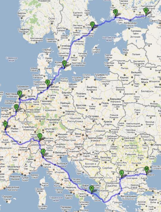 Никто не желает числа с 5-го по 30 июня? Маршрут ОЧЕНЬ приблизительный (накидал за 5 минут, для общей идеи). Все можно дополнить, убавить, добавить и т. д. "Дубасить" не хочу. Хочу неспешно, с отдыхом, достопримечательностями, "на денек задержимся тут", и т. д.