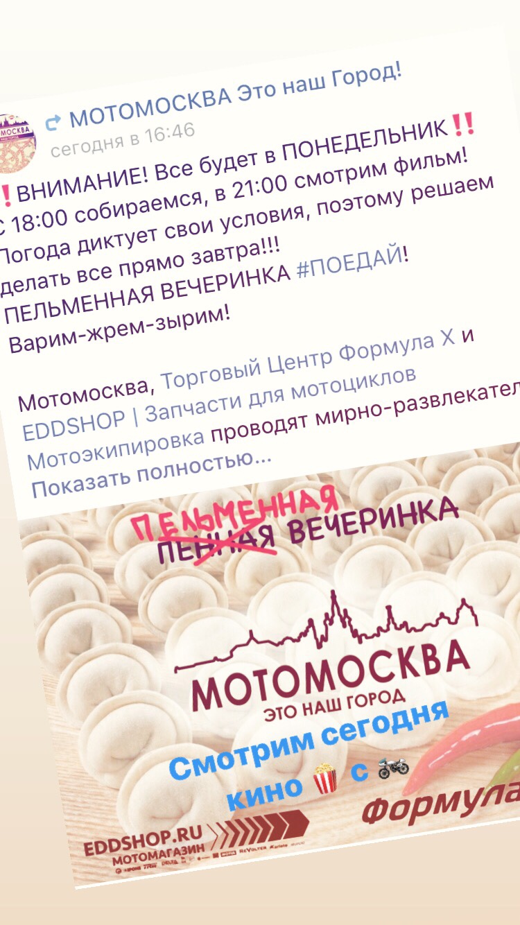 Ребят, всем привет! Сегодня состоится показ фильма на экране на свежем воздухе у ТРЦ Формула Х с МотоМосквой! Хватайте пельмени, что попить на чем посидеть и гоу смотреть хороший фильм! Встречаемся в 20:00 там, кино включают в 21:00.
