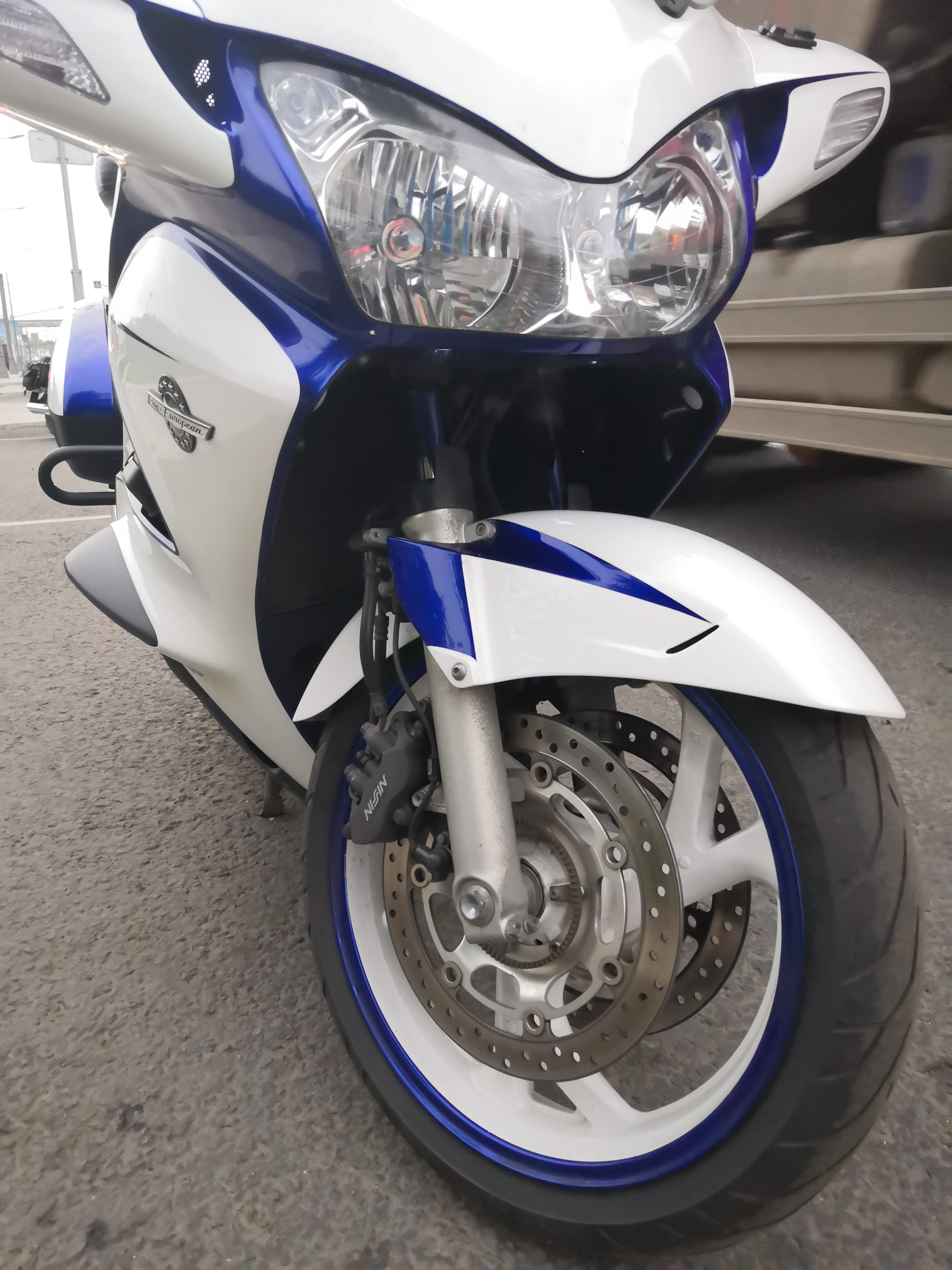 Мотоцикл специально искался именно белого цвета для придания ему индивидуального дизайна (была разработана концепция, подобрана краска многослойная перламутровая, диски выкрашены порошком под лаком + обода, а также некоторые мелкие детали также подобраны под цвет- видно на фото). Результат превзошел ожидания) Такой Pan European один – он уникален). Работа проводилась в межсезонье, в специализированном сервис-ателье, параллельно мотоцикл был дополнительно проинспектирован и продиагностирован – нареканий нет от слова совсем!