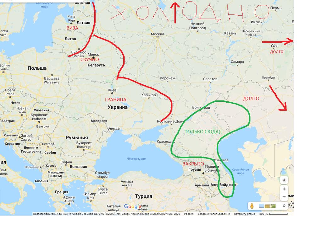В прошлом году ездили Москва-Волгоград-Астрахань-Атырау -Бейнеу-Курык - паром до Баку (гонки формула 1)-Грозный-Москва. Нам понравилось.