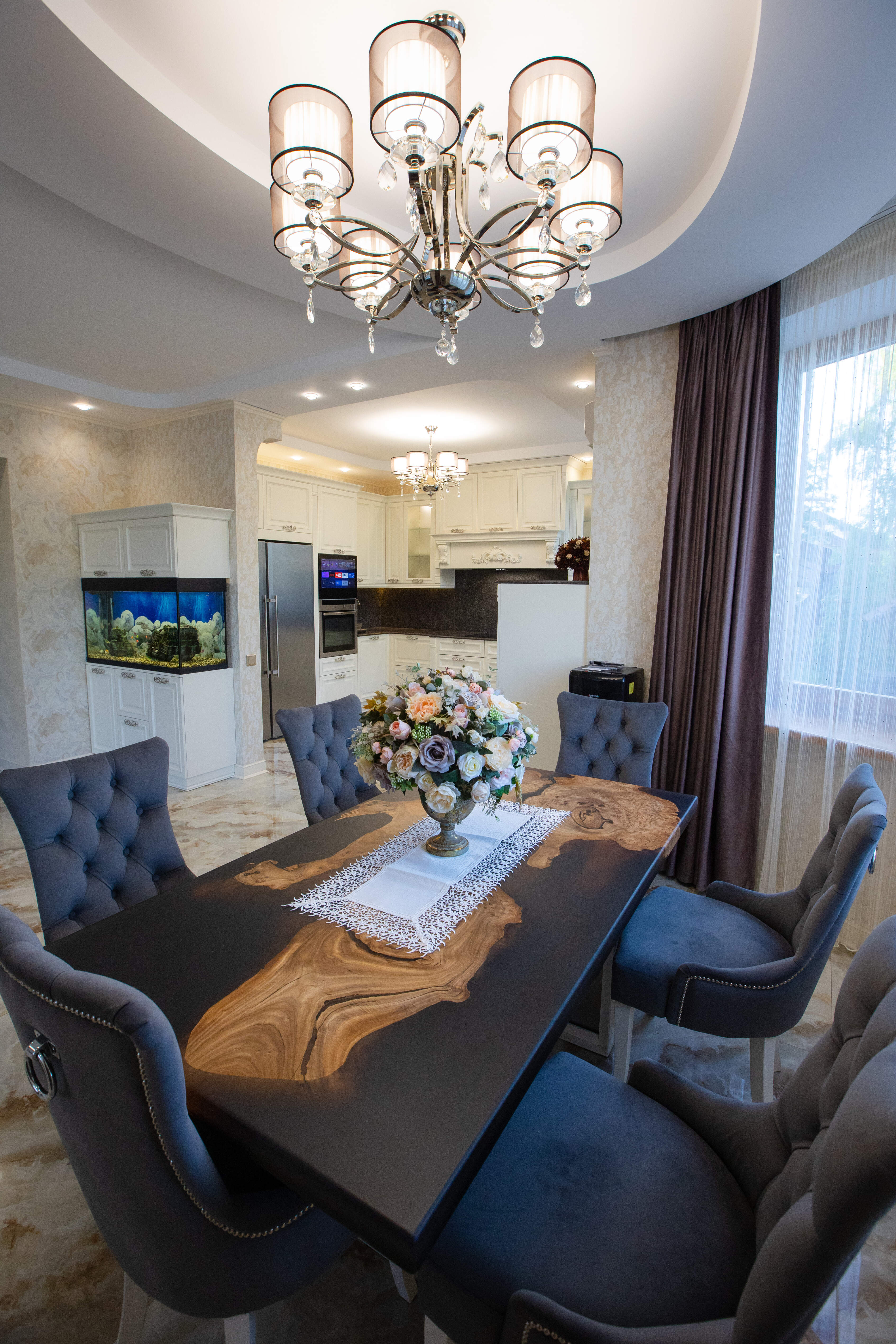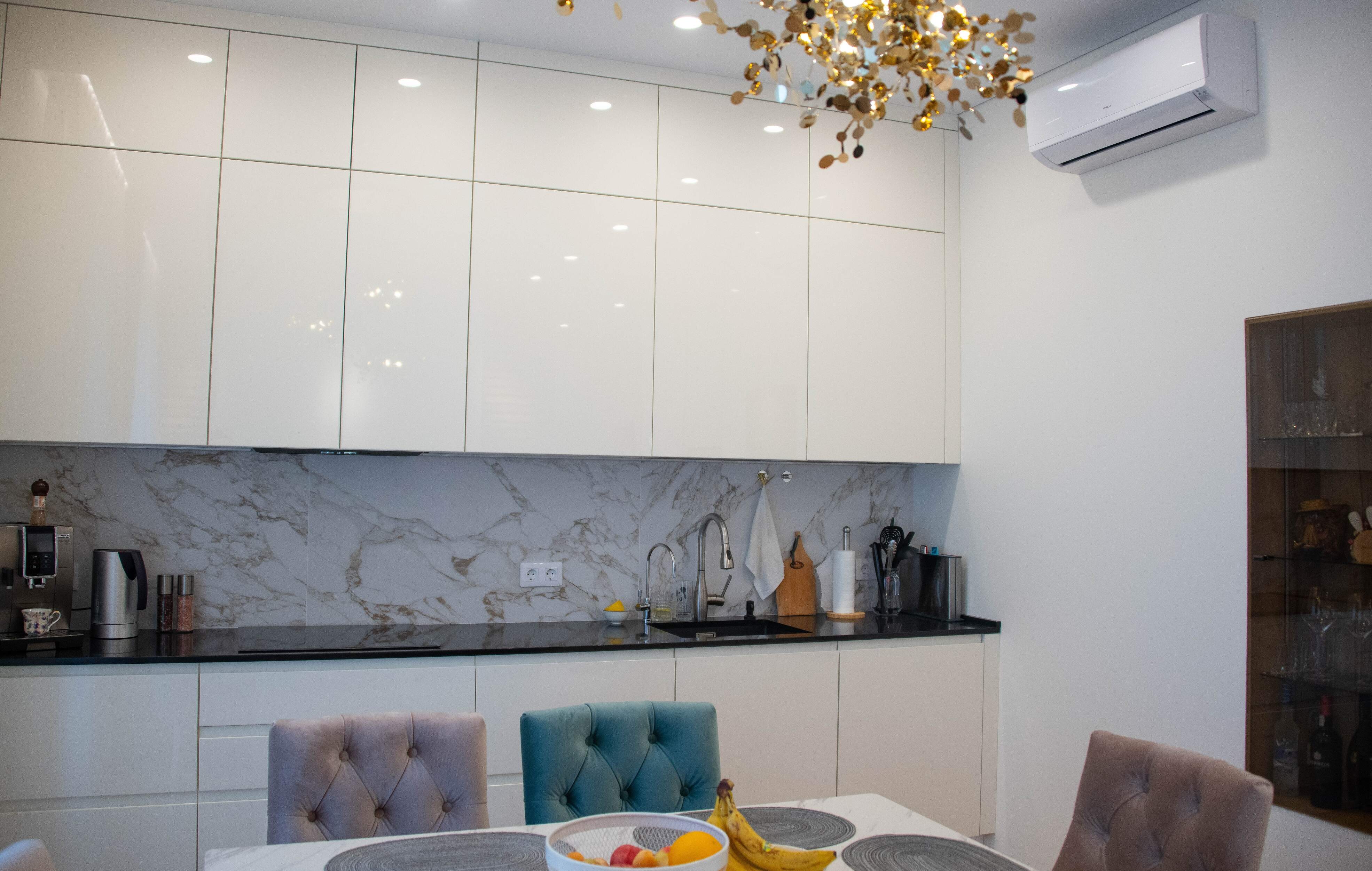Кухня до потолка, хорошая рабочая зона, высокий белый глянец, идеальные фасады, кварцевая столешница, о-очень удобные стулья – это то, что бросается глаза.