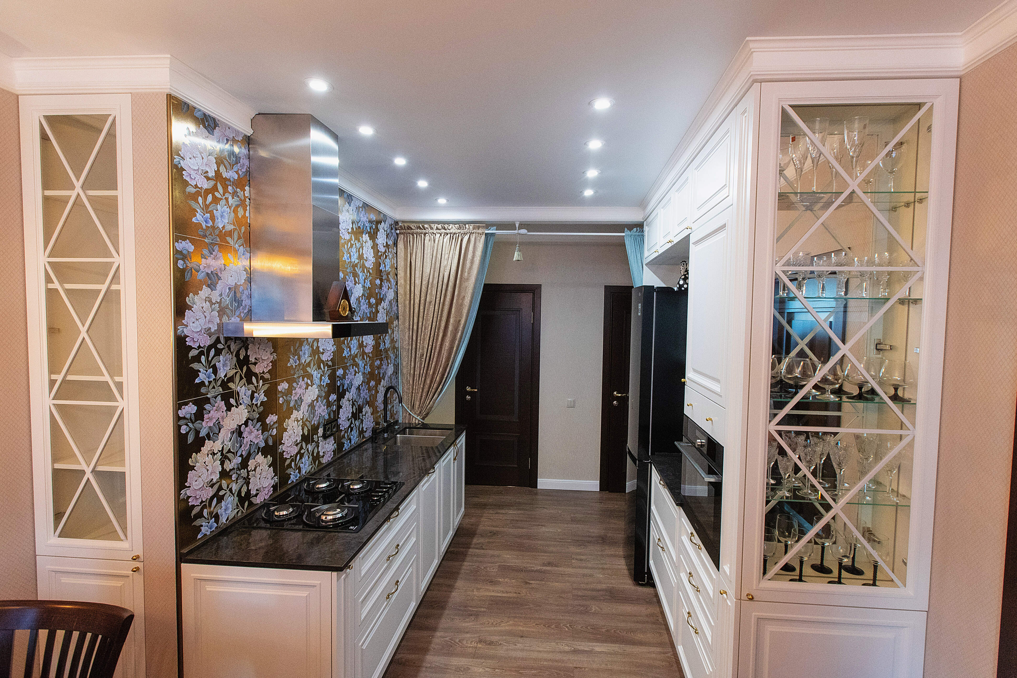 • Встраиваемая в стену витрина с подсветкой позволила эффектом спрятать коммуникации. Благодаря точным просчетам все получилось идеально.
