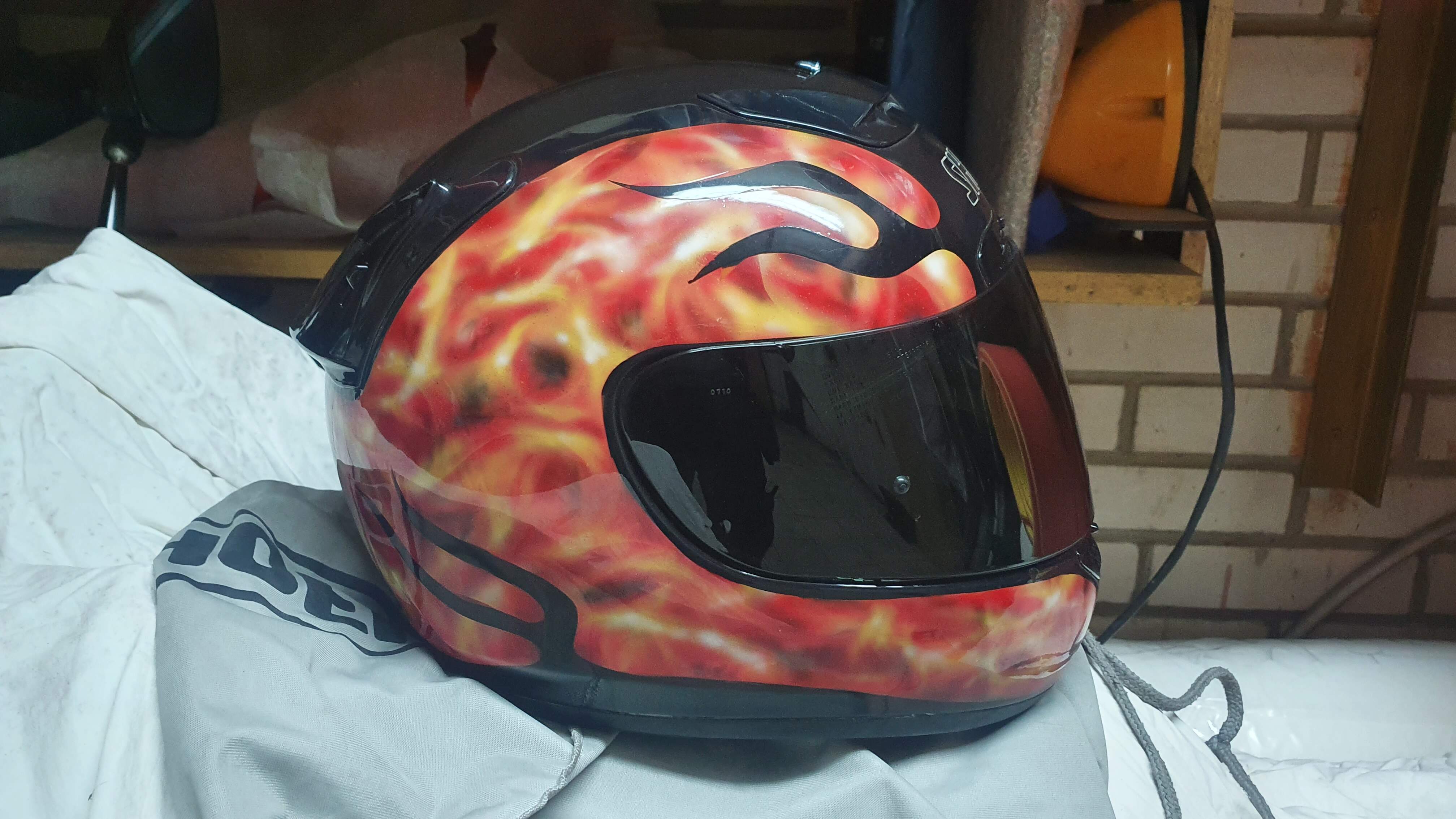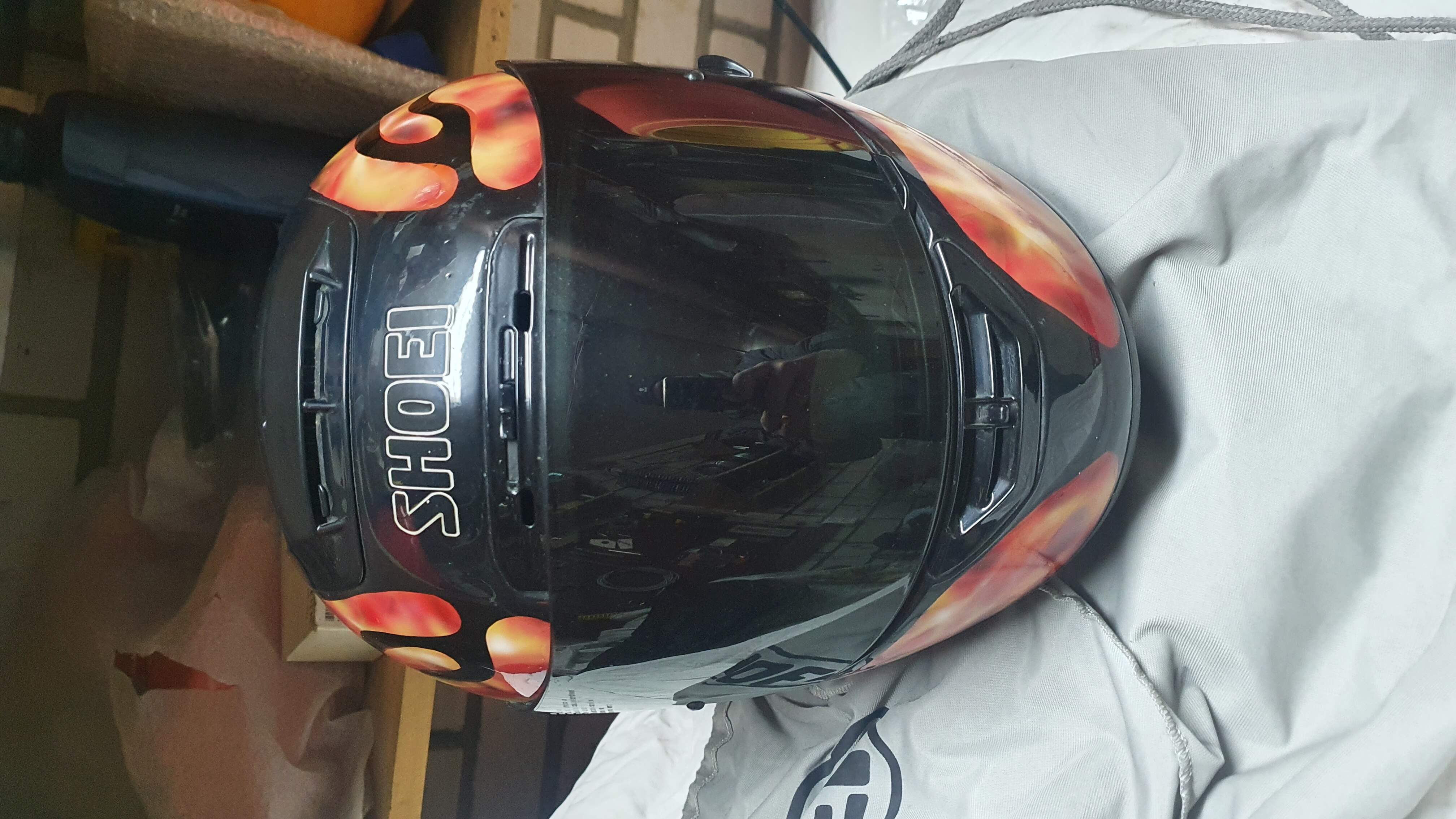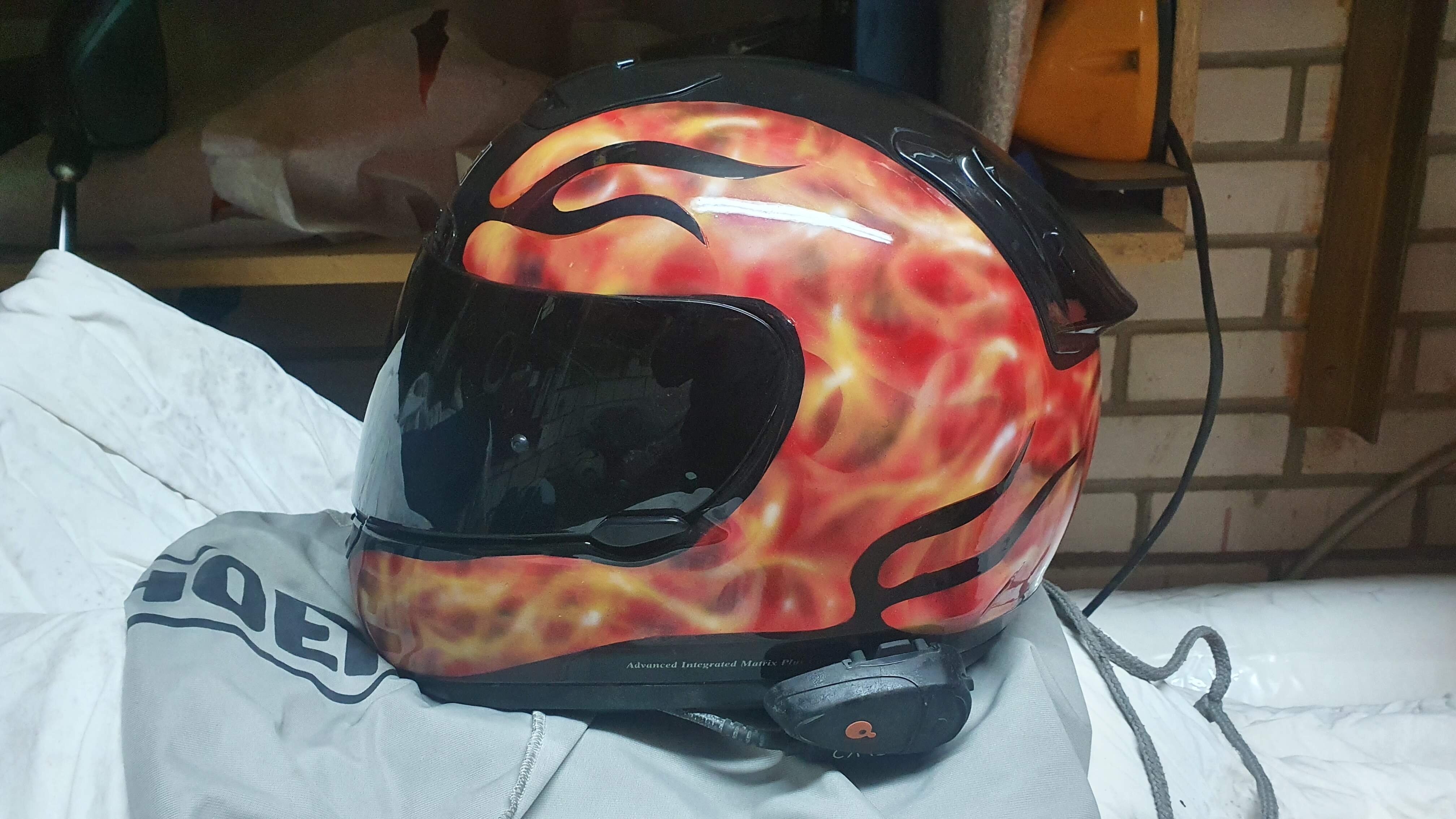 Продам шлем Shoei Х-spirit, б/у. Не падал, не бит. Аэрография. 4 визора: 2 прозрачных, 1 темный, 1 с растяжкой от прозрачного к темному. Подшлемная гарнитура CARDO SCALA RIDER Q2.