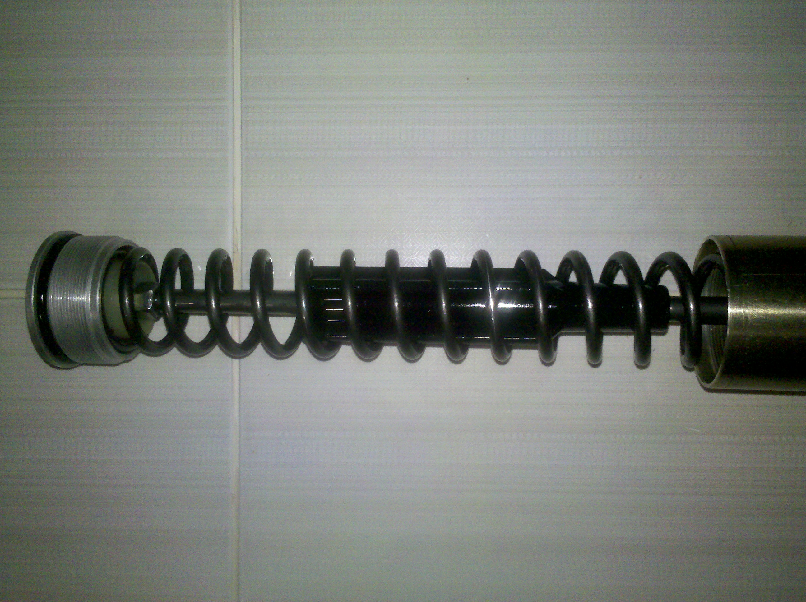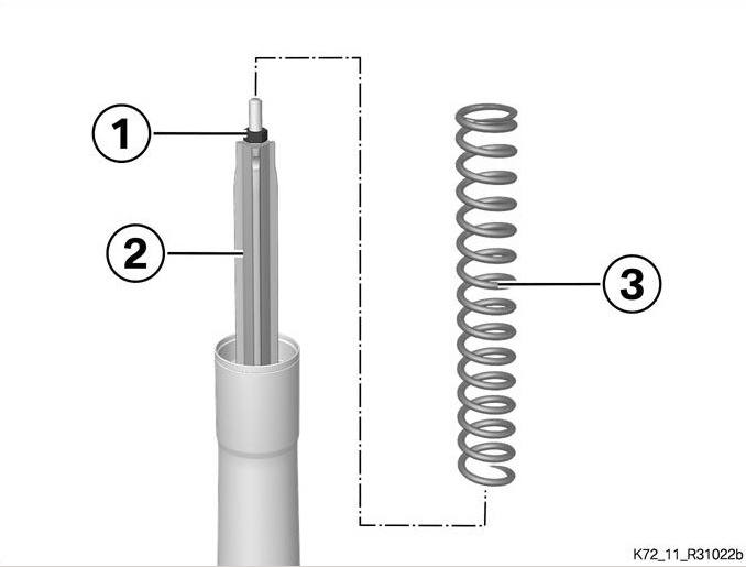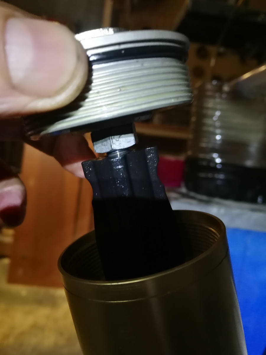 третьего дня разбирал вилку, обратил внимание что пластиковая хрень (2) на штоке, которая внутри пружины и не дает ей складываться при сжатии, сверху гаечкой (1) затягиваешь ее и она на штоке не болтается соответсвенно, а когда с пружиной уже собираешь и пробку контришь с этой гаечкой, то образуется люфт ~1,5мм и пластиковая хрень начинает на штоке болтаться, т.е оставшаяся часть штока после гаечки длиннее на 1,5мм чем дырка в пробке.