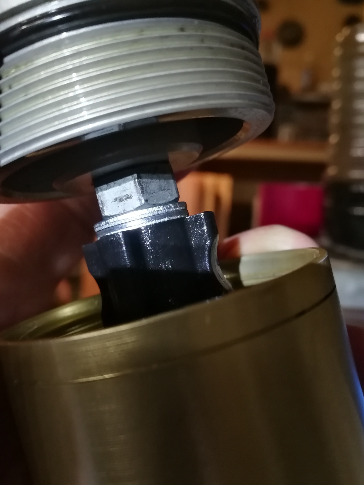 подложил ПОД гаечку (не на нее, иначе она не законтрится с пробкой) две шайбы, после чего конструкция собралась без люфта.