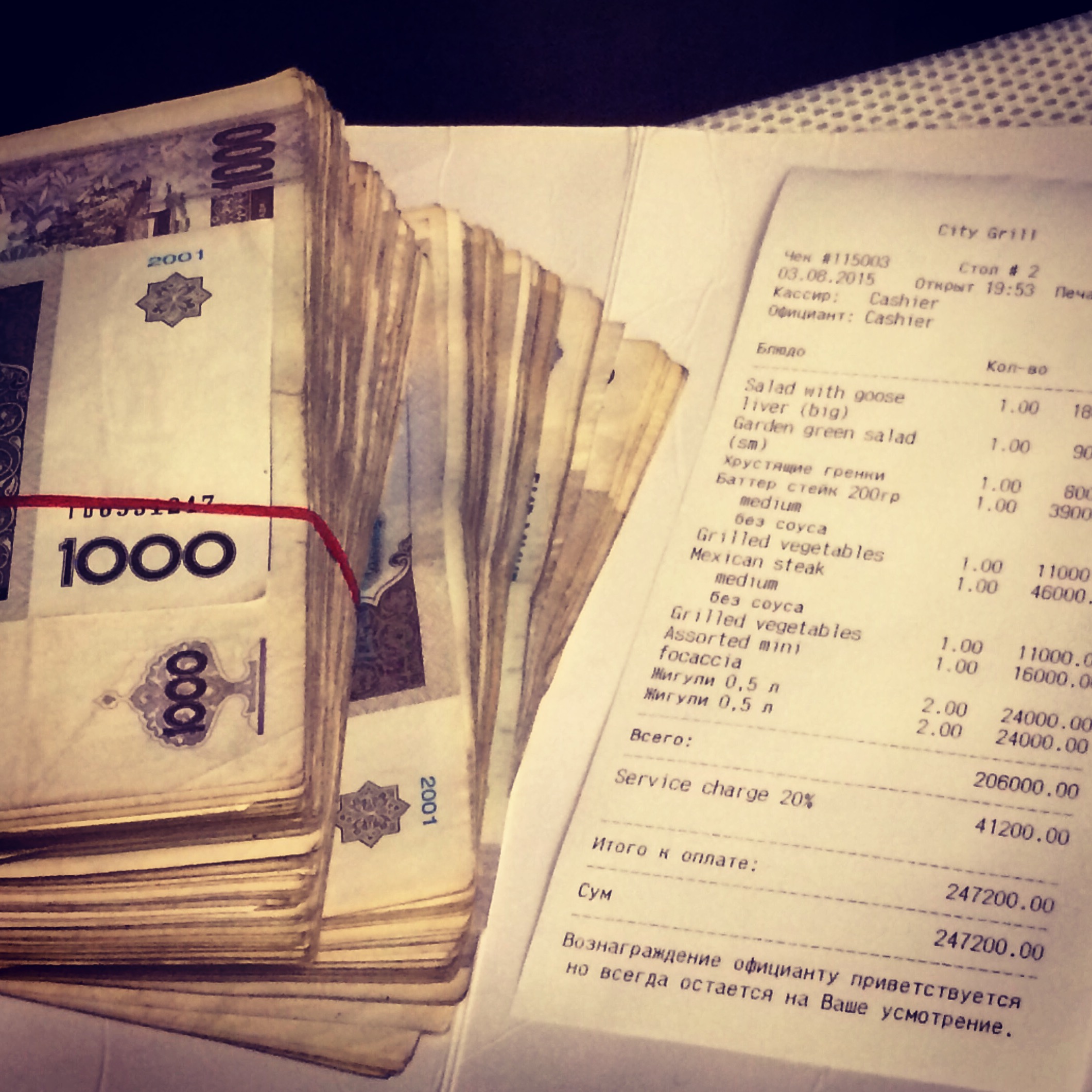 К деньгам здесь сложилось двоякое отношение. Во первых, забудьте о картах VISA и иже с ними. Совсем. Здесь они совершенно бесполезны. Только наличные. Ну а курс местных денег тоже восточная фантастика - их два, официальный и не очень официальный. Отличаются ровно в 2 раза!))) На фото - счет в ресторане, на двоих. Легкий ужин, я бы сказал!))
