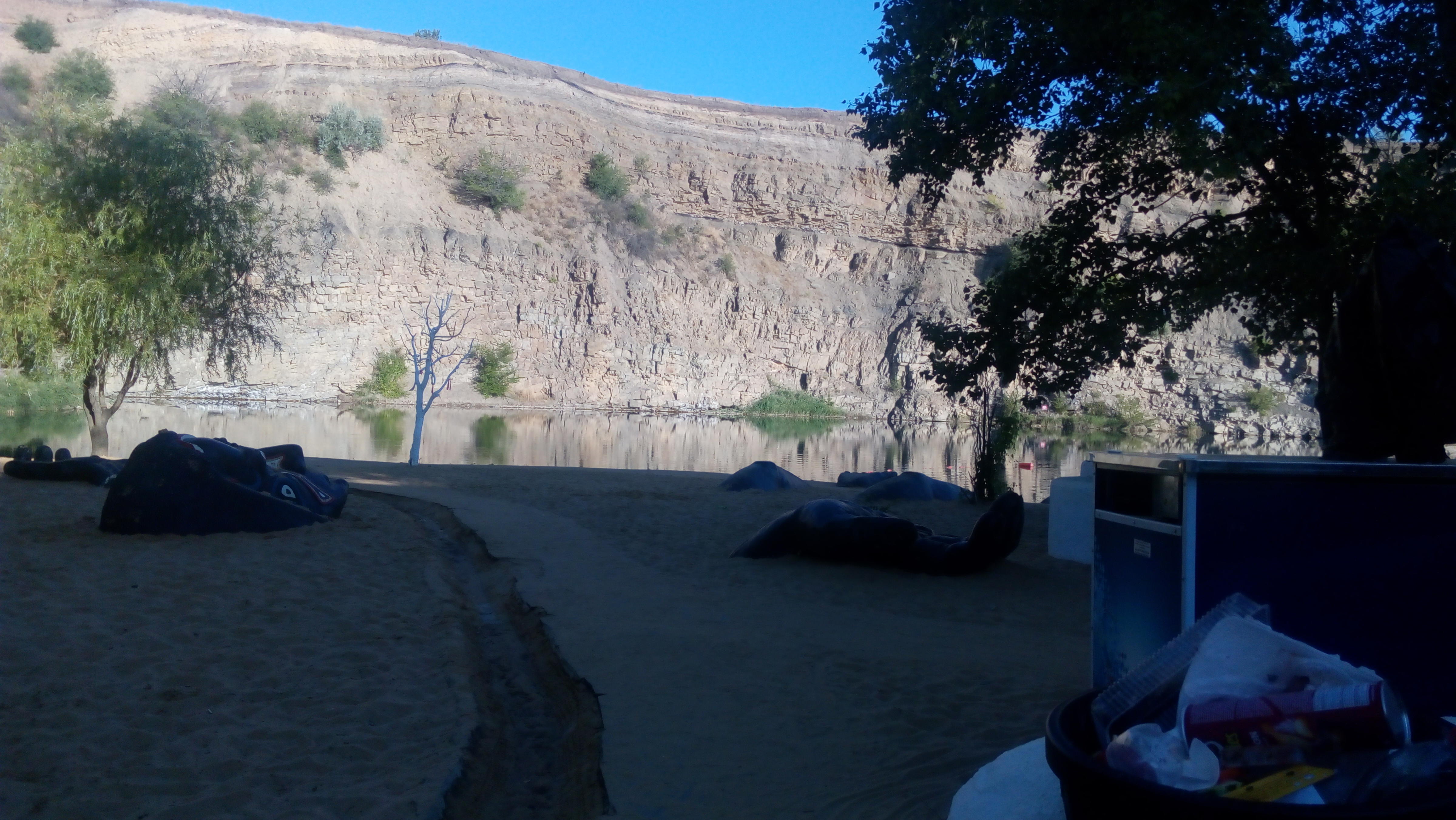 Итог, два колеса под замену, огромное спасибо Юрахе !!! Самое ценное это совет от него не ехать на ночь глядя, а заночевать на турбазе Эльдорадо, где проводится одноименное байкшоу. Решено. На подъезде начал замечать неладное, а на воротах в сию базу понял, что место это что-то вроде Хургады для ростовчан. Даже стало немного страшно, глядя на то, как жены пытаются вынести на руках своих мужей, а те всячески сопротивляются и требуют ЕЩЕЕЕ… Но в итоге все быдло разъехалось, так как было вскр вечер, а мы с напарником остались один на один с еще работающим баром, двумя парнями на Supertenere и Вариоре из мск и пляжем, в виде затопленного родниковой водой карьера от старой каменоломни. Райское место в жаркие летние дни. Пили, болтали ели!