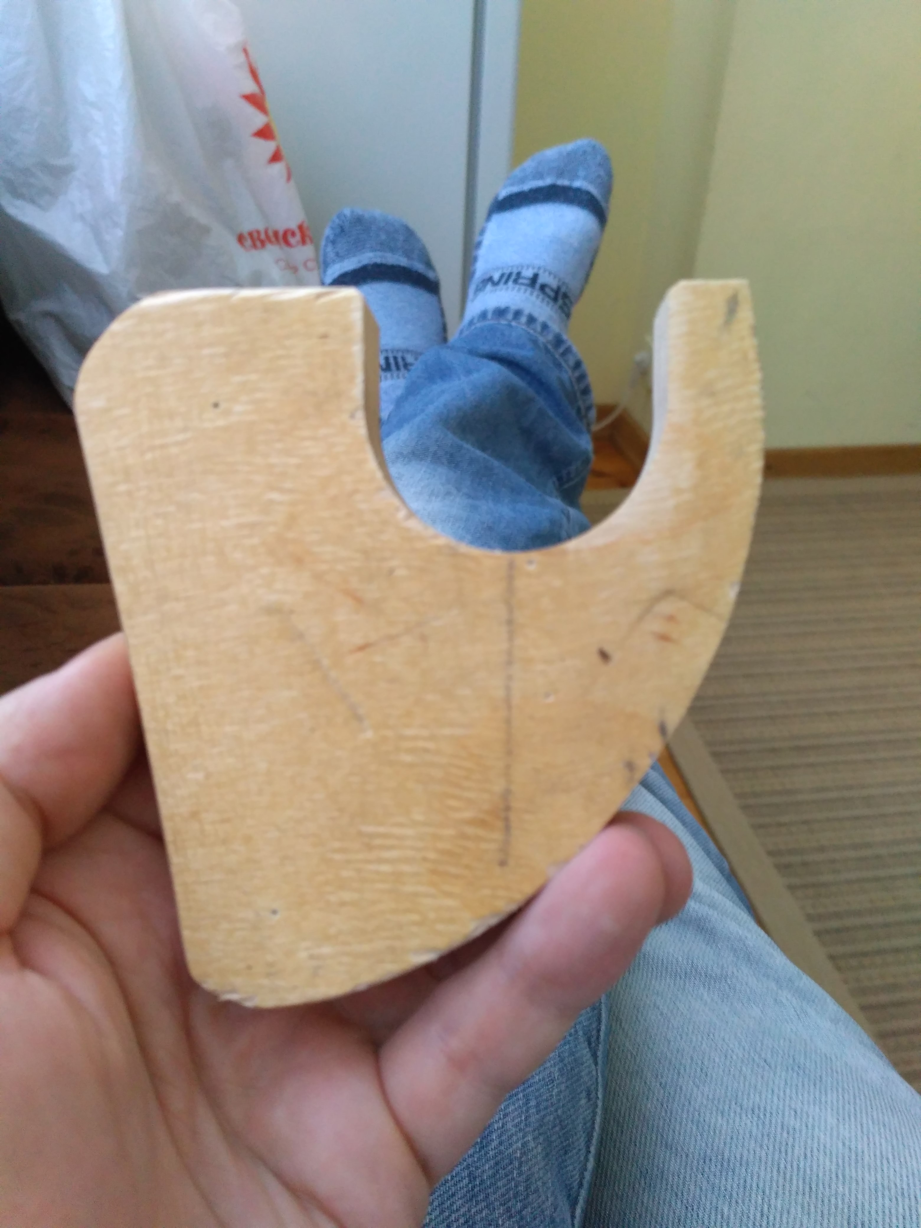 Диаметр поперечной трубы 40 миллиметров + сколько-то соток краски, измерял штангенциркулем. Слепок дал представление о будущей детали, теперь дело за шаблоном. Шаблон вырезал из фанеры. Для этого переколол со слепка центры отверстий на фанеру школьным штангенциркулем, и примерно отрисовал контур. Далее вырезал по контуру заготовку шаблона с небольшим припуском. Торцевой фрезой диаметром 40 мм вырезал паз, в который будет помещаться поперечная труба. Потом приложил шаблон к мотоциклу по месту, разметил отверстия болта амортизатора и подрамника. С учетом размеченных отверстий вновь отрисовал контур будущей детали, вырезал шаблон лобзиком, отшлифовал периметр на ленточной шлифовальном станке.