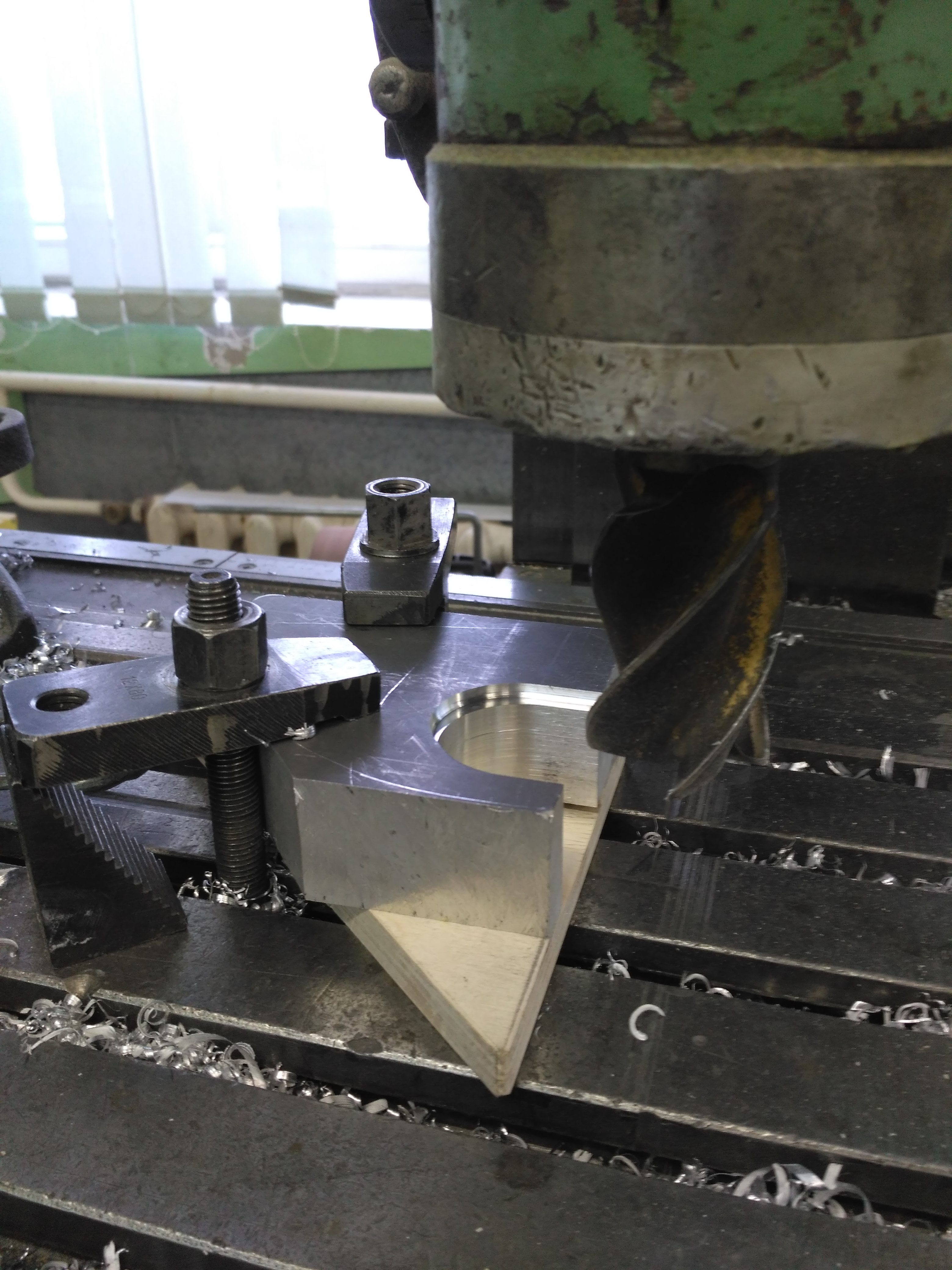 Теперь начинаем фрезеровать дюраль. В качестве материала выбрал Д16Т, прочный, хорошо обрабатываемый сплав алюминия. Обчертил шаблон чертилкой, закрепил заготовку из листа тридцатки на стол. Сначала той же торцевой фрезой диаметром 40 мм сделал паз, в который будет входить подседельная труба, затем ей же со смещением 3,5 мм выполнил углубление в которое зайдет сварной шов.