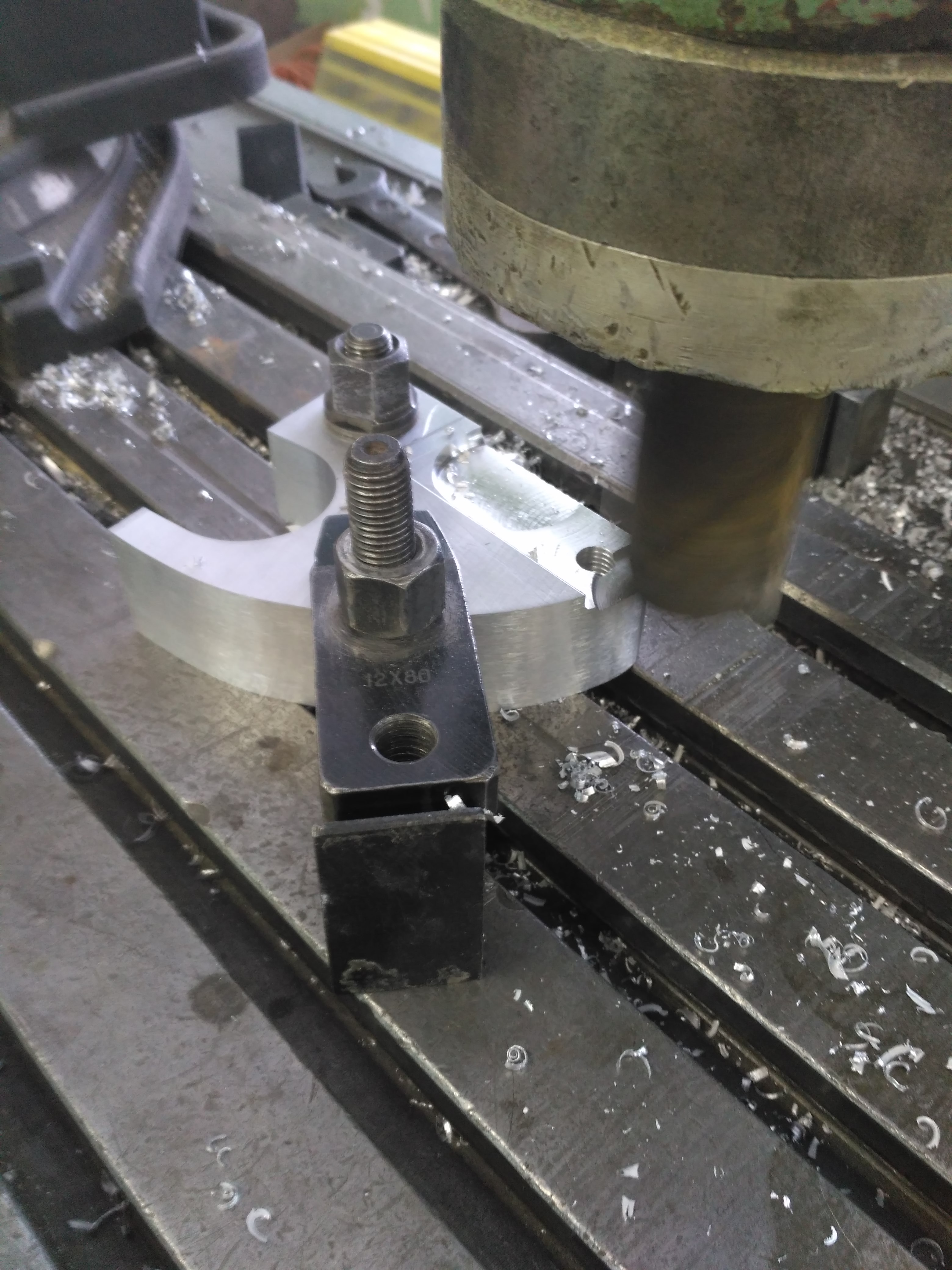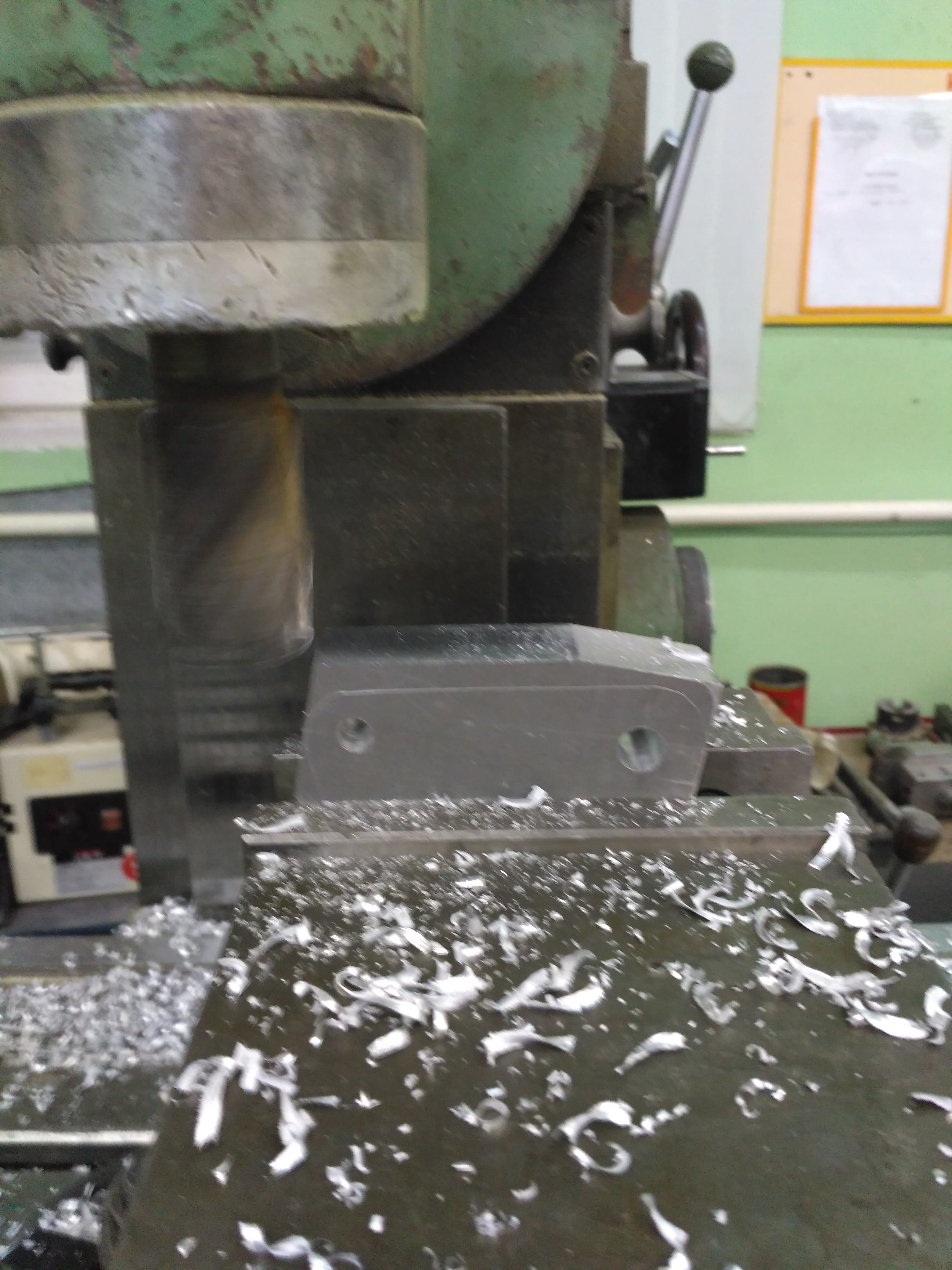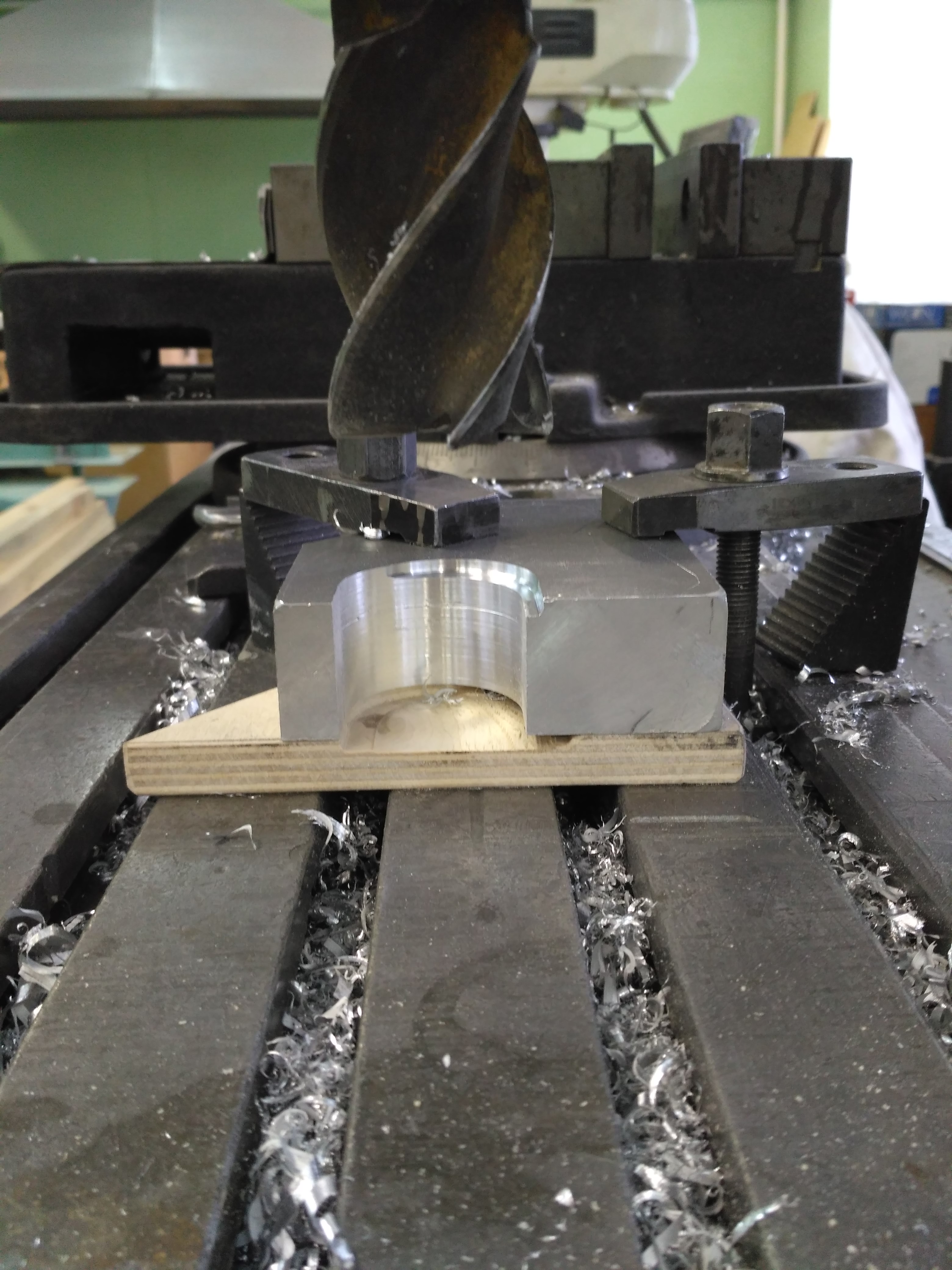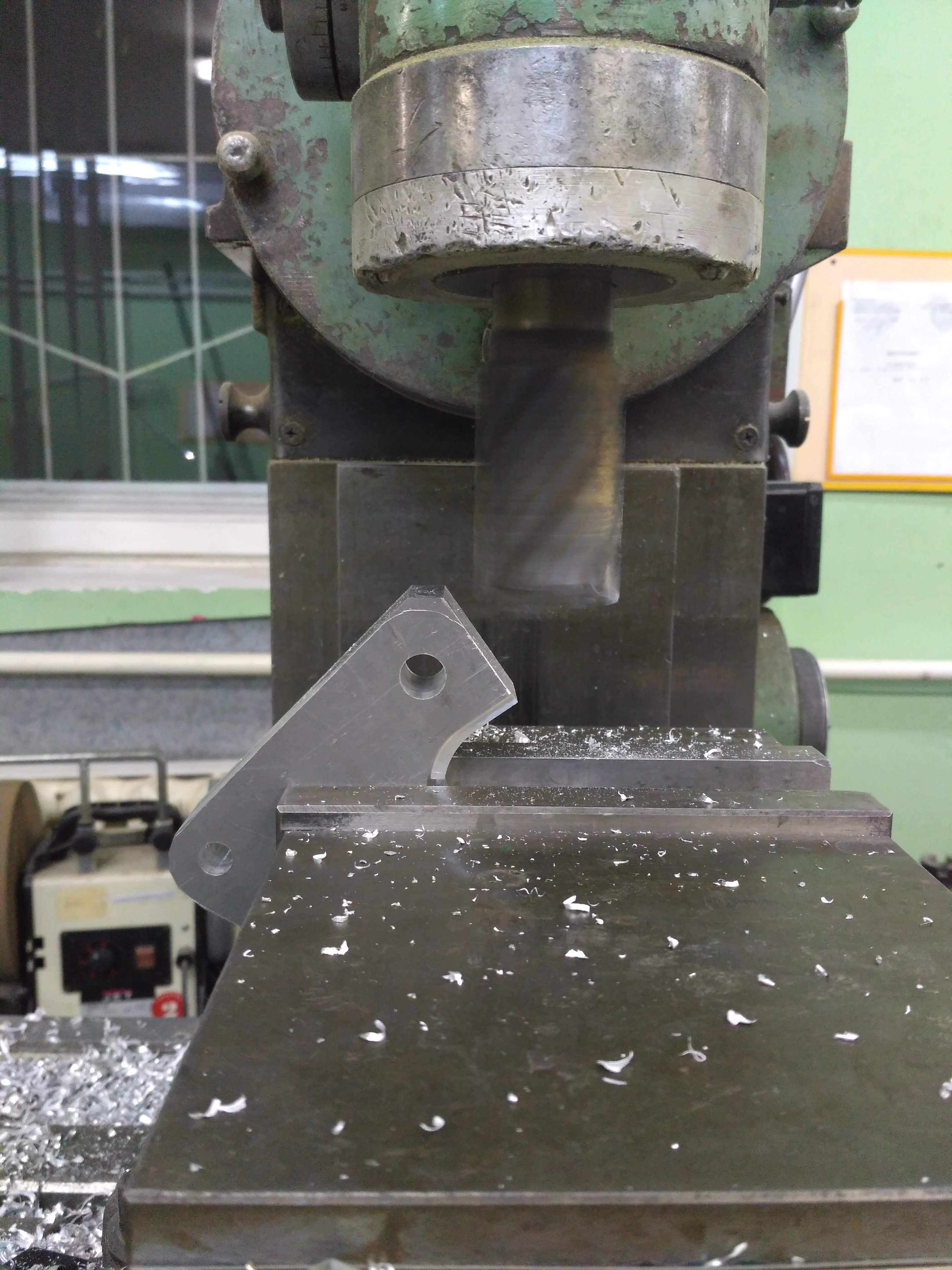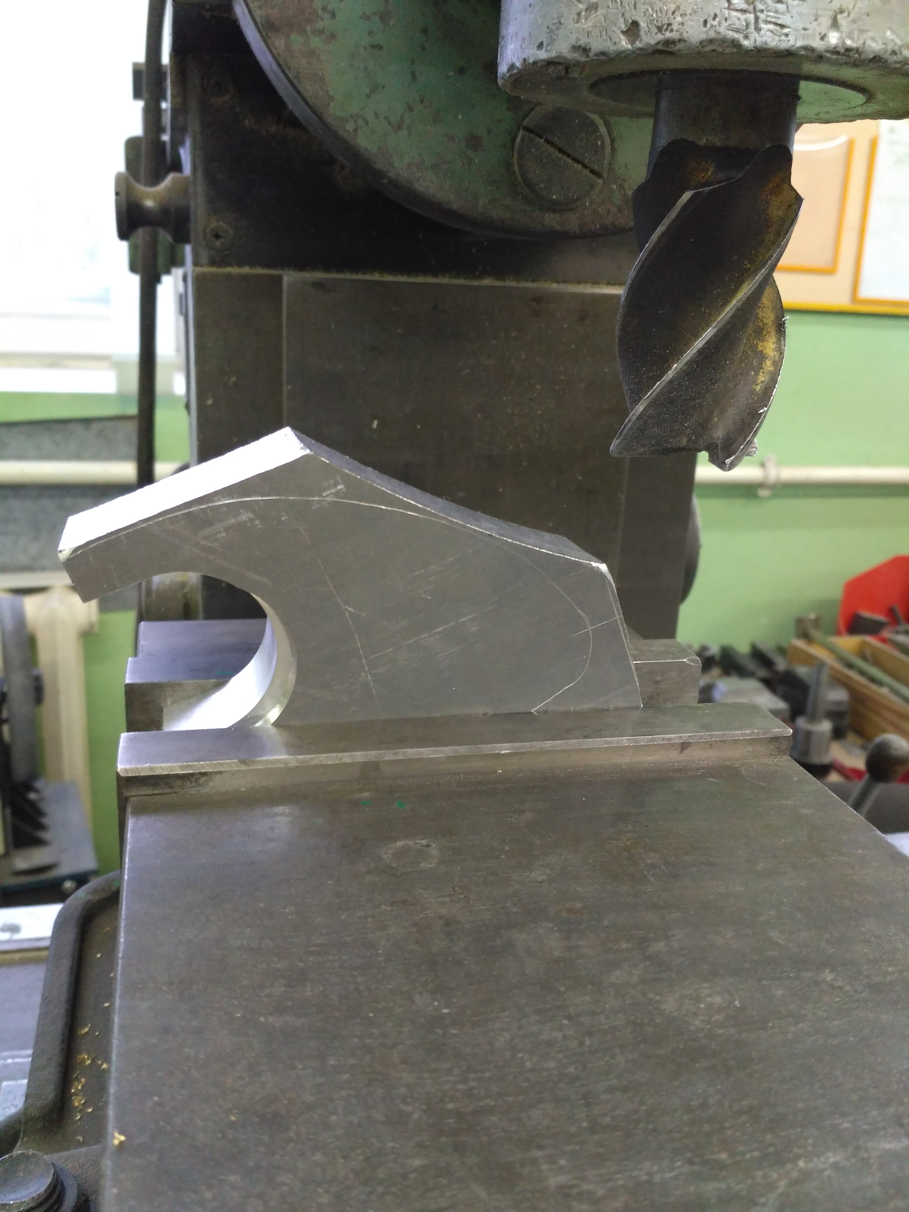 Засунул деталь в мотоцикл – не лезет болт амортизатора, промахнулся на миллиметр при сверловке отверстия, то ли разметил неправильно, то ли сверло ушло (сверлил на сверлильном станке). По месту разметил правильное положение отверстия, а затем на фрезерном станке выставил правильно центр и расточил отверстие фрезой большего диаметра – 18 мм. Заодно увеличил размеры места для корпуса амортизатора, чтобы усиливающий кронштейн было удобнее ставить на мотоцикл.