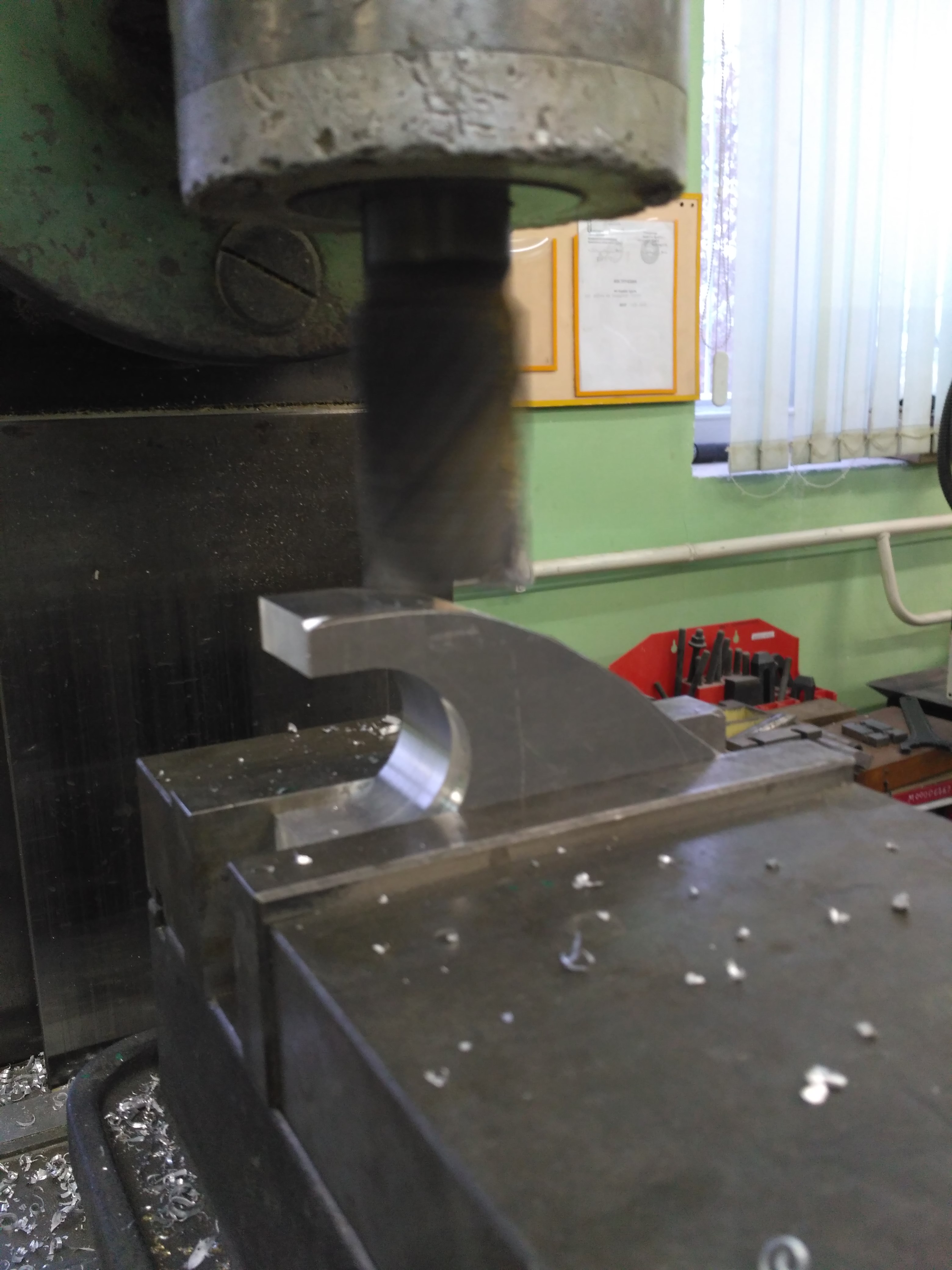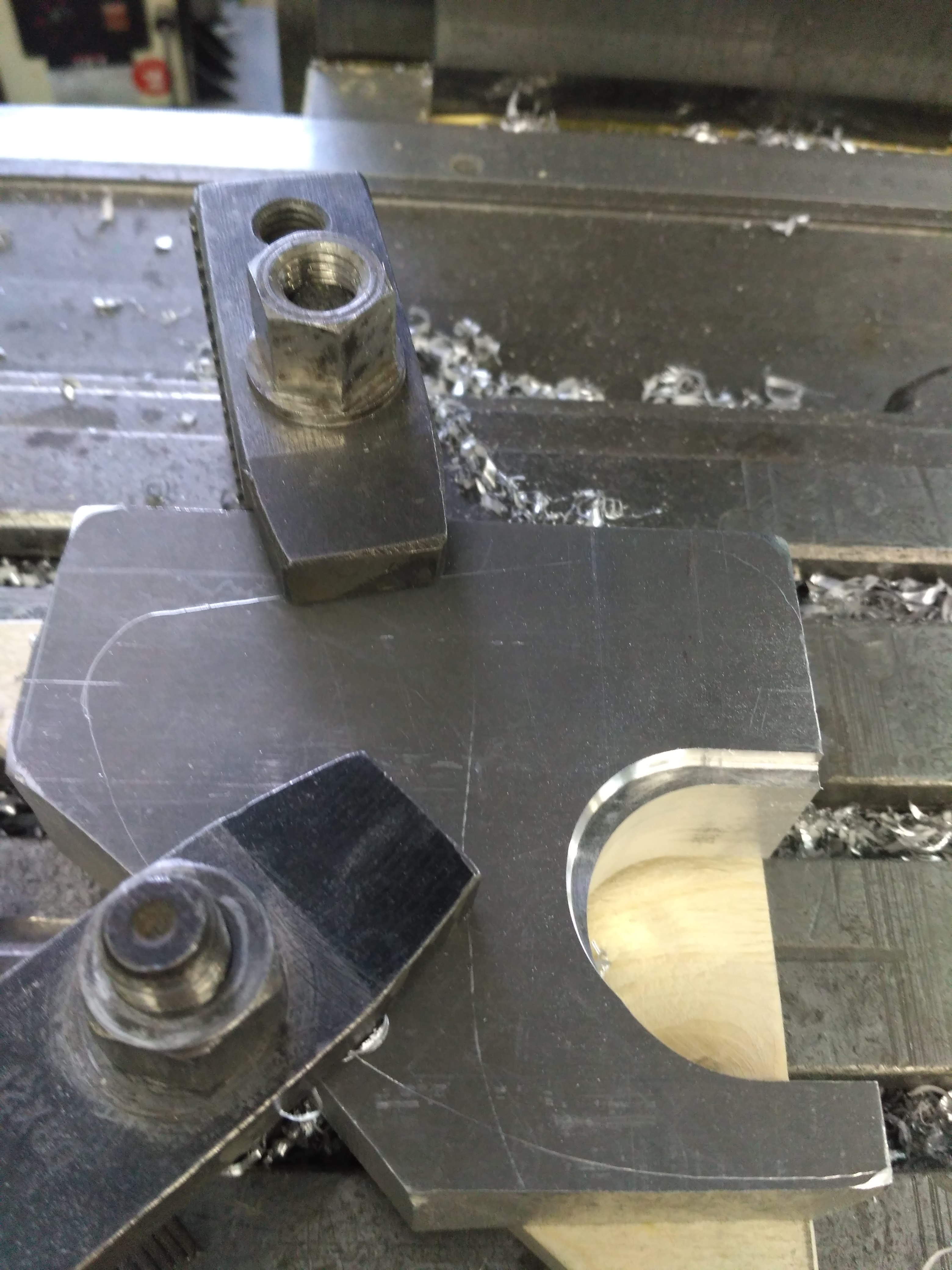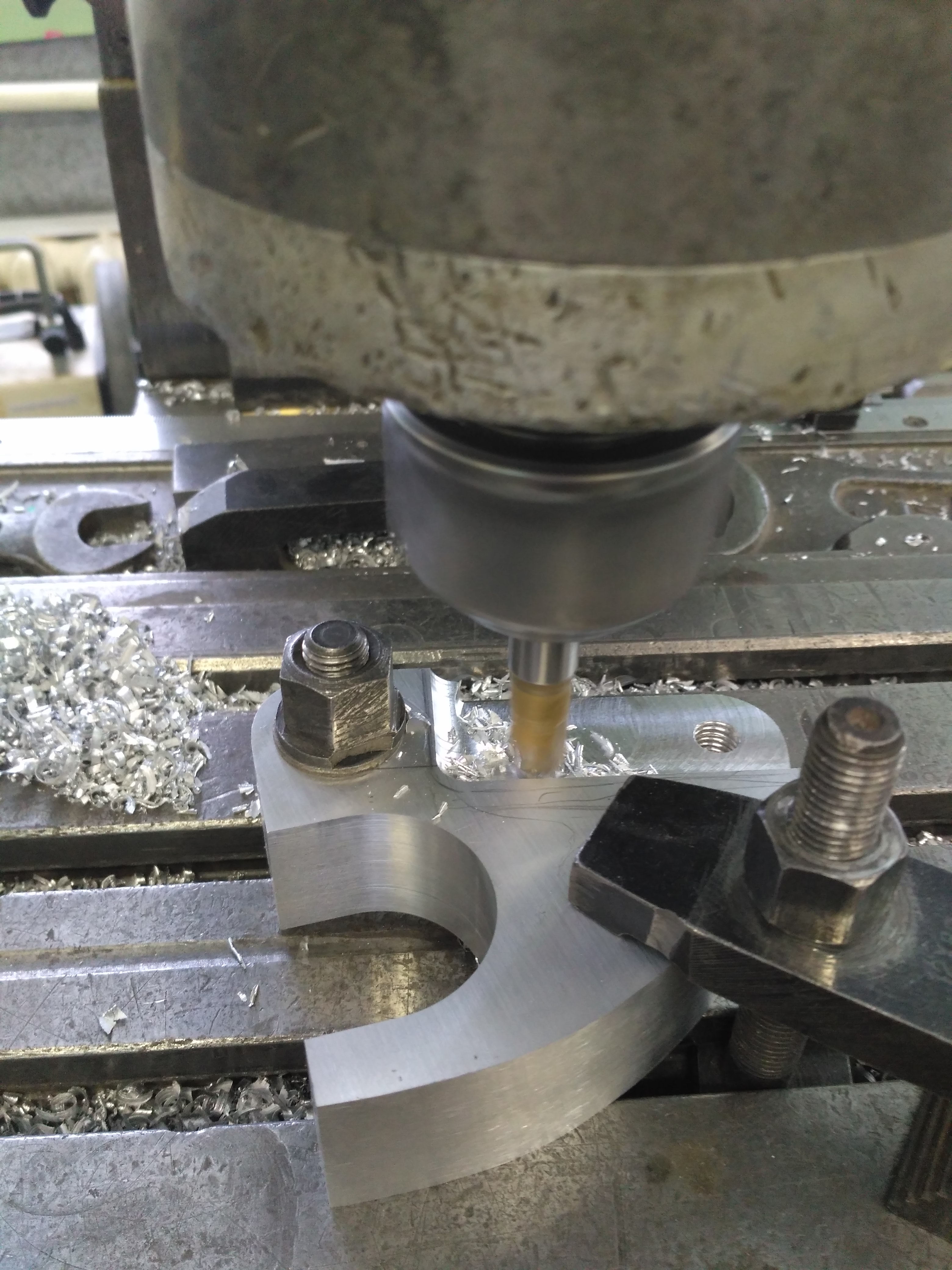 Снова закрепил деталь на стол фрезерного станка. Вырезал углубление, в которое будет прятаться корпус амортизатора. Сначала уже знакомой торцевой фрезой, потом маленькой фасонной, которая оставляет после себя галтель радиусом 5 мм.