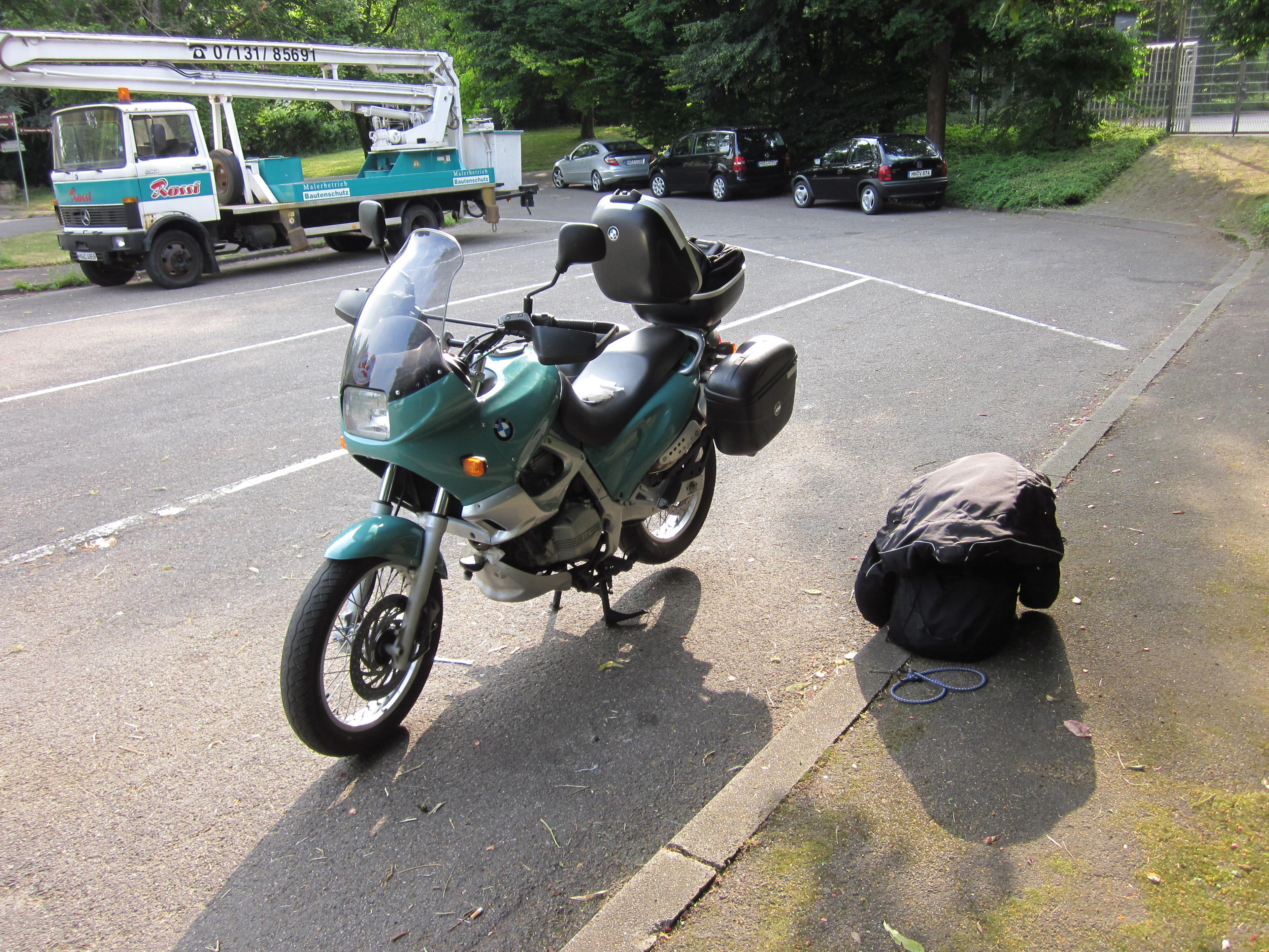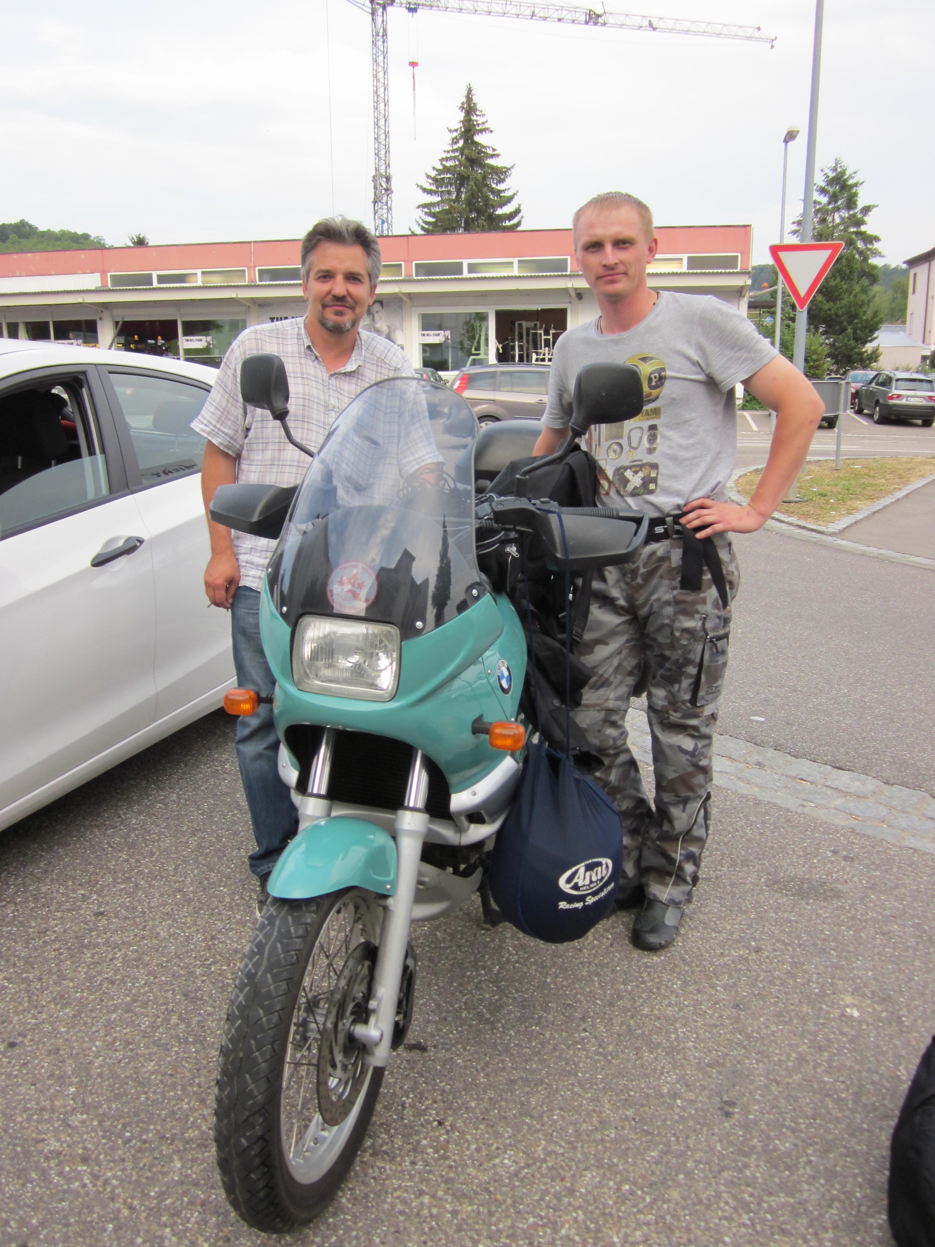 По прилёту в Штуттгарт я встретился с соотечественниками, которые помогли мне забрать мотоцикл (купить его и проверить документы), оформить страховку и приобрести транзитный номерной знак, а также приобрести расходники (масло ДВС, фильтры, колодки и смазку для цепи) и поменять их перед дальней дорогой. Мне бы это было сложно с моим французским.