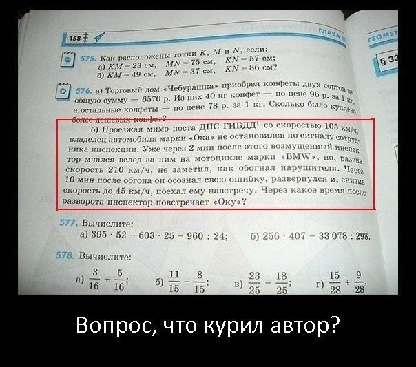 Инспектор, двигаясь со скоростью 45 км/ч, через 7 минит не увидел автомобиль Оку во встречном напрвлении. Сделав вывод, что он опять пропустил Оку из виду, инспектор развернулся и опять со скоростью 210км/ч начал нагонять, по его мнению, Оку, которая, как мы знаем, уже давно съеба***сь в ином направлении.
