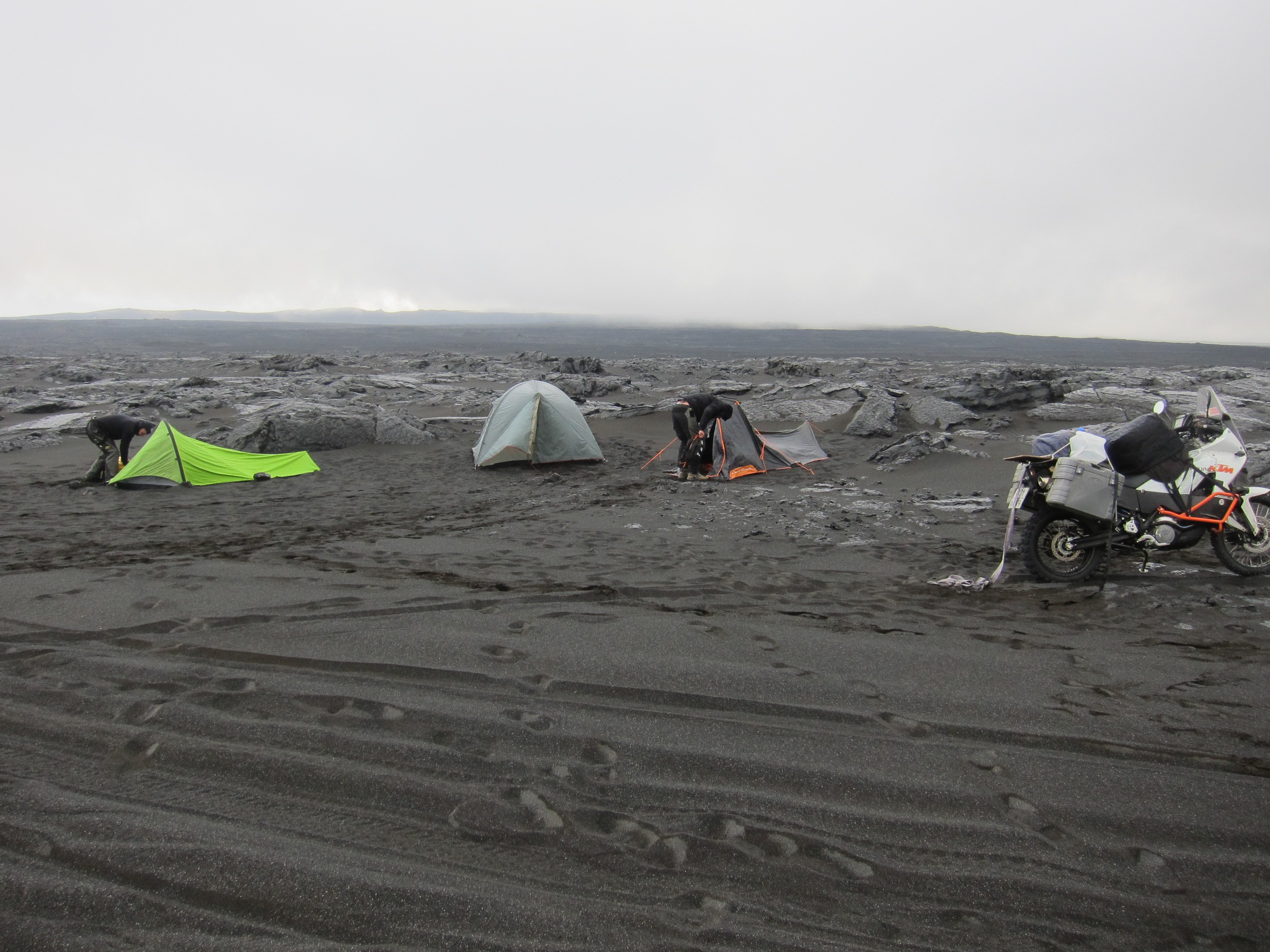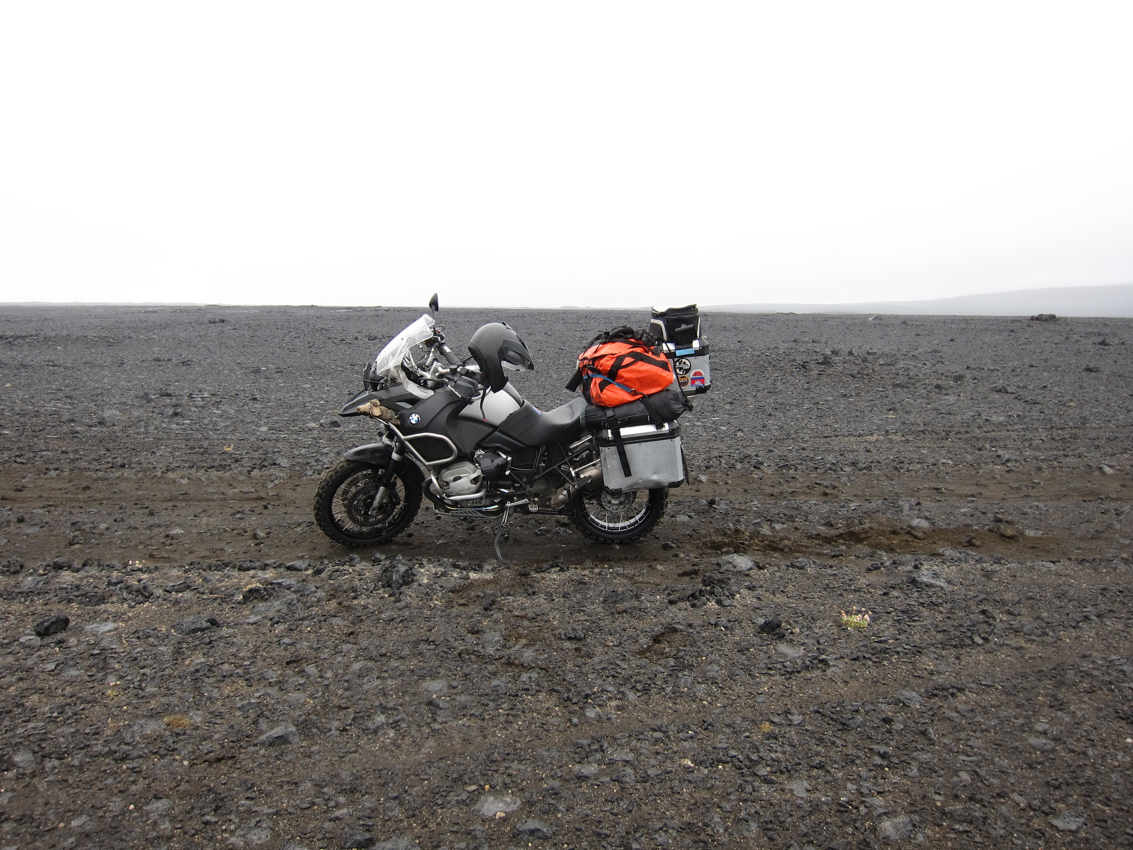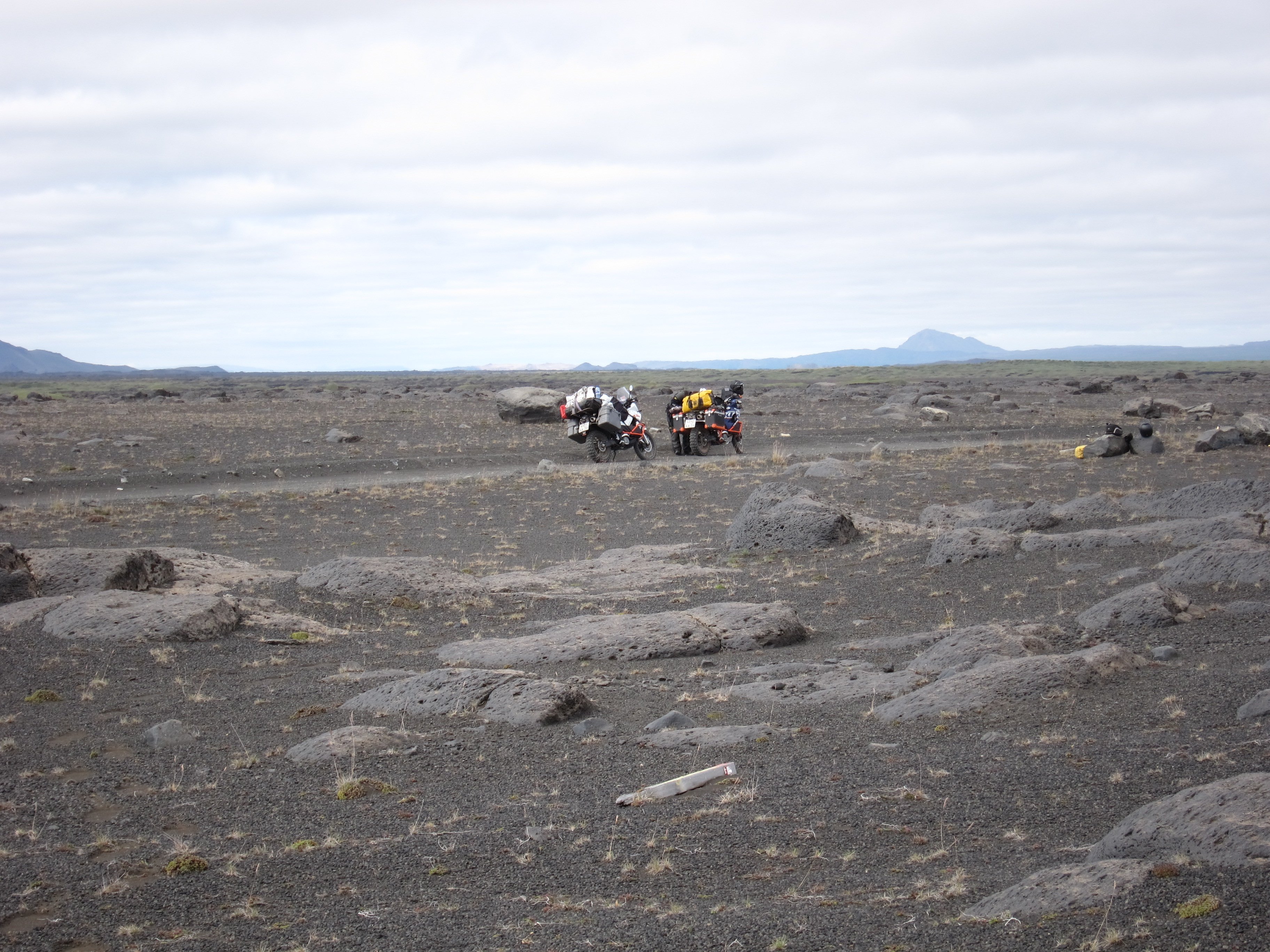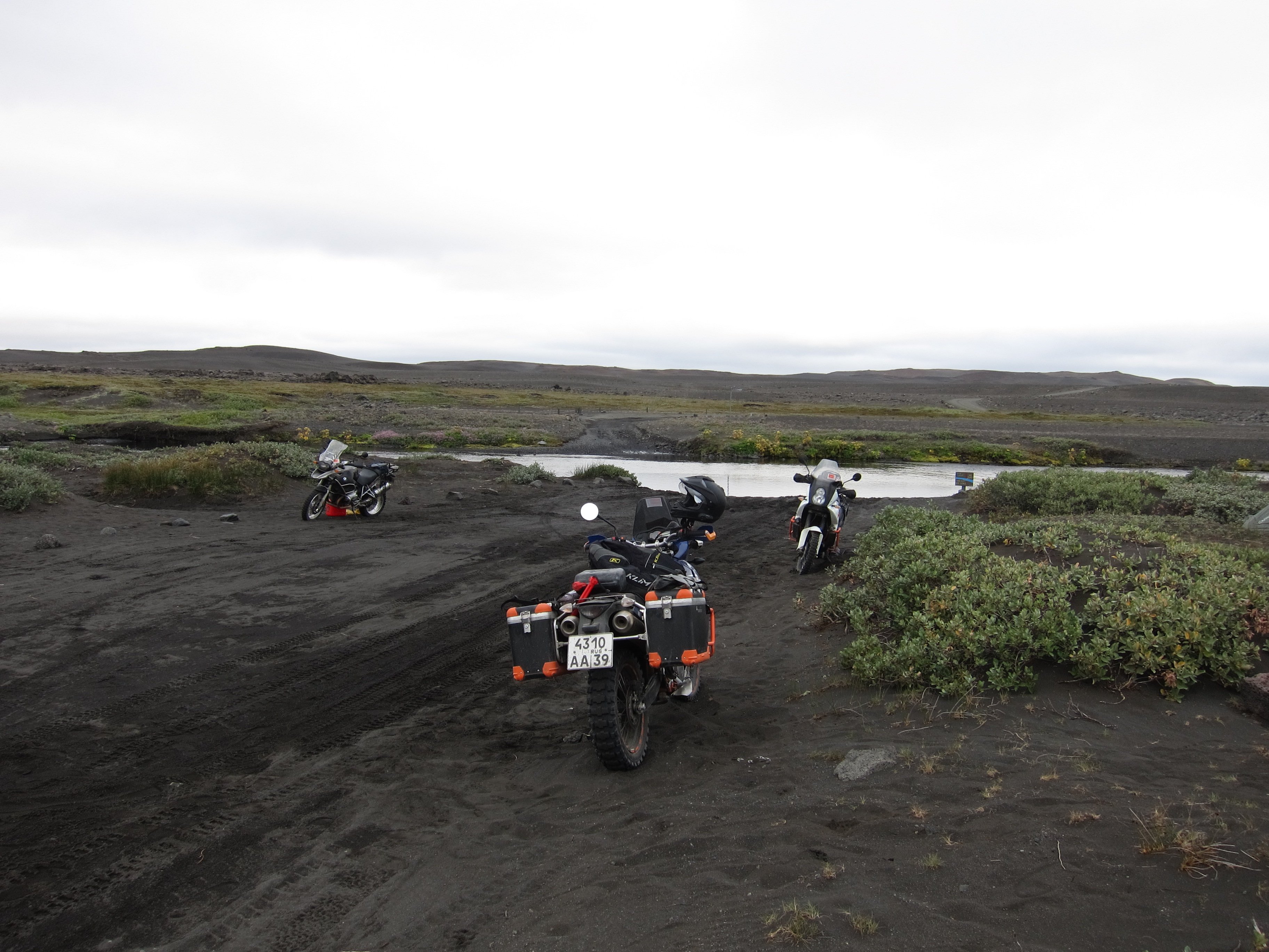 Дождался и опять в стойку и вперед.Все когдато кончается и вот уже впереди виден кемпинг у подножия плато вулкана.Приготовили то ли завтрак ,то ли обед,проглотили и решили двигать к кратеру.Решить то решили,но КТМщики огорошили-у них в баках,бензина на дне,и заправок в радиусе 100 километров не наблюдалось.КТМ,хороший мотоцикл,но под нагрузкой и на малых оборотах,расход вырос ,чуть ли не вдвое.Юрасик отправился на переговоры с персоналом кемпинга.Исландские барышни вошли в положение российских бродяг и под залог номеров кредитки и гарантий возврата ,щедрой рукой отлили нам 20 литров.От кемпинга до подхода к кратеру проложена почти нормальная дорога с парой мелких бродов,а дальше километра четыре,пешеходки.Делать нечего,решили топать,хоть и не привычные мы ногами шаркать. Гора Аскья (Askja) - 1510 м. Это впечатляющего вида вулкан, который высится непосредственно над лавовым плато Оудаудахрёйн (Odadahraun). Название его происходит от исландского слова, означающего "кратер", и жерло вулкана служит главной достопримечательностью горы. Аскья (Askja) возникла около 10 тыс. лет назад, однако воронка кратера сформировалась лишь в ходе мощного извержения 1875 г. Магматическая камера вулкана, изрыгнув в воздух громадное количество газов и пепла, больше не могла поддерживать вес горы в середине - и верхушка Аскьи обвалилась, образовав кратер. Затем он наполнился водой, и образовалось озеро, которое можно увидеть там и сейчас.