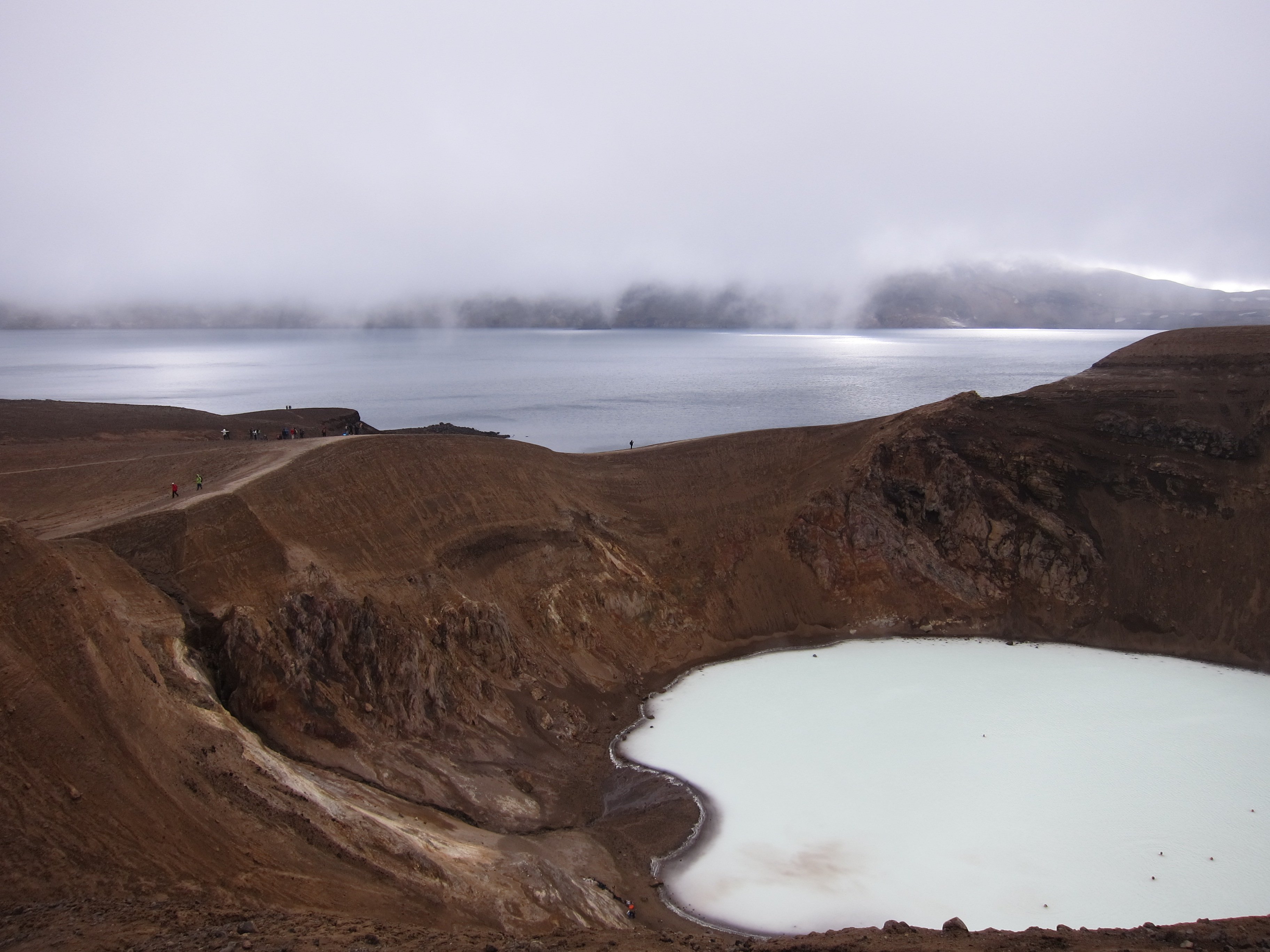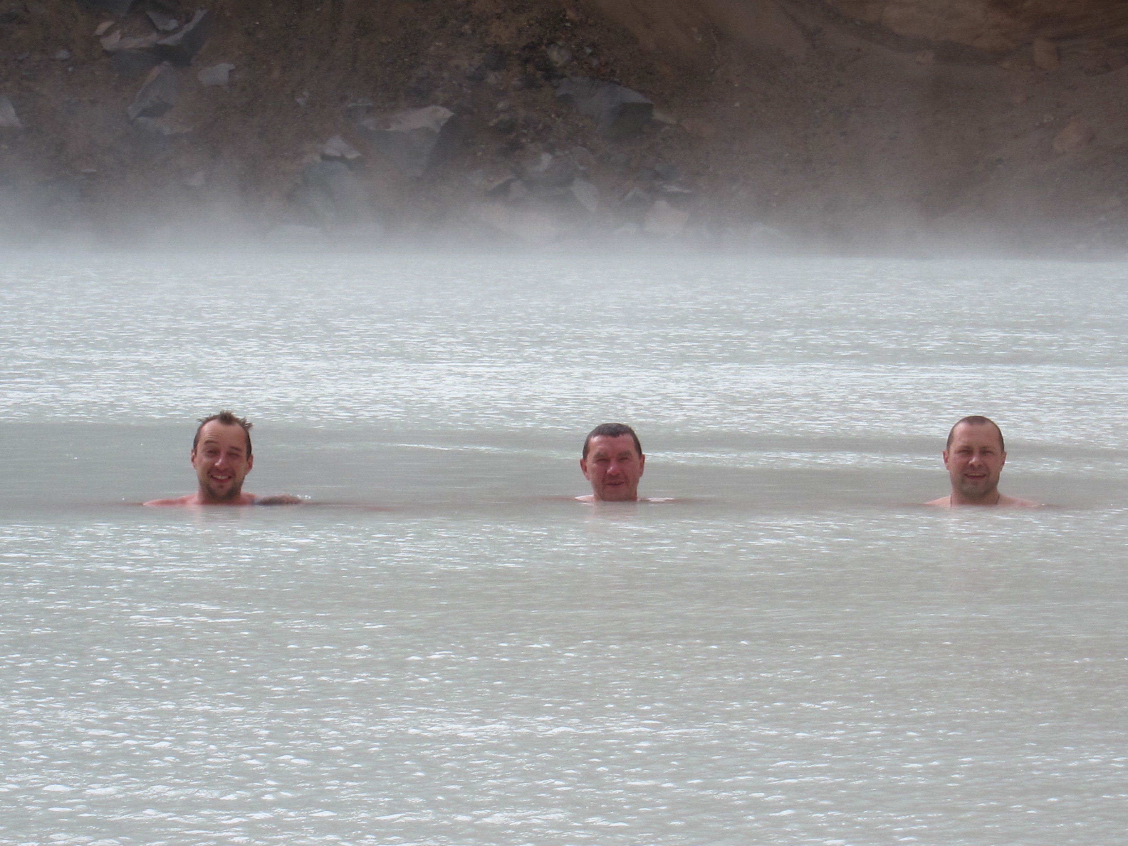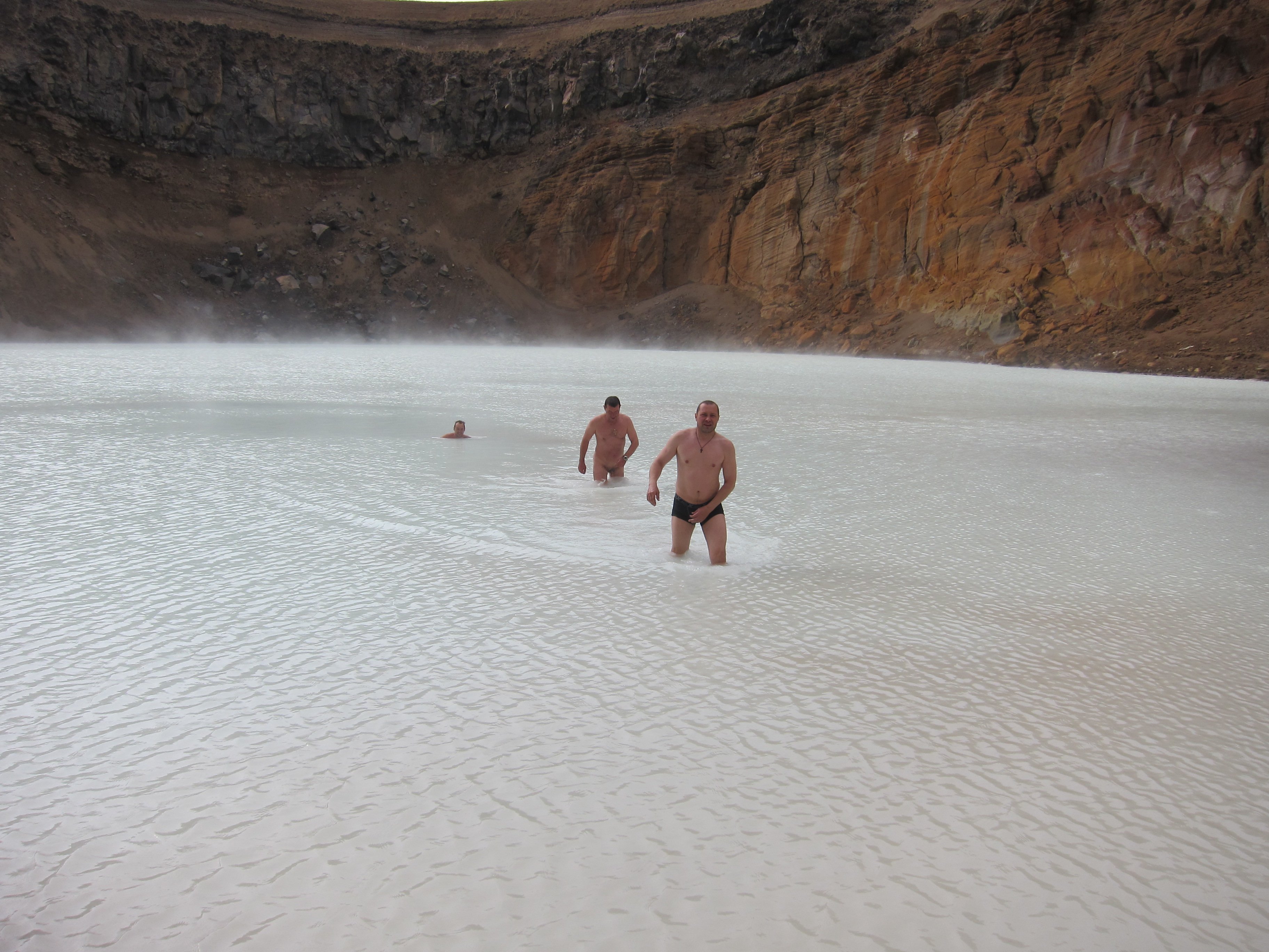 Озеро Эскьюватн (Oskjuvatn) является сегодня самым глубоким в Исландии (220 м), а его воронка считается одной из самых больших в мире. Вулкан Аскья (Askja) по-прежнему активен - озеро в нем становится все глубже, а последнее полноценное извержение было отмечено в 1961 г. Вити (Viti – по-исландски «ад») – геотермальное озеро на северном берегу Эскьюватна, диаметром около 100 м и глубиной около 7 метров. Вода в озере молочно-голубая, её температура колеблется от 20 до 27 С. Вокруг озера чувствуется сильный запах серы, который и привел к получению озером его нынешнего названии. Какойже не мытый русский ,пройдет мимо теплой воды.Слезли по осыпи вниз и тут же занырнули.