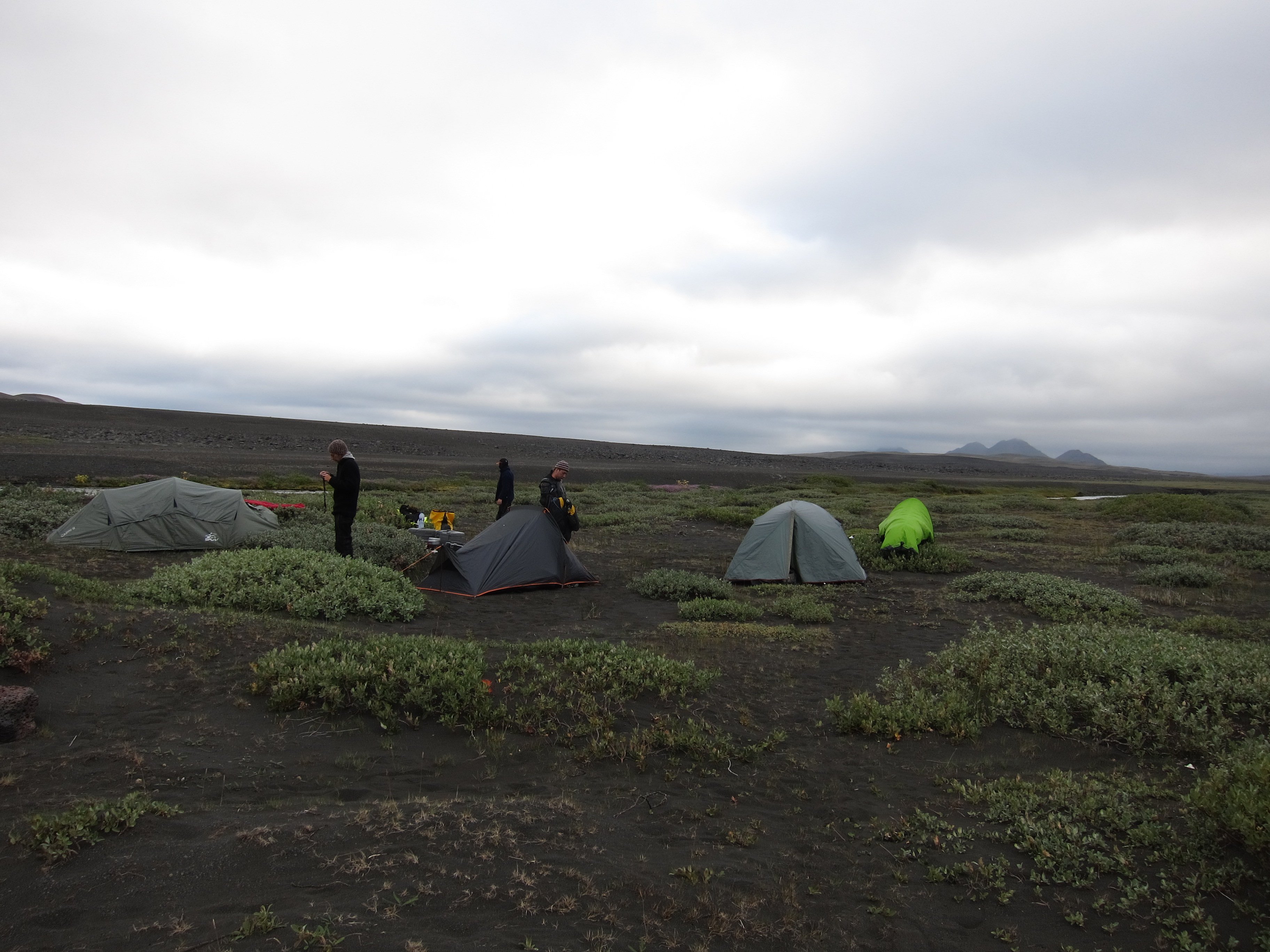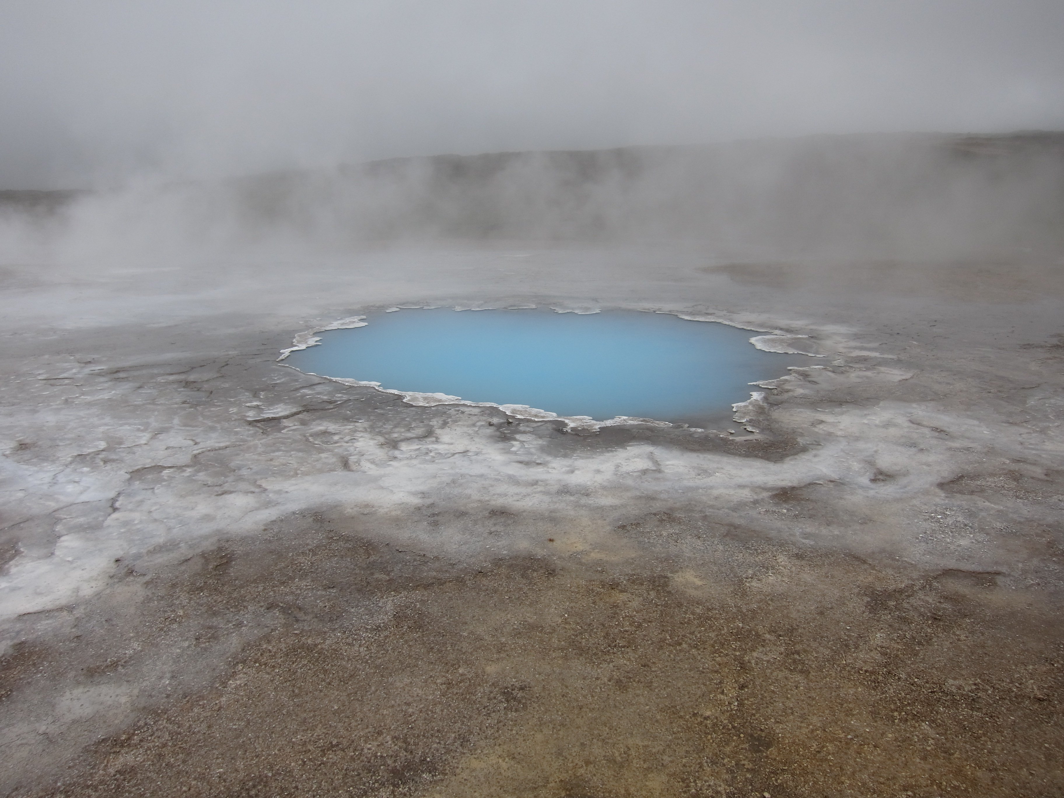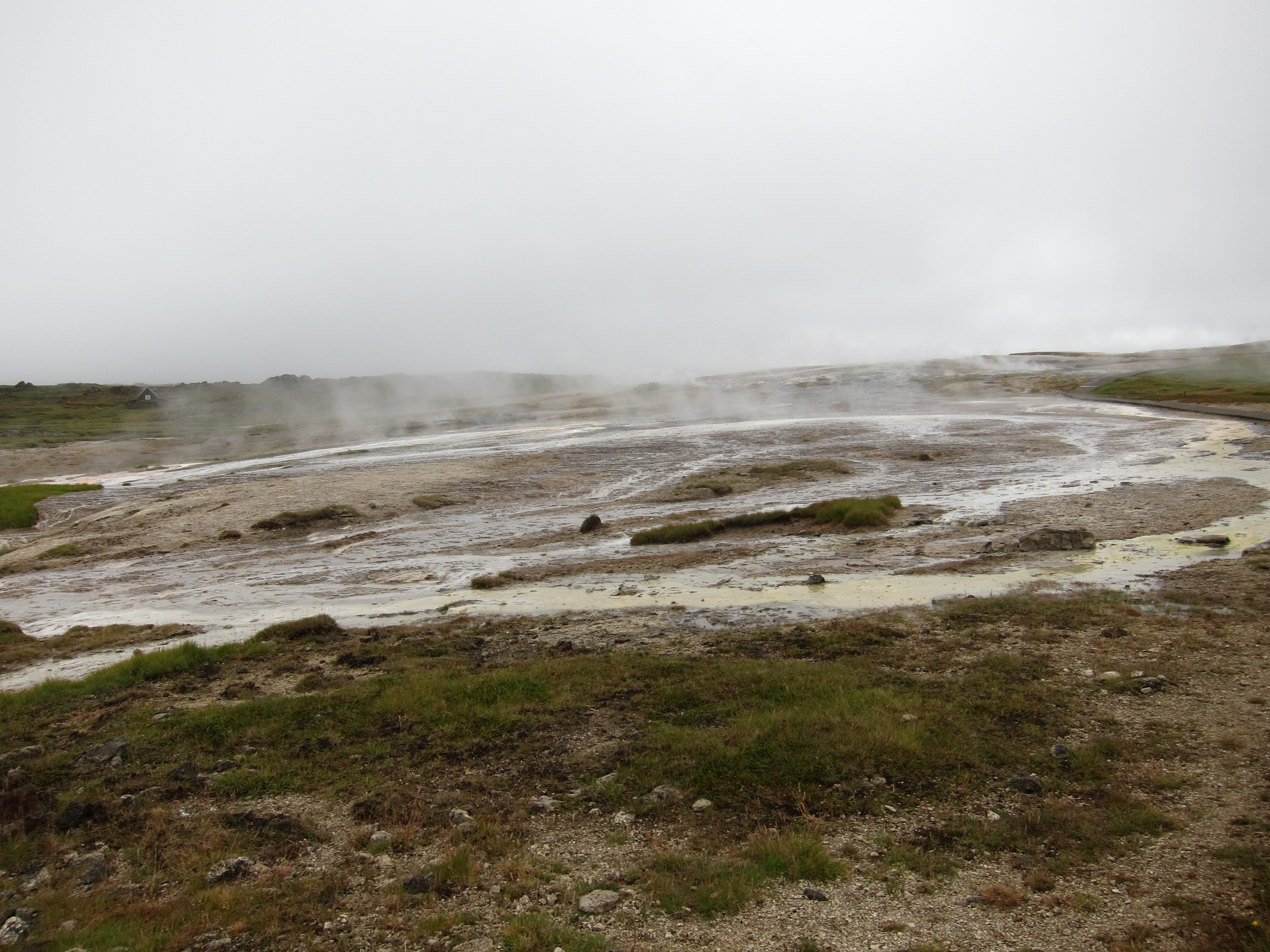 Несмотря ,на то ,что рядом располагалось большое количество отелей и кемпингов ,готовых принять и обогреть ,было принято решение уходить опять в глубь острова ,но теперь уже по дороге №35 ведущей на северо –запад ,и там уже где ни будь заночевать. Поехали .И вот марш-бросок к центру страны – в Хверавеллир (Hveravellir) - долину горячих источников - уникальный природный заповедник, расположенный посреди западного высокогорья между ледниками Langjokull и Hofsjokull.Земля пыхала грязью и горячим паромГлавные достопримечательности – спокойное, молочно-голубое геотермальное озеро Блахвер (Blahver) и Оскурхольсфер (Oskurholshver) или «кричащий источник» - гейзер, из которого бьет струя свистящего пара.Туд же был и небольшой кемпинг ,правда с баром ,который мы вечером и посетили