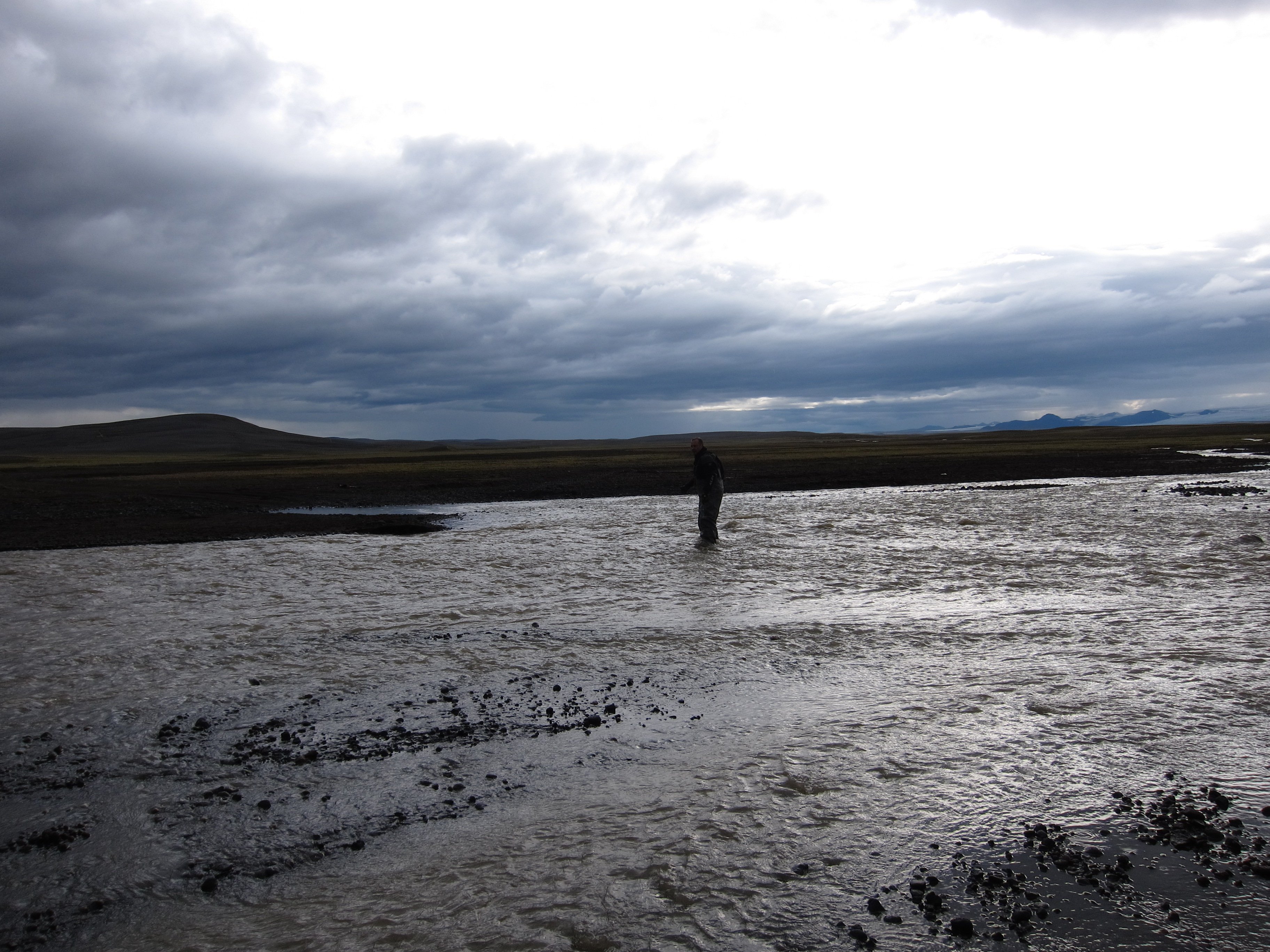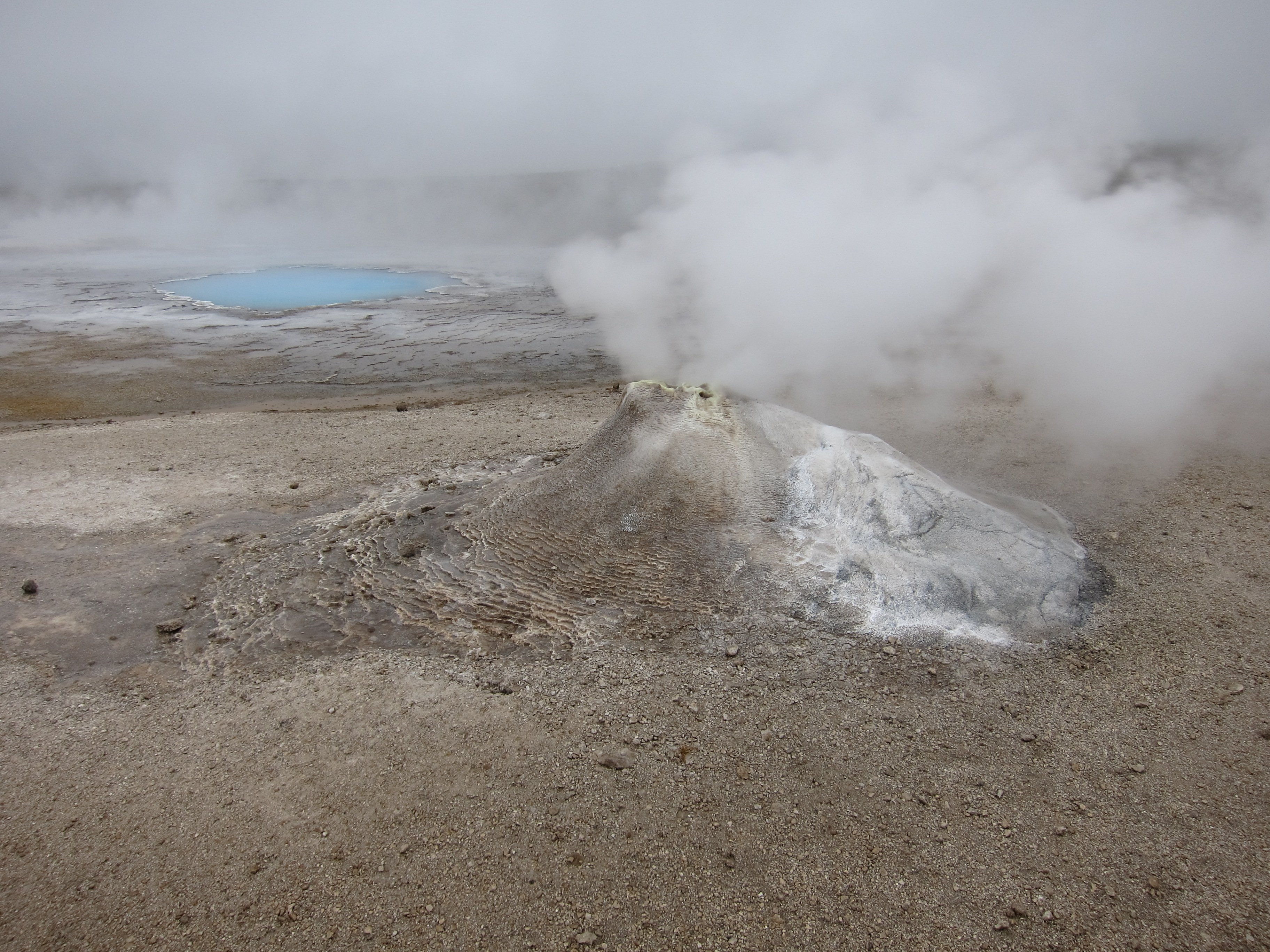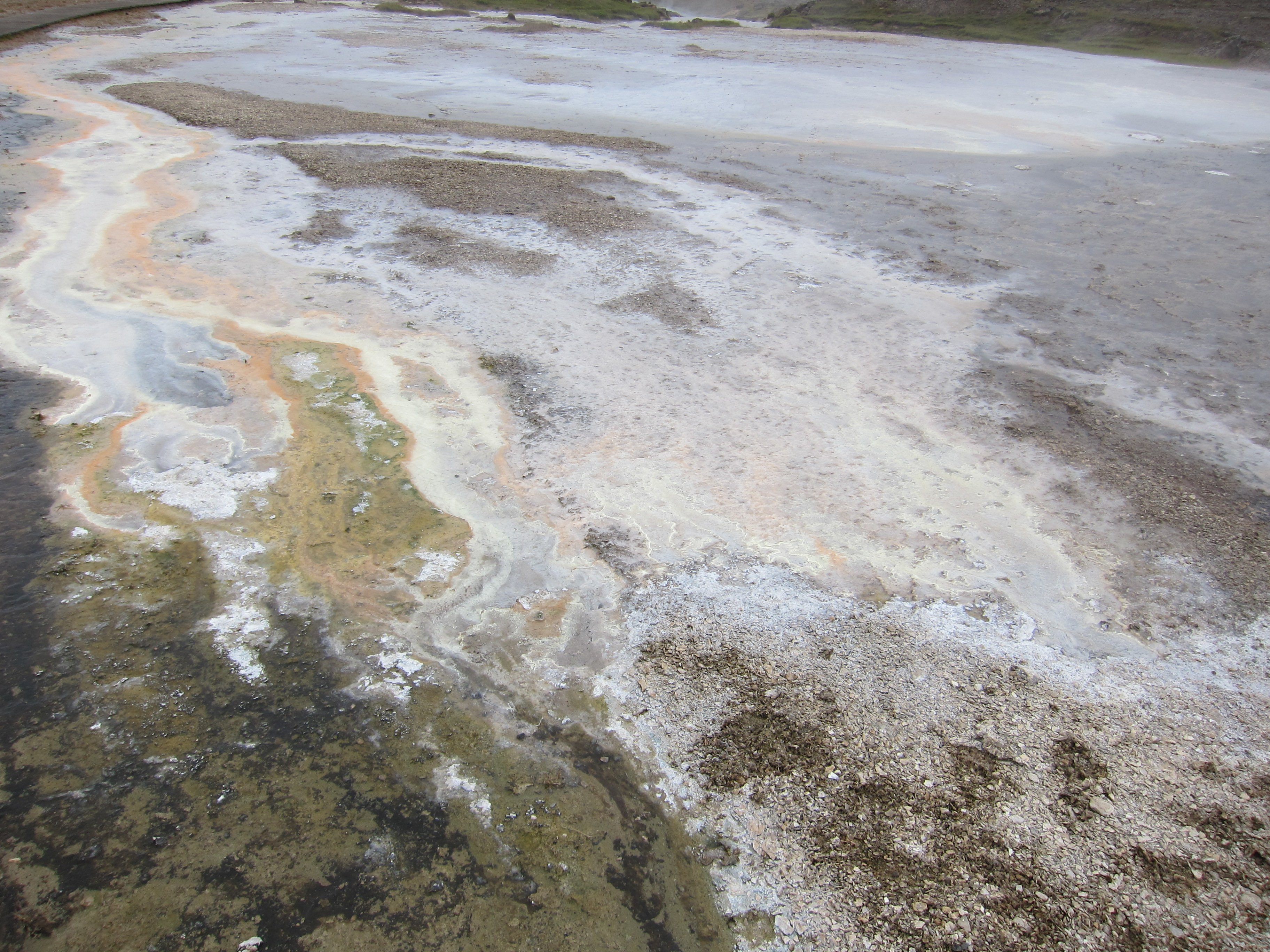 Несмотря ,на то ,что рядом располагалось большое количество отелей и кемпингов ,готовых принять и обогреть ,было принято решение уходить опять в глубь острова ,но теперь уже по дороге №35 ведущей на северо –запад ,и там уже где ни будь заночевать. Поехали .И вот марш-бросок к центру страны – в Хверавеллир (Hveravellir) - долину горячих источников - уникальный природный заповедник, расположенный посреди западного высокогорья между ледниками Langjokull и Hofsjokull.Земля пыхала грязью и горячим паромГлавные достопримечательности – спокойное, молочно-голубое геотермальное озеро Блахвер (Blahver) и Оскурхольсфер (Oskurholshver) или «кричащий источник» - гейзер, из которого бьет струя свистящего пара.Туд же был и небольшой кемпинг ,правда с баром ,который мы вечером и посетили