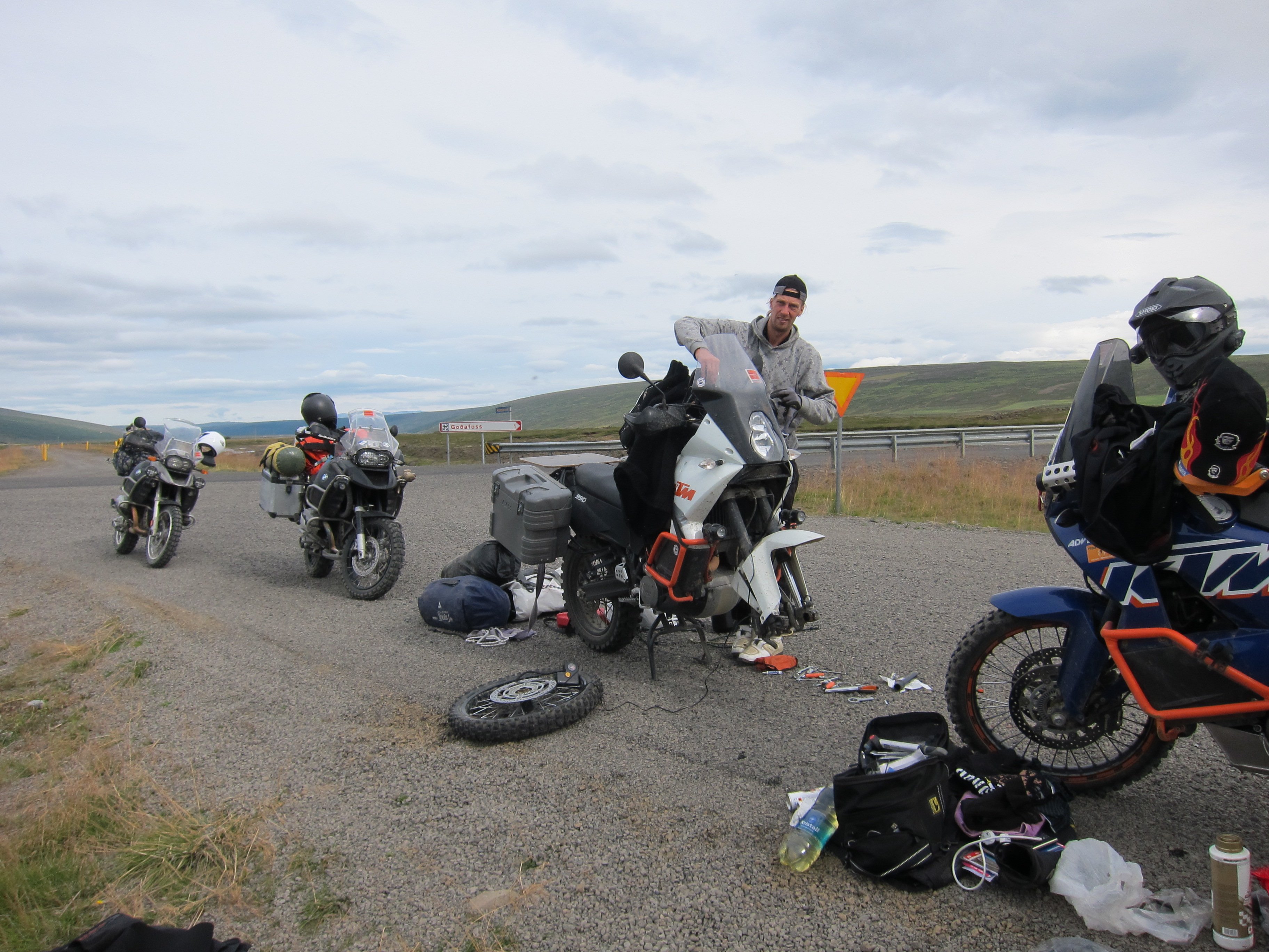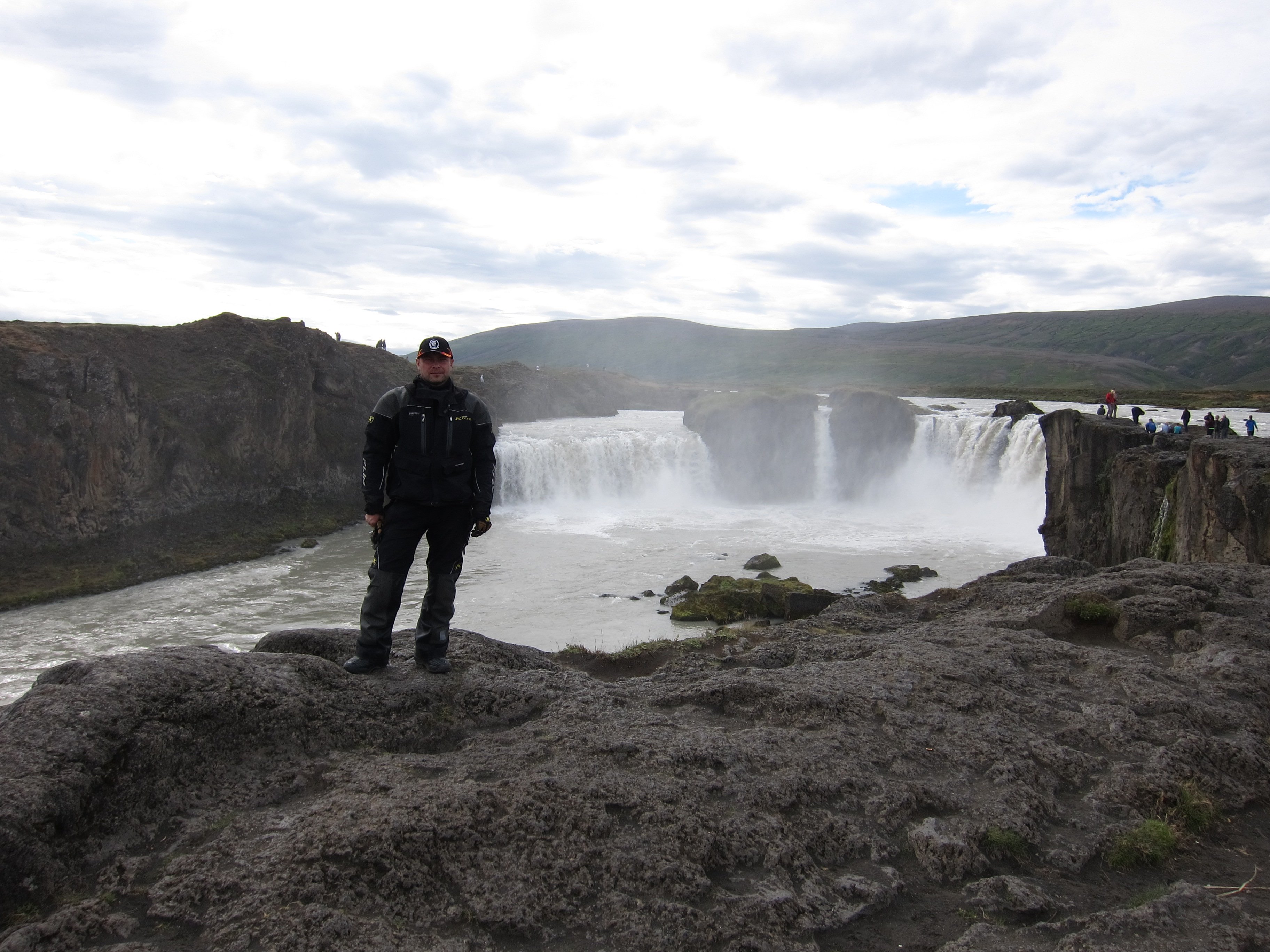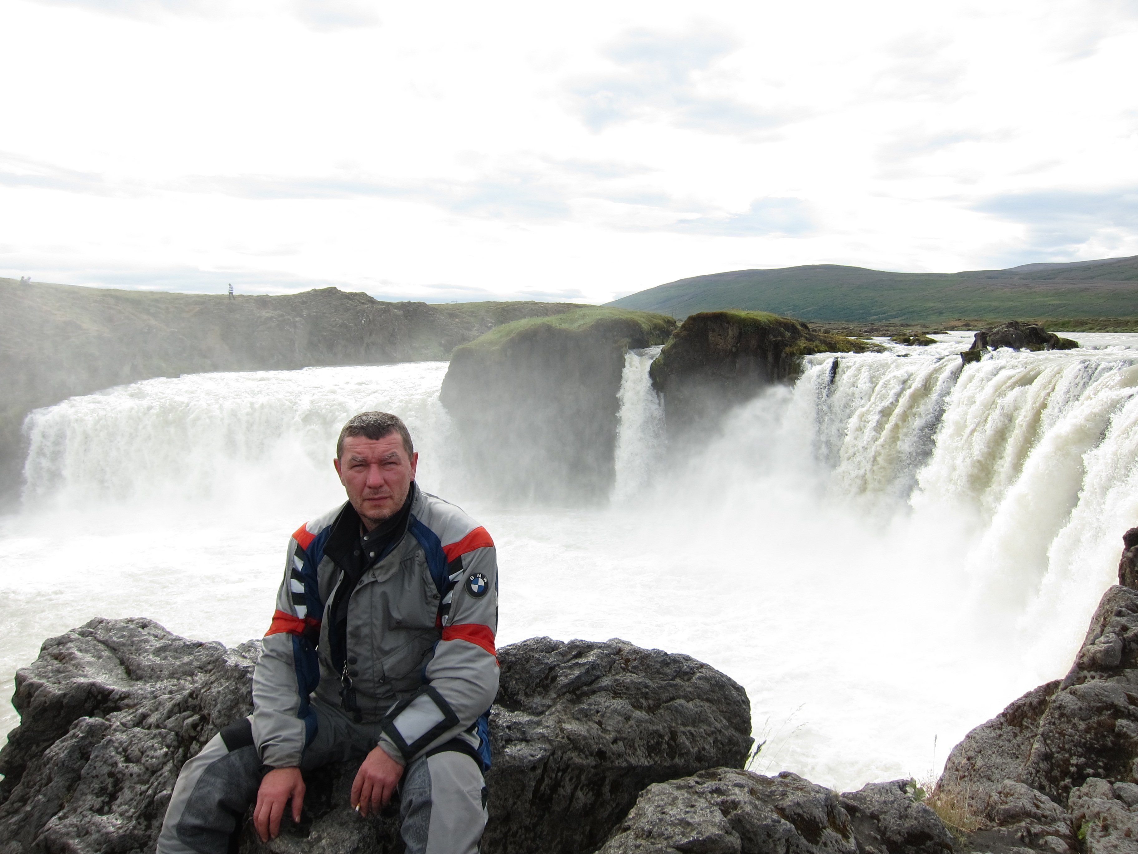 Утром ,подъем был нетороплив , лица слегка помяты , но настроение бодрое . Погибель в песках уже забылась и мятущиеся души требовали новых приключений . Не быстро собравшись и глянув на карту ,намечаем маршрут . Решаем выйти на дорогу №1 ,доехать до водопада Годафосс и уже после него ,уйти в горы ,выйти на дорогу F 26 и уже по ней доехать до ледников расположенных в центре острова.Честно говоря ,я не совсем понимал ,зачем нам туда надо , ибо Викпедия не сообщала о наличии в этих местах ,каких либо исторических либо природных достопримечательностей ,и я начал потихоньку понимать ,что попал в стаю маньяков которым по хрену куда ехать ,лишь бы дорога была похуже ,а лучше ,чтобы ее ,вообще не было. И ,что страшнее всего ,я догадывался ,что походу ,они меня «укусили» и это заразно. Мне уже было все равно ,что почти новенький ГСА ,стал похож на ободранный и обшарпанный забор ,наплевать на измятые и текущие по всем стыкам кофры , на оторванный и примотанный скотчем ветровик.Как то сам по себе рассосался страх от езды по камням ,размером с мою голову ,по скользким тропинкам проходящим иногда по краю обрывов. В голове только крутилась мысль ,которую я повторял не раз на сложных участках «кто ссыт,тот гибнет»,добавляя при этом газу.Оставляя это лирическое отступление ,хочу только сказать-Маньяки-я вас всех люблю и мне вас не хватает.До водопада долетели быстро ,посмотрели-меня не торкнуло. Хотя и говорят,что Годафосс является одним из самых известных и красивых водопадов Исландии.Водопад Годафосс переводится как «Водопад Богов», и такое название он приобрел более тысячи лет тому назад. Одна из версий такова: в 999-1000 годах жители Исландии приняли христианство и сбросили в водопад языческих идолов, которым они поклонялись; другая такова: По велению местного языческого жреца над водопадом долгое время стояли деревянные фигурки богов, и водопад получил свое имя благодаря им.Водопад не отличается огромными размерами, его высота 12 метров, а ширина – 30, однако облако брызг поднимается достаточно высоко .Ну да ладно ,галочку поставили.Не успели отъехать ,как встает Град-кончилось давление в переднем колесе.Пока он клеил камеру ,мы валялись на обочине ,попутно давая ценные советы.