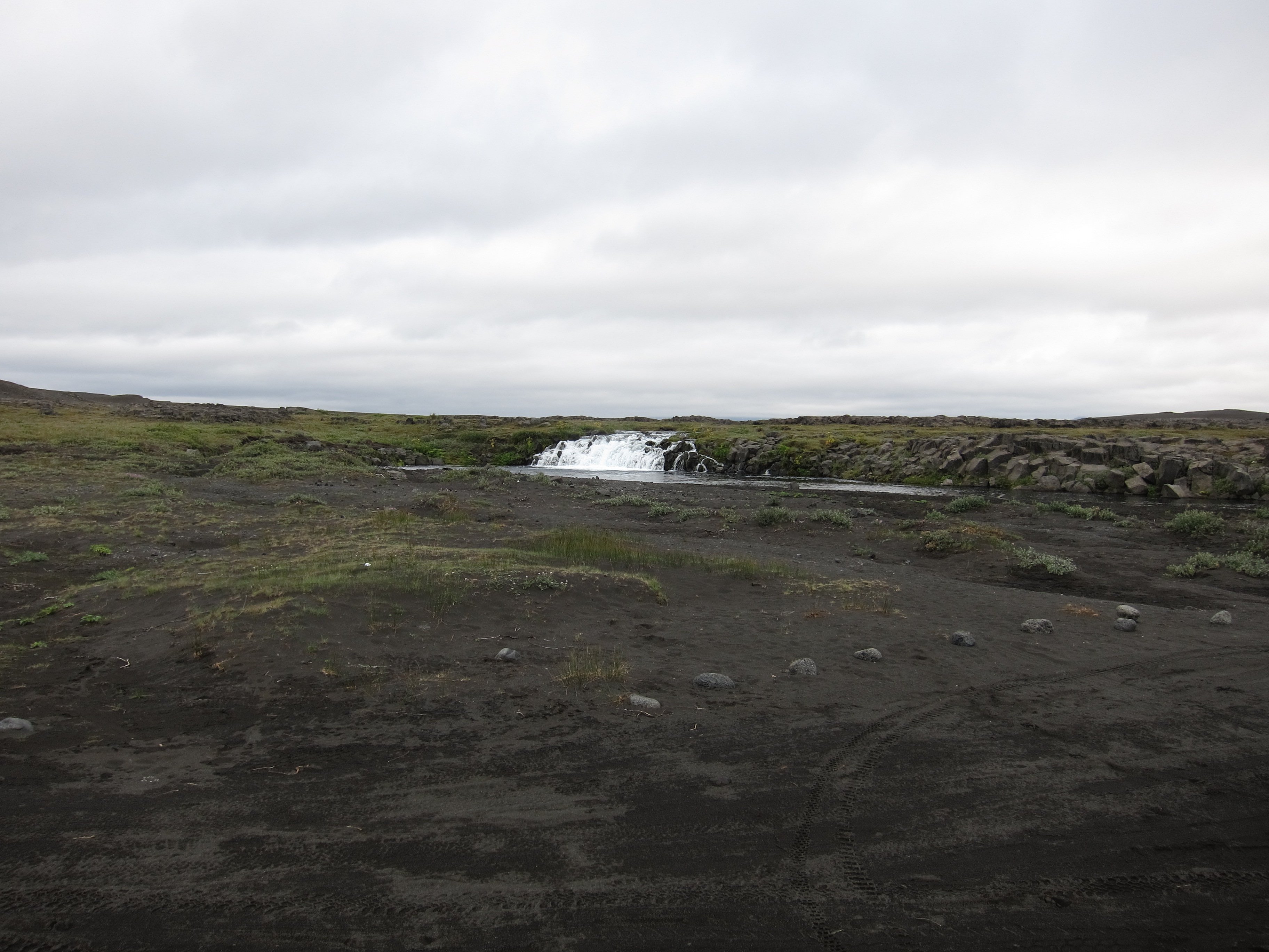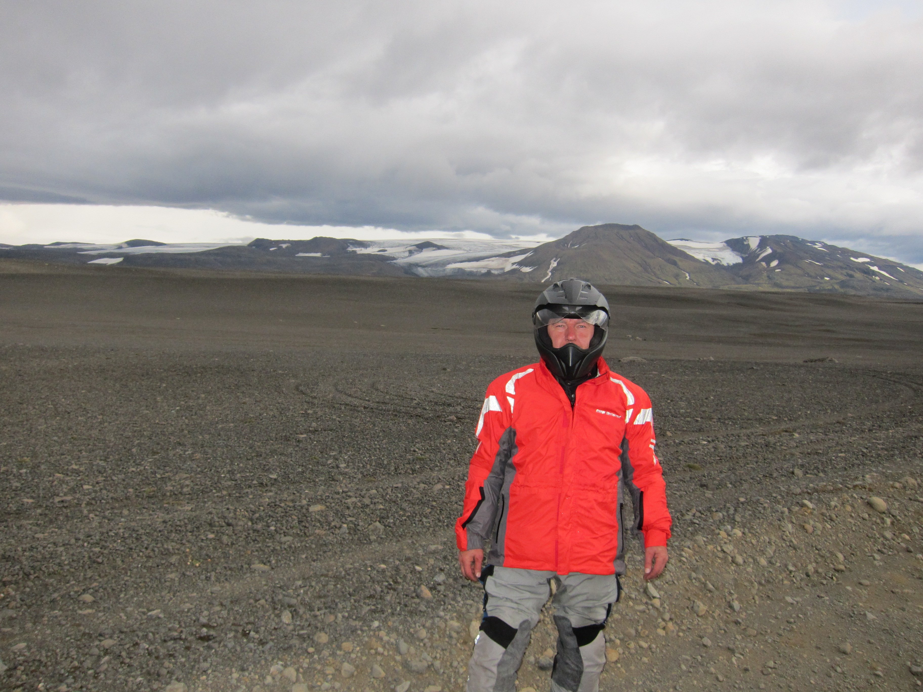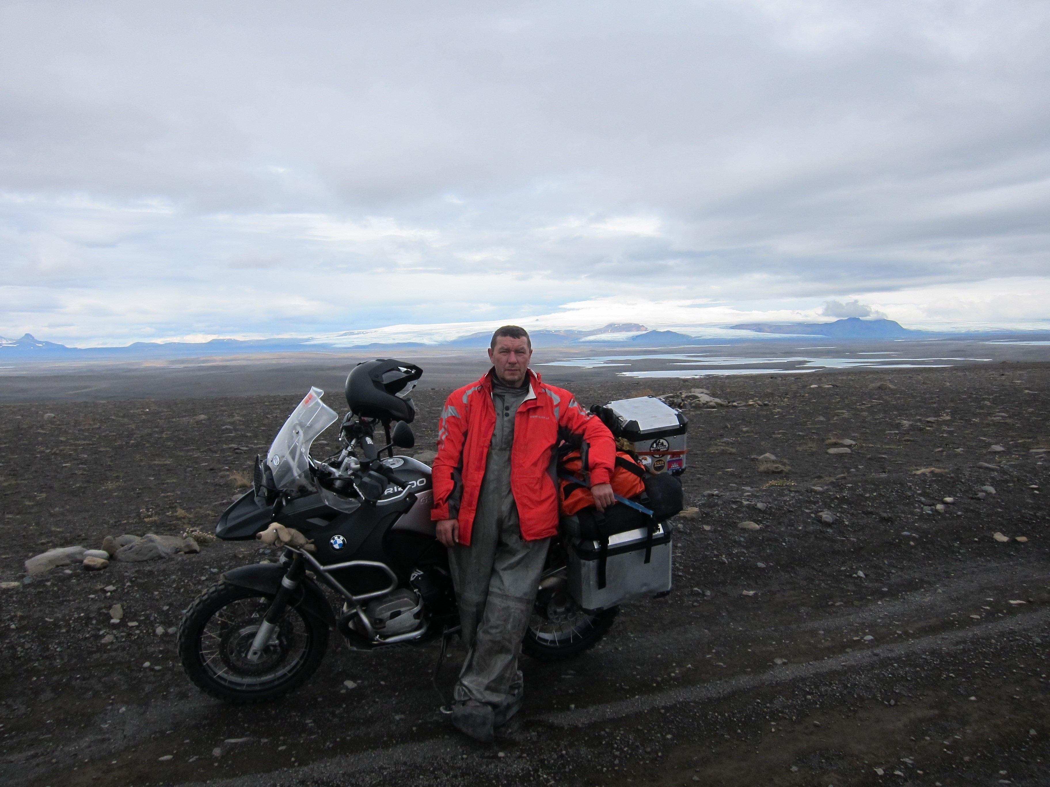 Утром ,подъем был нетороплив , лица слегка помяты , но настроение бодрое . Погибель в песках уже забылась и мятущиеся души требовали новых приключений . Не быстро собравшись и глянув на карту ,намечаем маршрут . Решаем выйти на дорогу №1 ,доехать до водопада Годафосс и уже после него ,уйти в горы ,выйти на дорогу F 26 и уже по ней доехать до ледников расположенных в центре острова.Честно говоря ,я не совсем понимал ,зачем нам туда надо , ибо Викпедия не сообщала о наличии в этих местах ,каких либо исторических либо природных достопримечательностей ,и я начал потихоньку понимать ,что попал в стаю маньяков которым по хрену куда ехать ,лишь бы дорога была похуже ,а лучше ,чтобы ее ,вообще не было. И ,что страшнее всего ,я догадывался ,что походу ,они меня «укусили» и это заразно. Мне уже было все равно ,что почти новенький ГСА ,стал похож на ободранный и обшарпанный забор ,наплевать на измятые и текущие по всем стыкам кофры , на оторванный и примотанный скотчем ветровик.Как то сам по себе рассосался страх от езды по камням ,размером с мою голову ,по скользким тропинкам проходящим иногда по краю обрывов. В голове только крутилась мысль ,которую я повторял не раз на сложных участках «кто ссыт,тот гибнет»,добавляя при этом газу.Оставляя это лирическое отступление ,хочу только сказать-Маньяки-я вас всех люблю и мне вас не хватает.До водопада долетели быстро ,посмотрели-меня не торкнуло. Хотя и говорят,что Годафосс является одним из самых известных и красивых водопадов Исландии.Водопад Годафосс переводится как «Водопад Богов», и такое название он приобрел более тысячи лет тому назад. Одна из версий такова: в 999-1000 годах жители Исландии приняли христианство и сбросили в водопад языческих идолов, которым они поклонялись; другая такова: По велению местного языческого жреца над водопадом долгое время стояли деревянные фигурки богов, и водопад получил свое имя благодаря им.Водопад не отличается огромными размерами, его высота 12 метров, а ширина – 30, однако облако брызг поднимается достаточно высоко .Ну да ладно ,галочку поставили.Не успели отъехать ,как встает Град-кончилось давление в переднем колесе.Пока он клеил камеру ,мы валялись на обочине ,попутно давая ценные советы.