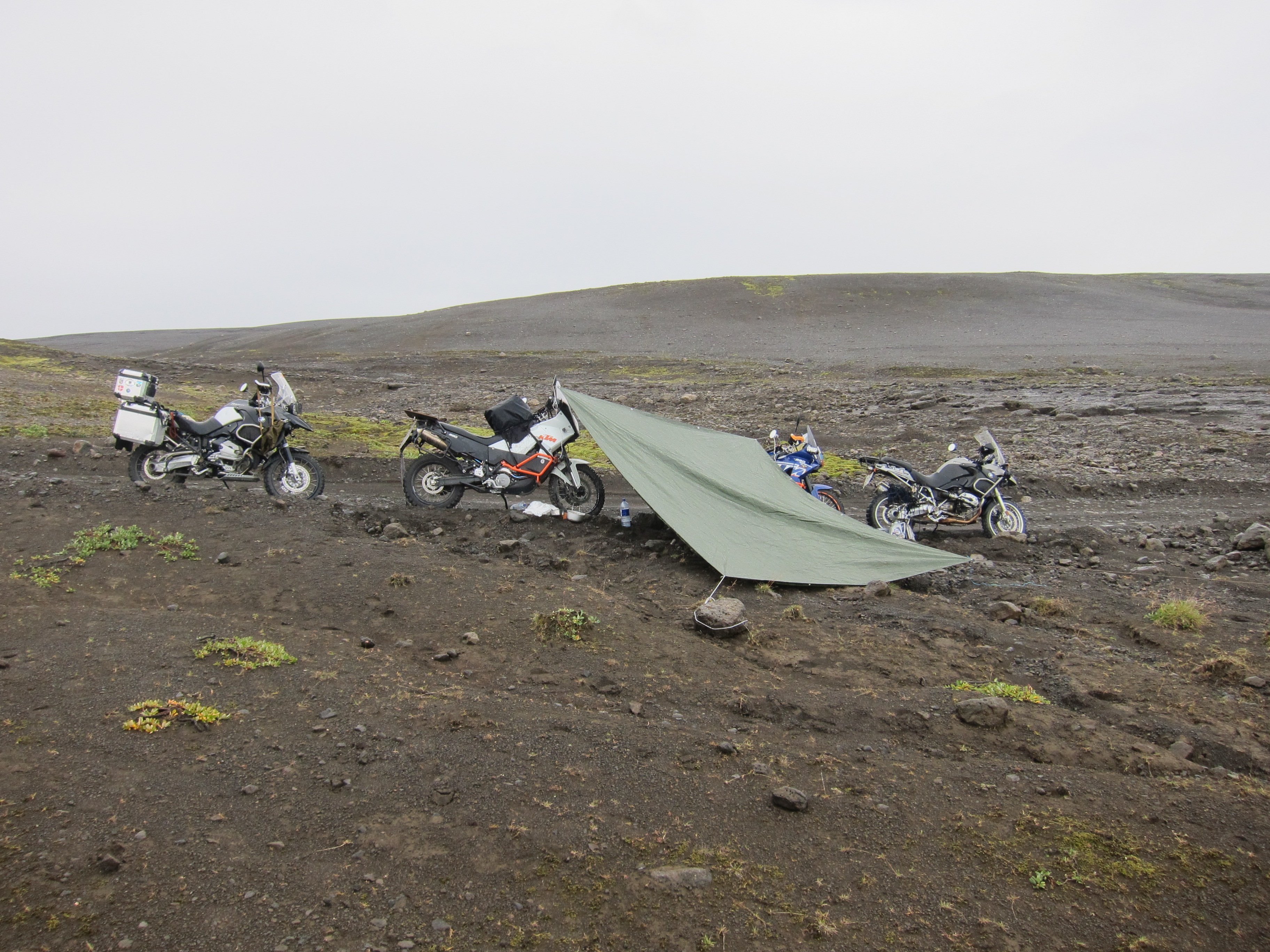 Починились ,поехали. Нормальный по началу грейдер ,кончился через десяток километров и натужно урча моторами ,мотики потащили нас в горы .И все началось сначала .Прыжки на камнях ,объезды выбоин ,небольшие ручьи и где то там ,в просветах туч ,ледник к которому нам –надо? Погода быстро портилась и вот уже из низко повисших туч ,зарядил нудный дождь .А еще через 20 километров и первая разлившаяся река текущая с ледника. Опять телепузики и промерка фарватера .Шноркель на гусе получил постоянную прописку ,глубина была не большой ,посему переправились быстро .Но река оказалась не последней .Следующая была уже пошире и состояла из множества рукавов .Но Юрасик ,почему то решив ,что там мелко попер ,через нее сходу .И проехал ,мотанувшись только на выходе ,но удержав мотоцикл .Глядя на это –Серега ,решается повторить и не доехав 10 метров ,валится в воду ,оказавшись под мотом .Б-ть .Кидаемся на помощь , поднимаем и выталкиваем на берег . Мотик изрыгает из себя поток воды .Оставляем обсыхать и уже потихоньку перекатываем оставшиеся два мотоцикла . Пробуем включить зажигание на утопленнике .Мертв .Подгоняем мой ,накидываем провода ,поворачиваем ключ .Мертв .Юрасик начинает дергать провода на аккуме. –болтаются ,не затянутые .Тянем .Зажигание .Есть контакт ,уже легче .Снимаем облицовки ,фильтр ,мокро. Хреново .Решаем вывернуть свечи и пробовать крутануть .Через десять минут поисков ,выясняется ,что свечника на БМВ у нас нет .Была не была ,решаем крутить .С третей попытки ,БМВ захлюпав носом и выпустив из глушака клубы белого дыма тихо и жалобно заурчал –Уроды ,что вы со мной делаете .В масляном окошке видна была белая субстанция ,мало похожая на масло .Вечерело и с неба ,продолжало лить .У реки было мокро а ближе к перевалу ,маячили просветы в сплошной череде туч .,решаем ехать ,туда где солнце .Но день ,походу был не наш .Солнце уходило ,дождь догонял и о чудо впереди показался какой то высокогорный кемпинг .Вот оно ,тепло ,люди .Как я ошибался .Манияки с ходу заявили-не формат и спать там не будем и вообще можно ехать , еще светло .Сууки .Едем . Находим какой то ,распадок ,ставим по дождю палатки ,Юрасик натягивает между мотиков тент и готовит еду ,я обидевшись на все и всех ,в одно горло жру виски .Нерадостный ужин,спать
