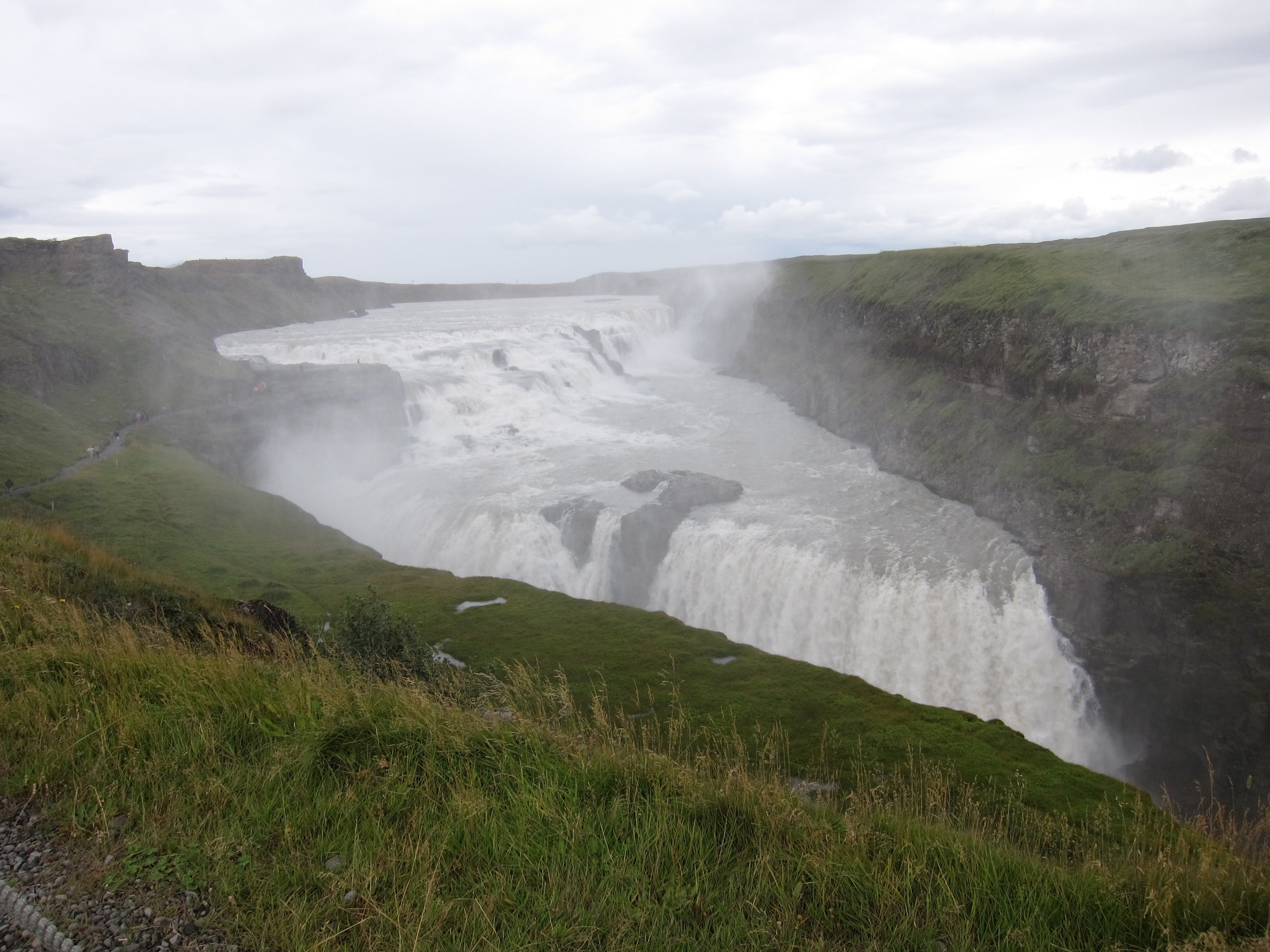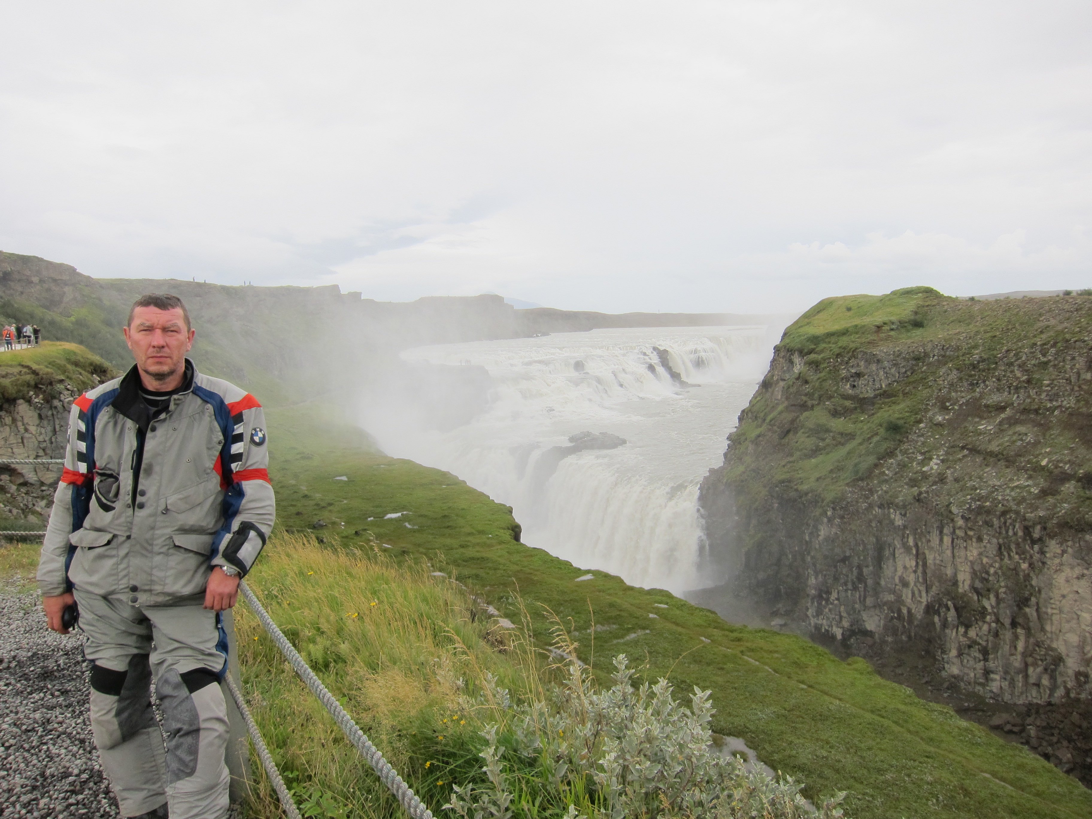 За ночь ,меня отпустило ,да и утро было без дождя .Покаялся перед братвою ,собрались и покатили ,на очередной перевал .На этот день целью был назначен водопад Гульфос и расположенная недалеко долина гейзеров .То ,что это была южная часть острова ,нас не смущало ,мы все равно в центре и какая разница куда ехать .Руки ,да и задница ,уже привыкли к постоянным прыжкам ,да и ехал ,я в основном в стойке ,по умному загружая ,то одну подножку ,то другую .Добрались до водопада без приключений . Гульфосс является примером формирования водопада, образованного вулканической деятельностью в ледниковый период . Вода реки имеет коричневатый оттенок. Золотой цвет водопад приобретает в солнечный день, когда водяная пыль, стоящая над каскадным водопадом образует сразу несколько радуг.