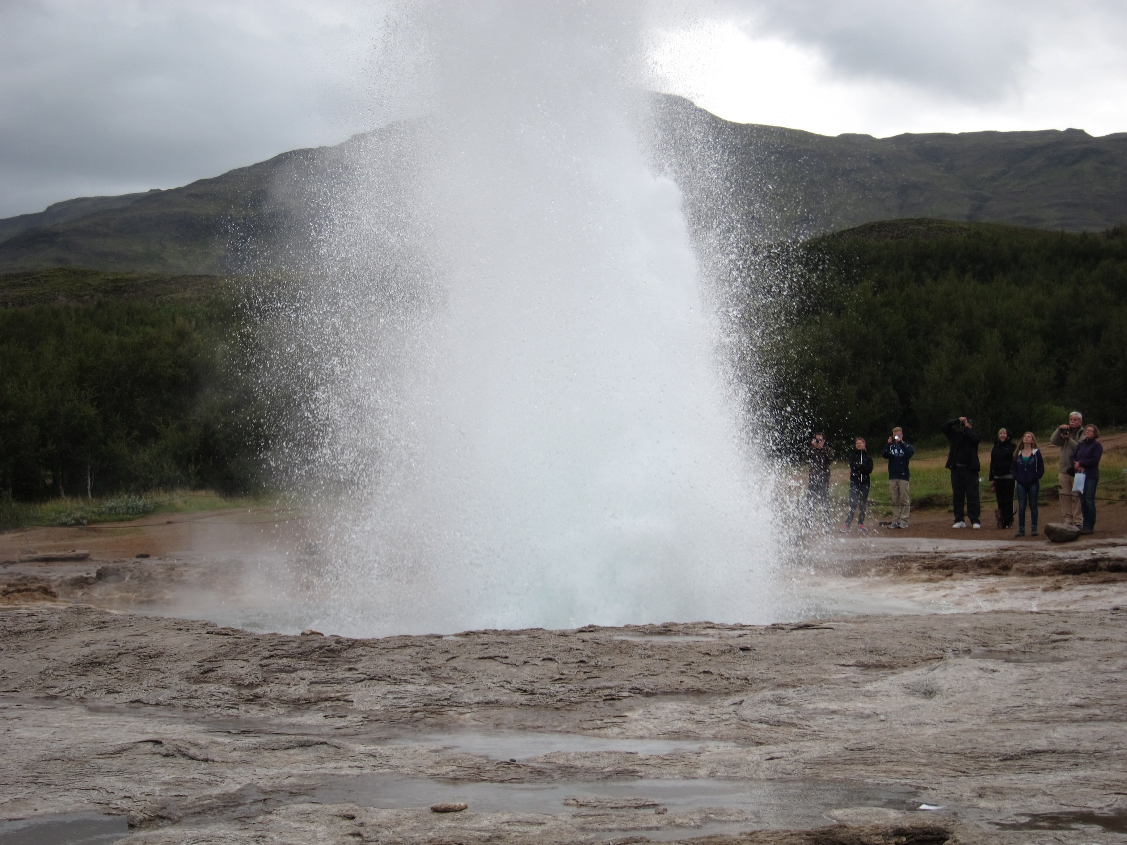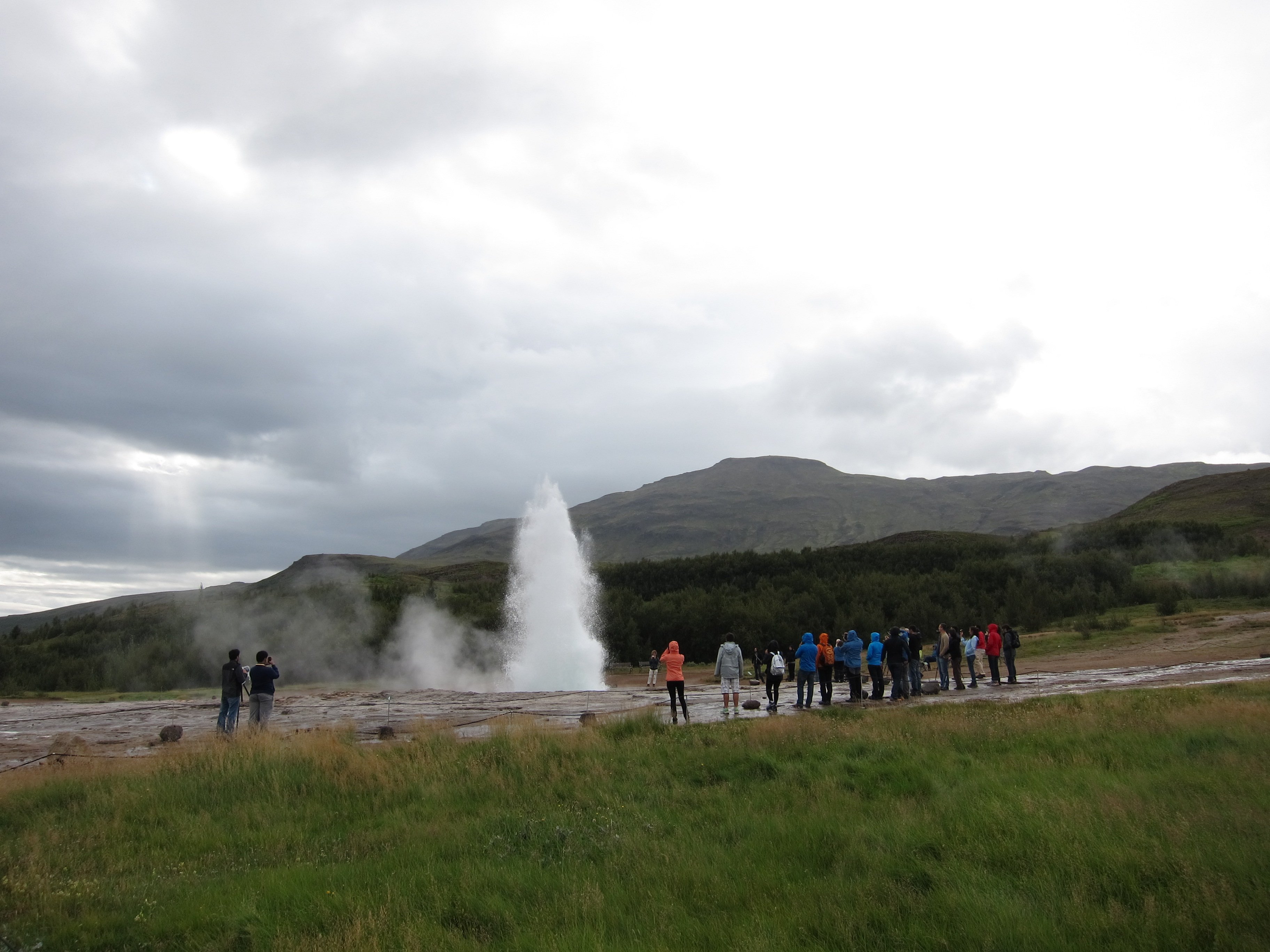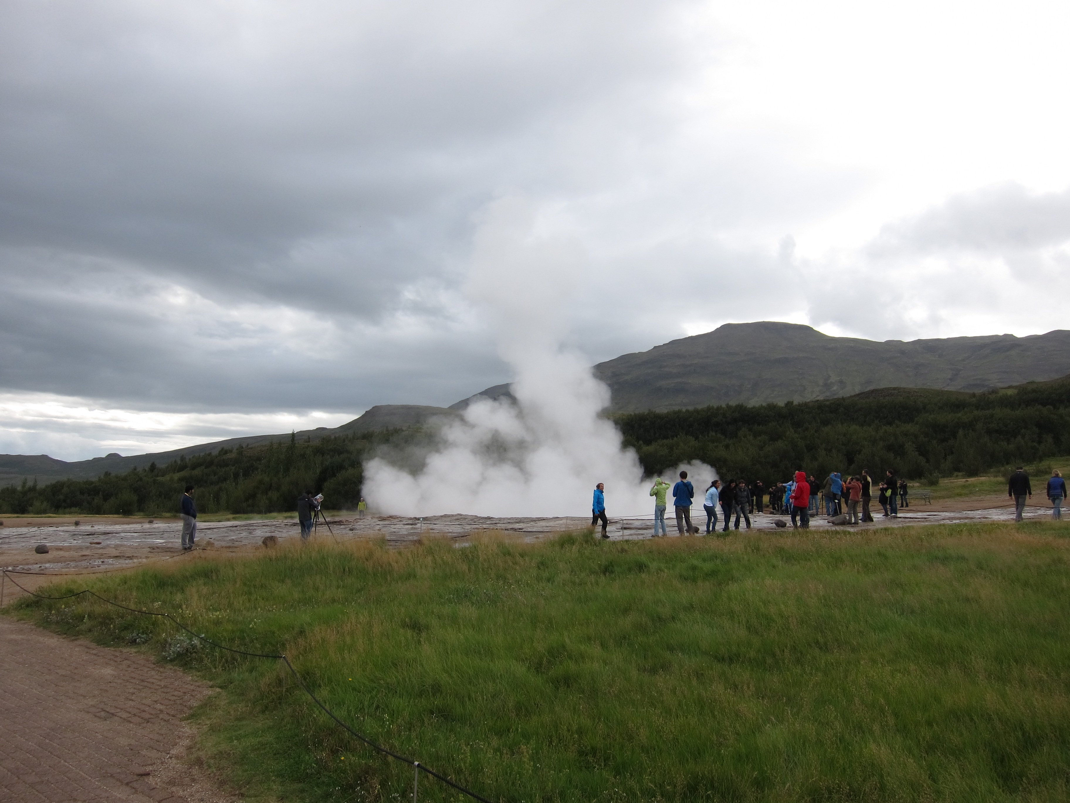 Налюбовавшись водопадом и закупившись сувенирами в рядом расположенном магазинчике ,рванули к гейзерам. Наиболее интересный из них гейзер Строккур (в переводе - маслобойка). Строккур проявляет активность каждые 5-10 минут, выбрасывая на поверхность горячий поток на высоту порядка 30 метров.