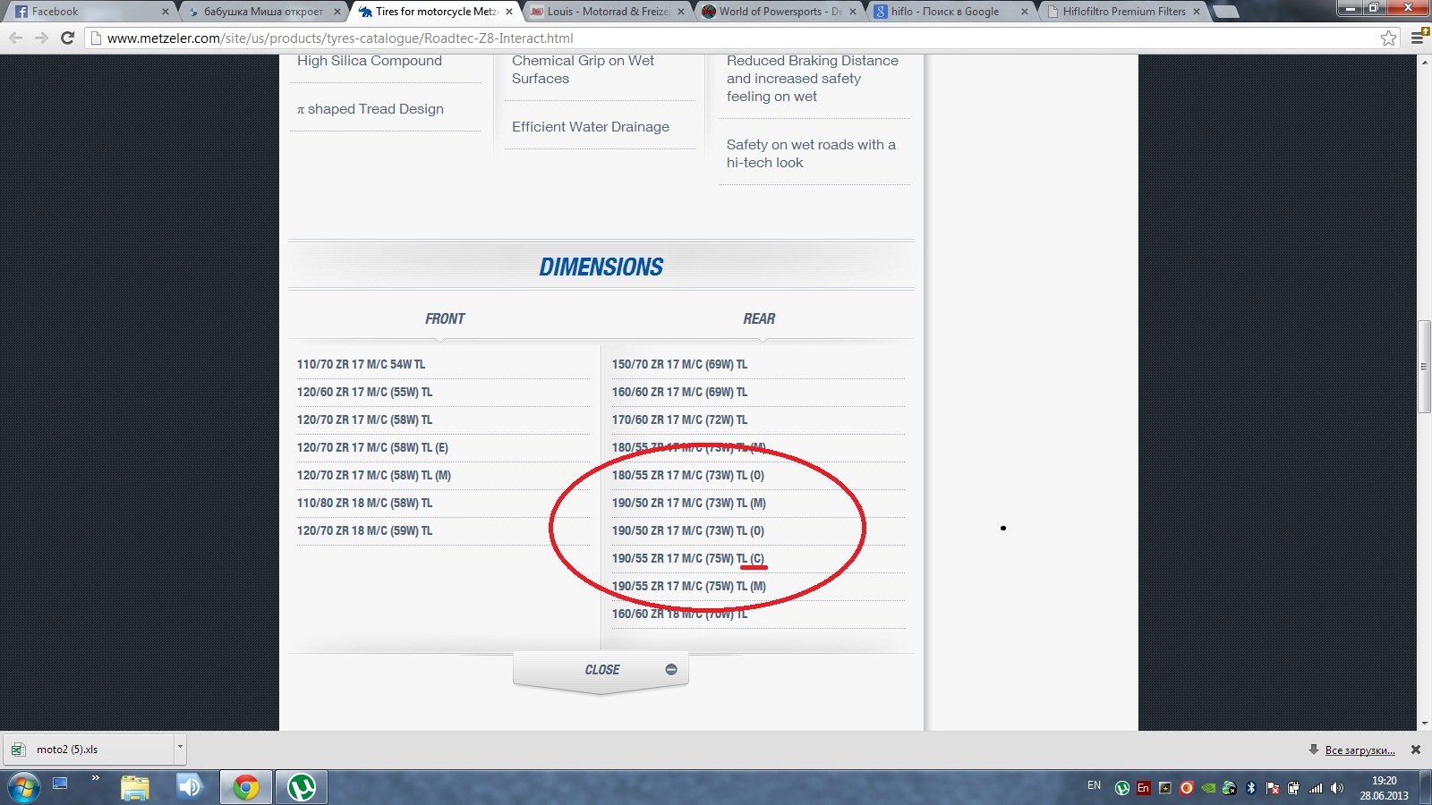 Действительно, в линейке Metzeler в группе Roadtec Z8 в размере 190/55-17, имеется баллон с дополнительными индексами M и С.